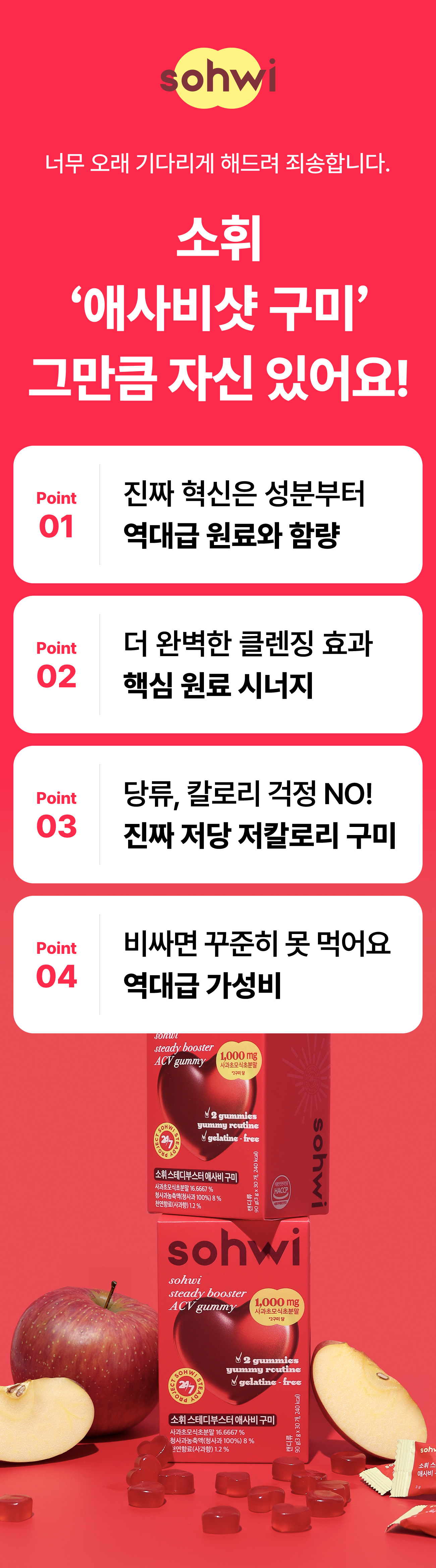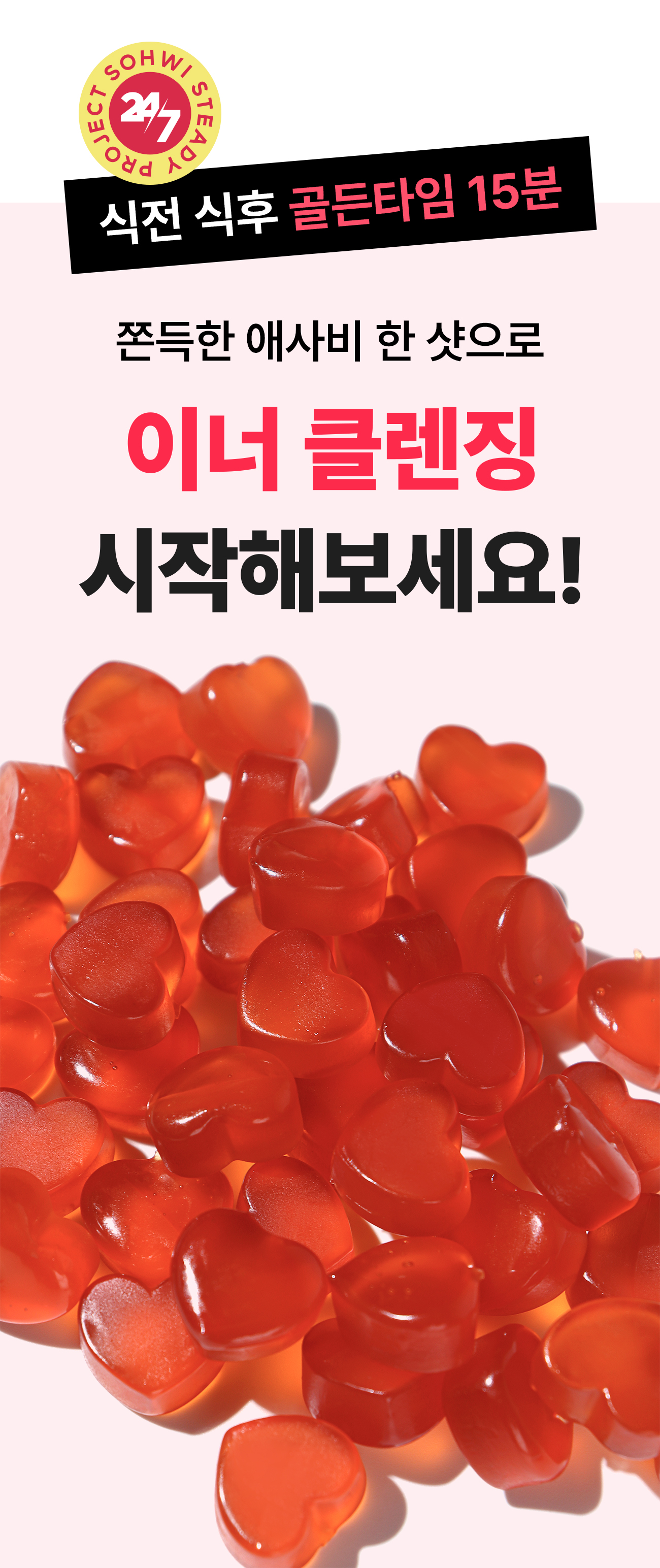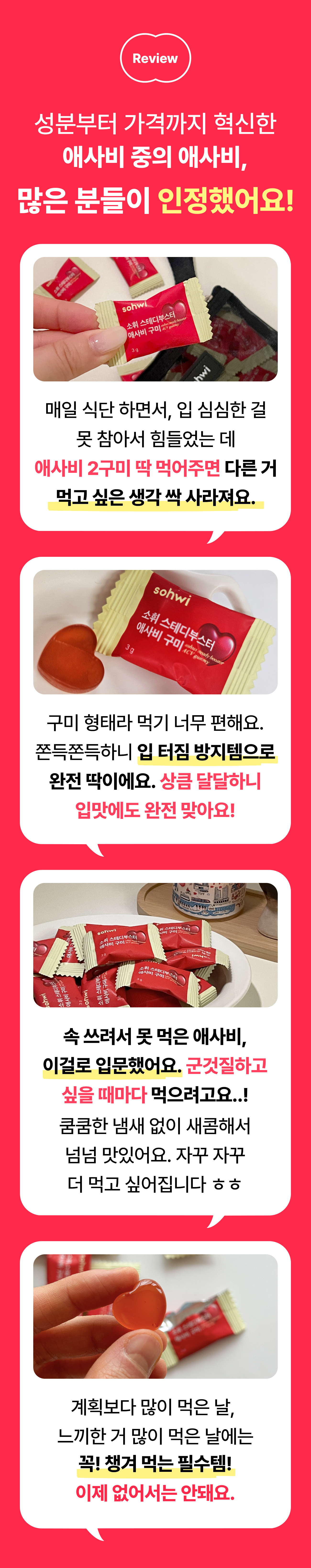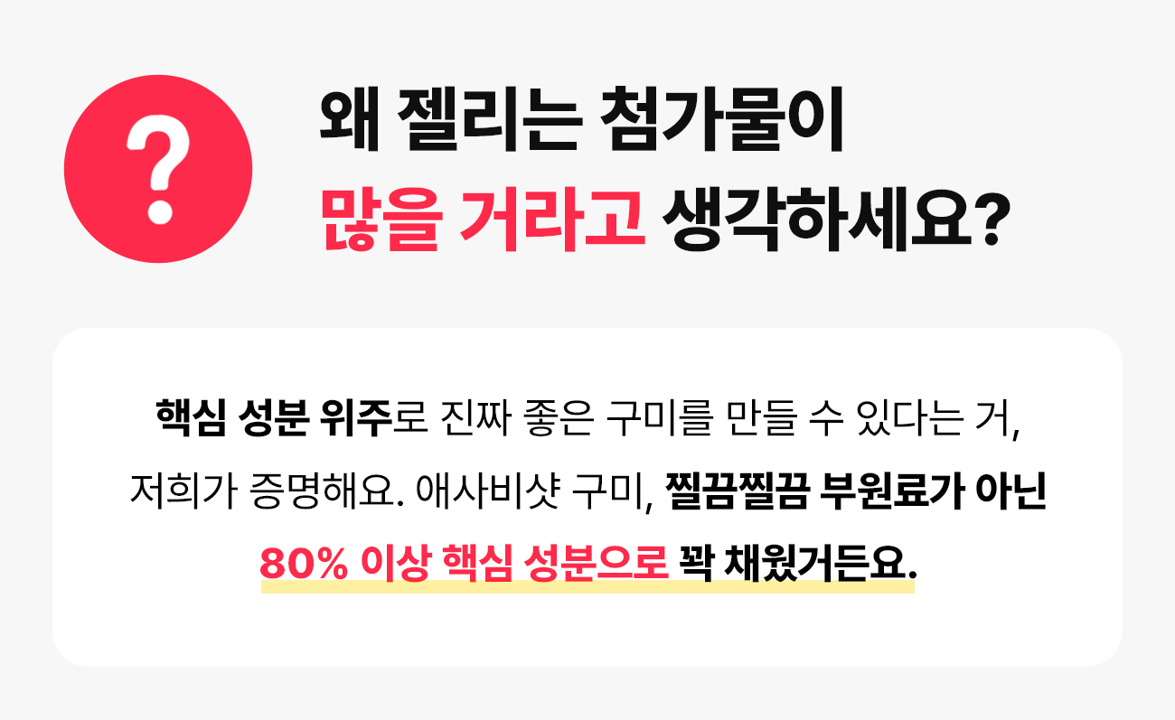 제품 개발자인 저는 건강을 엄청 생각해서 액상 과당, 배달음식은 거의 먹지 않아요. 클렌즈 워터, 음식도 직접 만들어 먹죠. 근데 딱 하나 포기 못하겠는 게 젤리예요. 어느 날 곰돌이 젤리를 맛있게 먹다가 이런 생각이 들더라구요 . '좋은 거 백날 해먹으면서, 이렇게 맨날 젤리를 먹으면 무슨 의미가 있을까' 정말 단순하게 이렇게 시작했어요. 구미를 맛있고 건강하게 만들어 보자.