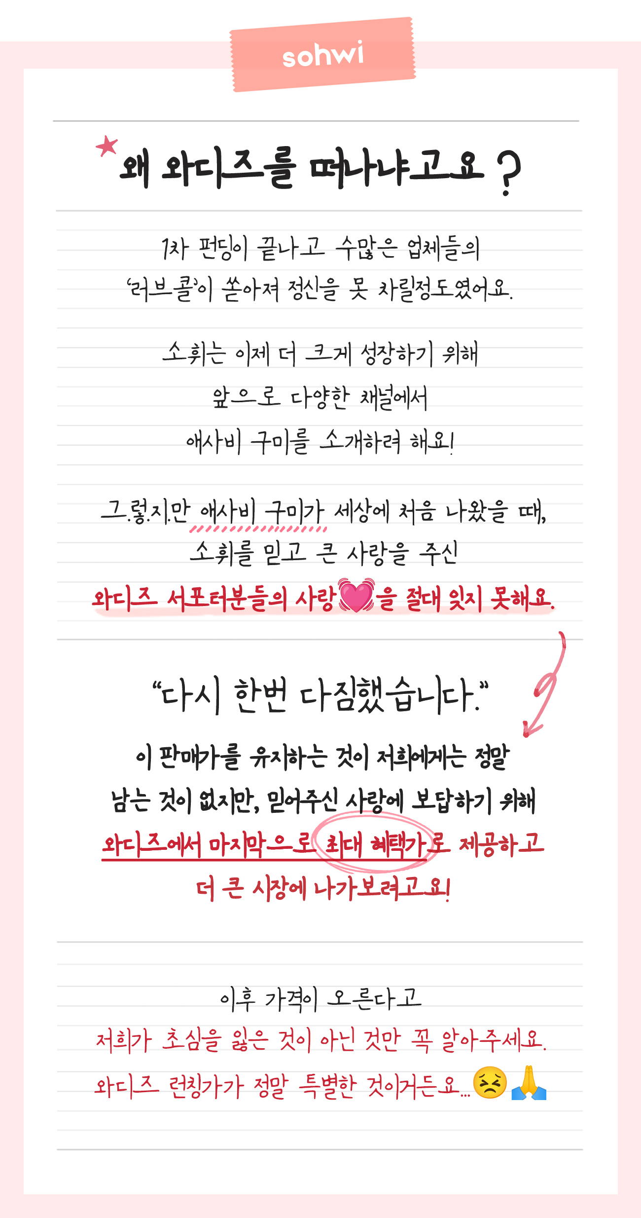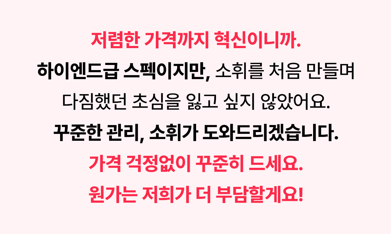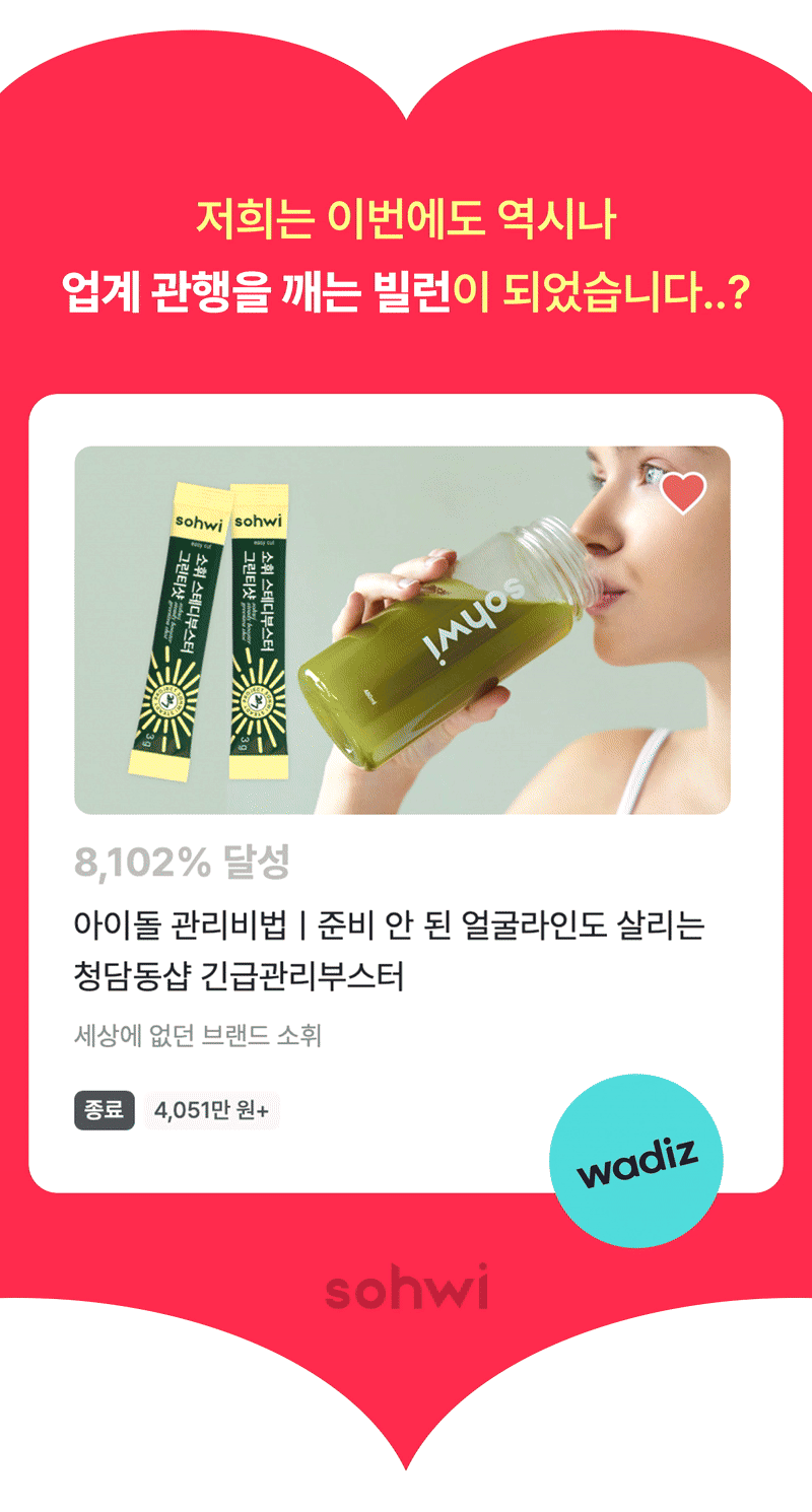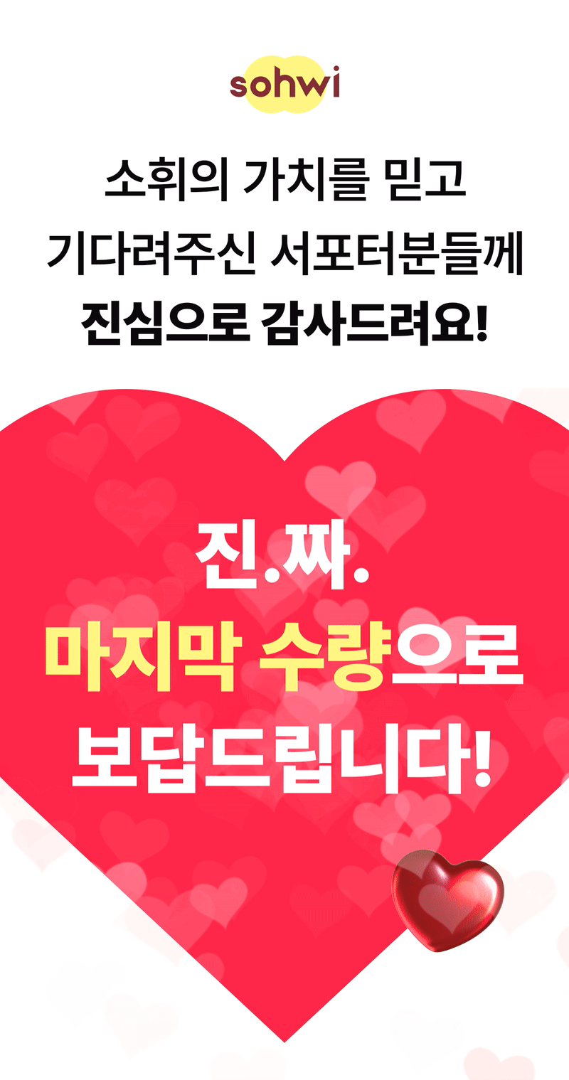 깨달았어요. 제 브랜드에 대한 자부심이 저를 다시 일으켜 세웠습니다. 세상에 없던 브랜드, 소휘는 이렇게 지난한 과정을 거쳐 서포터님들께 선보이게 됐습니다. 잘 부탁드립니다!