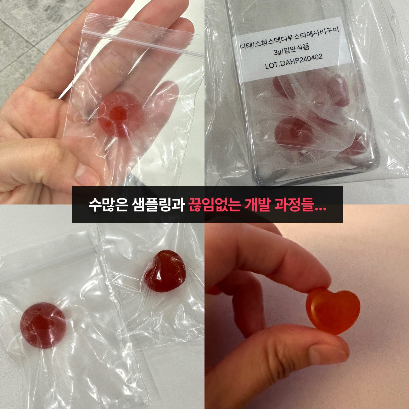 제품을 준비한지 1년 가까이 보내면서, 다양한 원료와 제형으로 샘플링을 했어요.맛이 부족하던가, 효과가 부족하던가… 무언가 계속 애매한 샘플만이 와서 혼동이 오더라구요. 시간은 지나고.. 만족스러운 제품이 나오지 않으니 제조원에도 너무 죄송했어요. 하지만 그렇다고 해서 절대 타협하고 싶지는 않았어요.