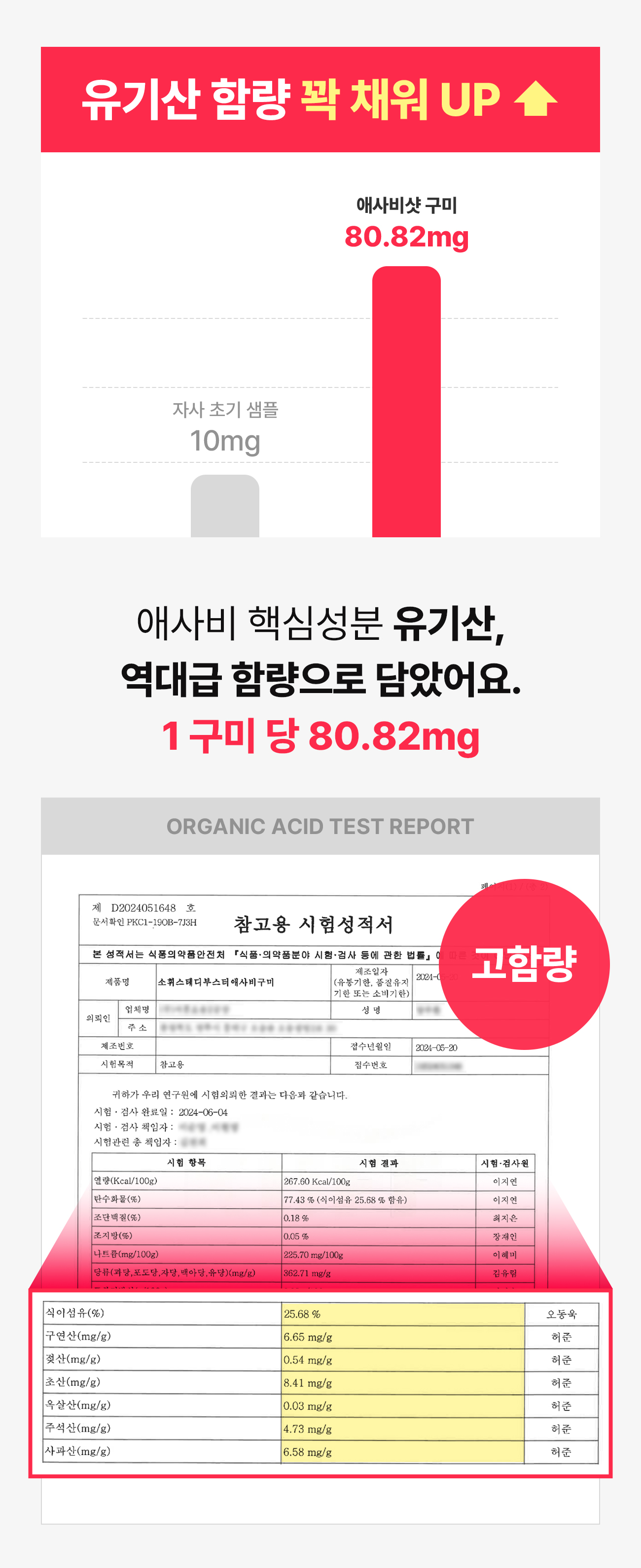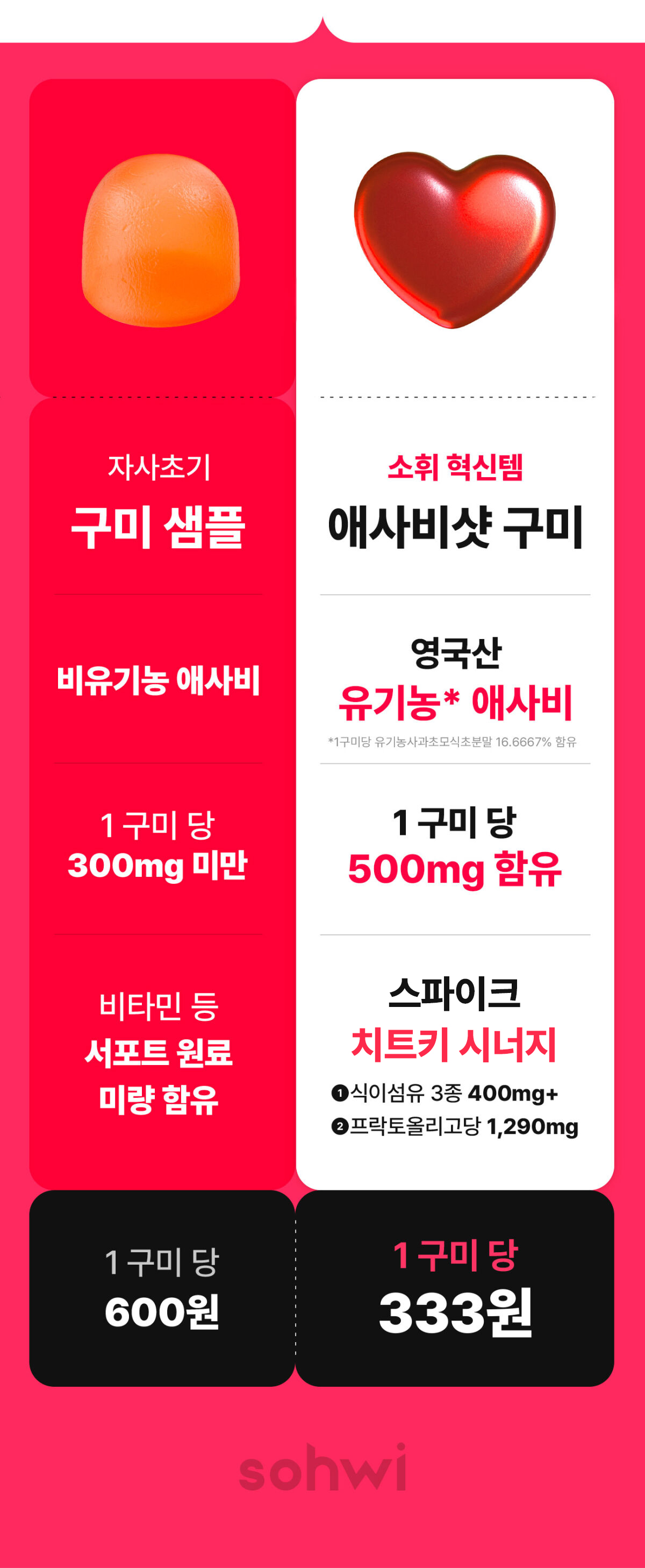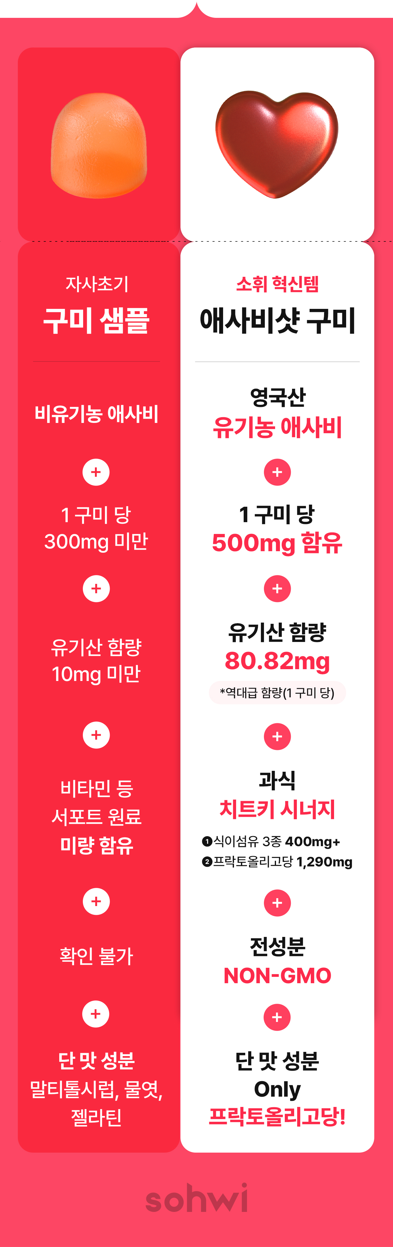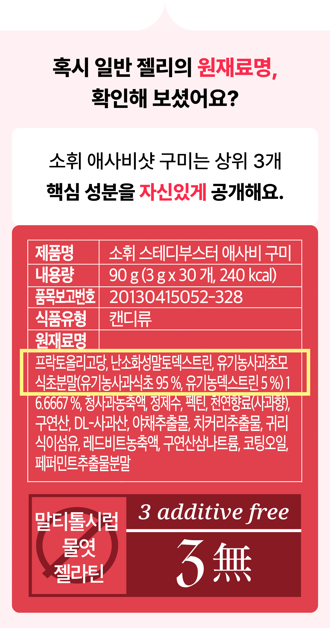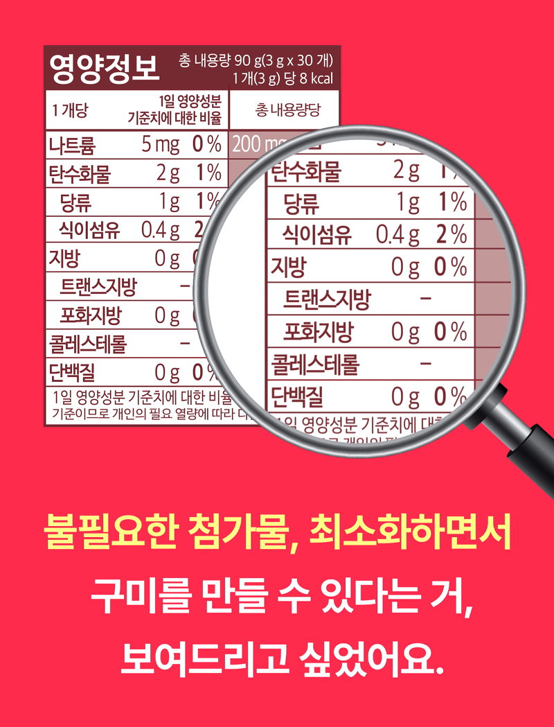 당류 0g 구미, 정말 만들고 싶었지만 첨가물을 넣는 방법뿐이더라고요. 눈속임 저당 제품을 만들 수는 없어서,당류 0g을 만들지는 못해도 좋은 성분을 넣었습니다. 부끄러운 성분은 최대한 지양했어요.