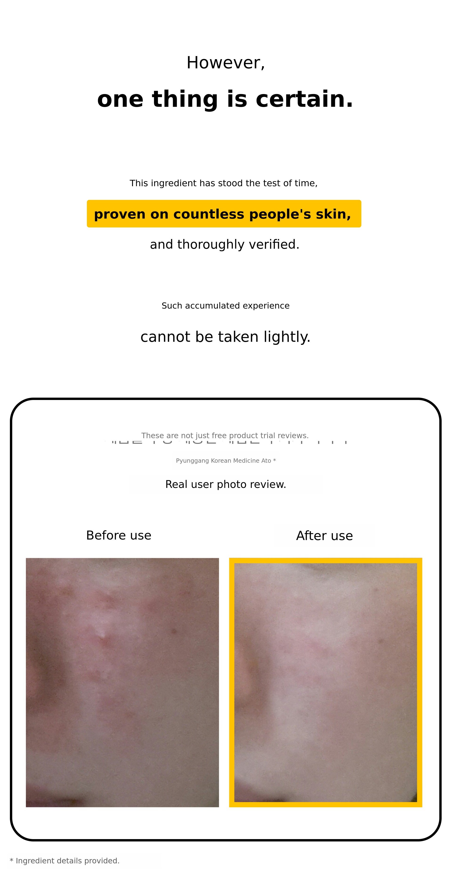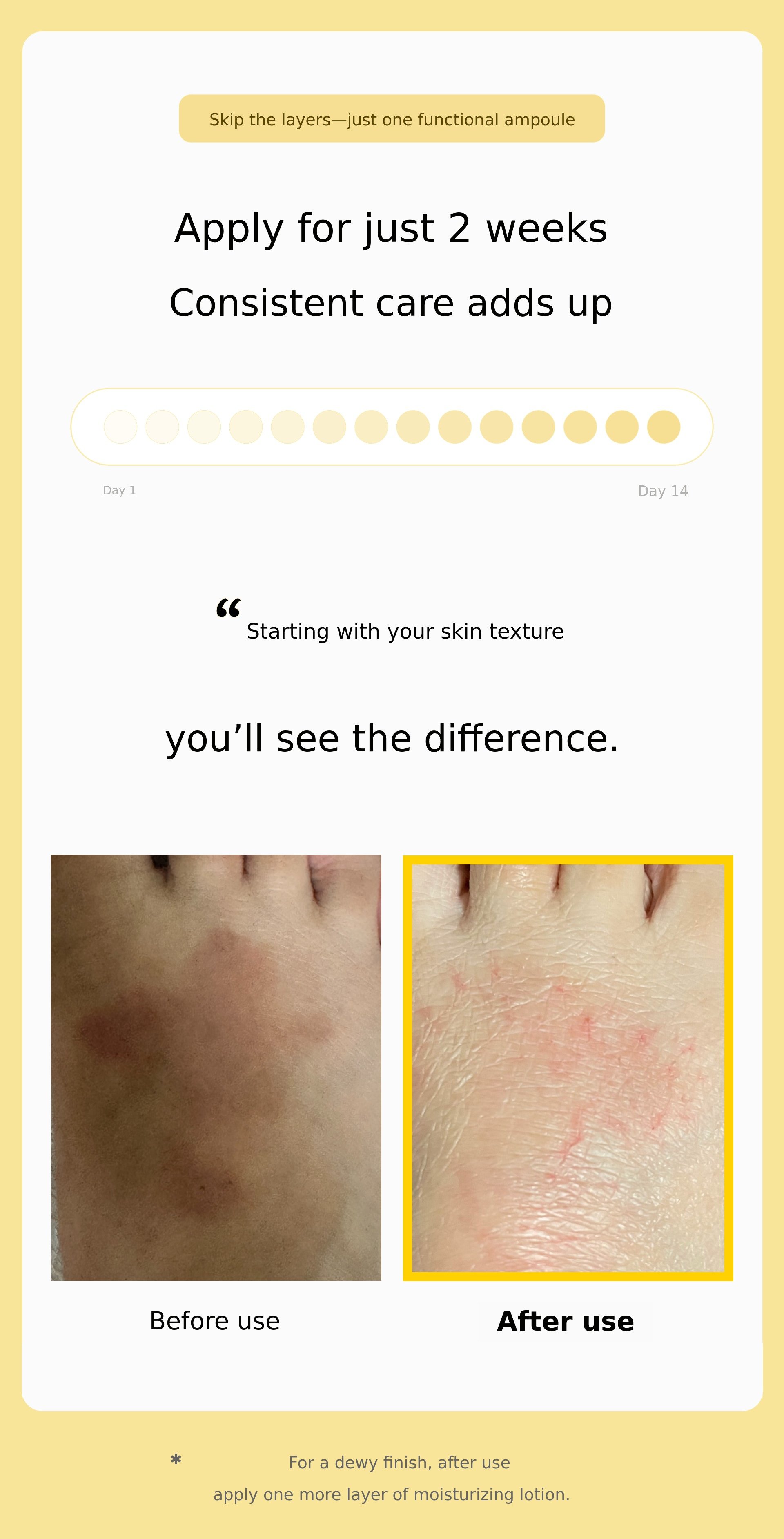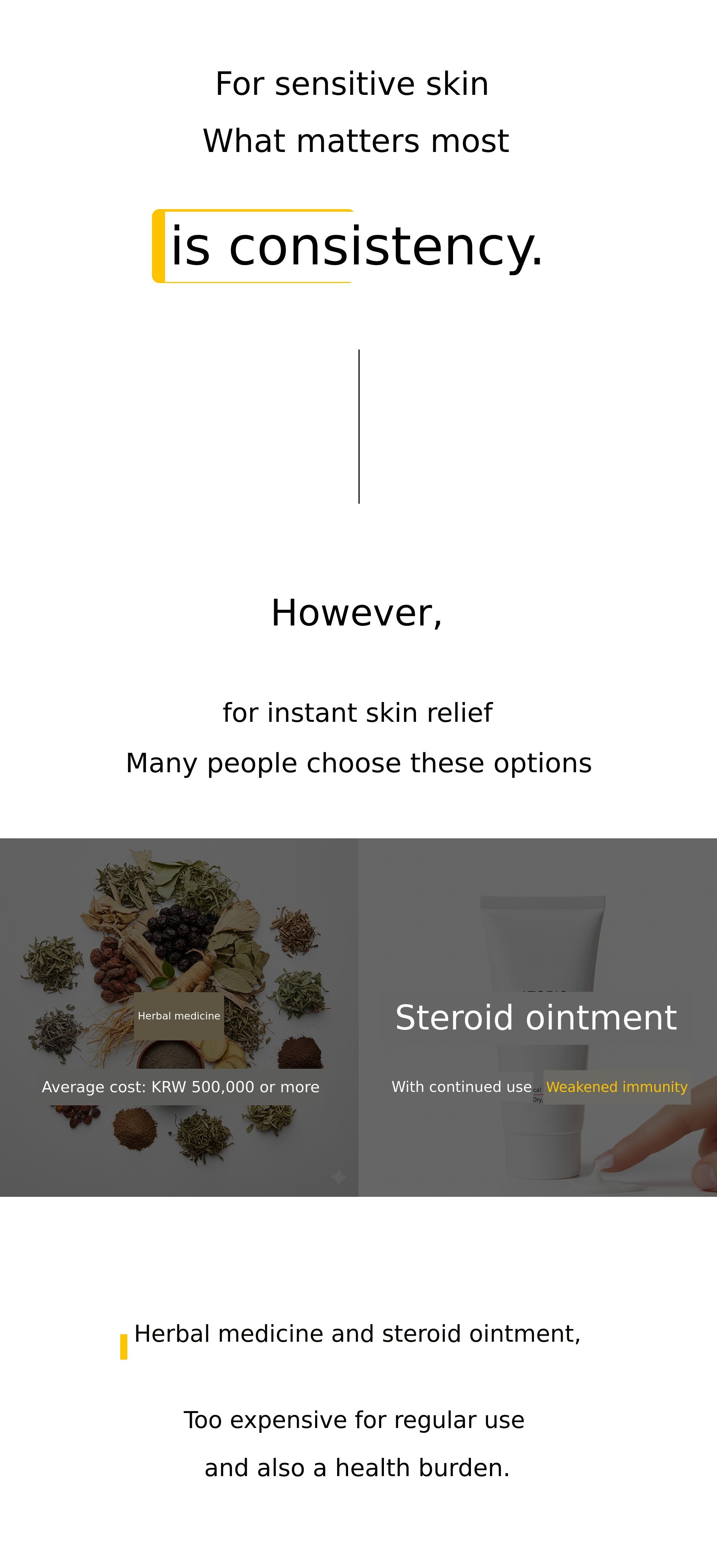 - Since childhood, there were times when I had to endure daily life with difficulty due to skin problems. Then, after discovering truly good ingredients, I was able to regain the peaceful daily life I had forgotten. That experience led me to think, 'It would be a waste to use this ingredient only for myself,' and I wanted to share it with others who have similar concerns. After much consideration on how to make it accessible to everyone, I developed an ampoule-type cosmetic that blends comfortably into daily life. This project started from my personal experience of recovery and carries the hope that it will lead to peaceful days for many more people.