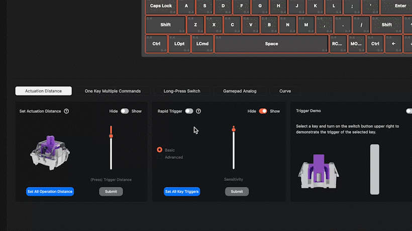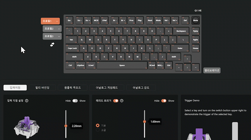 0.1mm 단위로 각각의 키에 작동 지점을 설정해보세요.