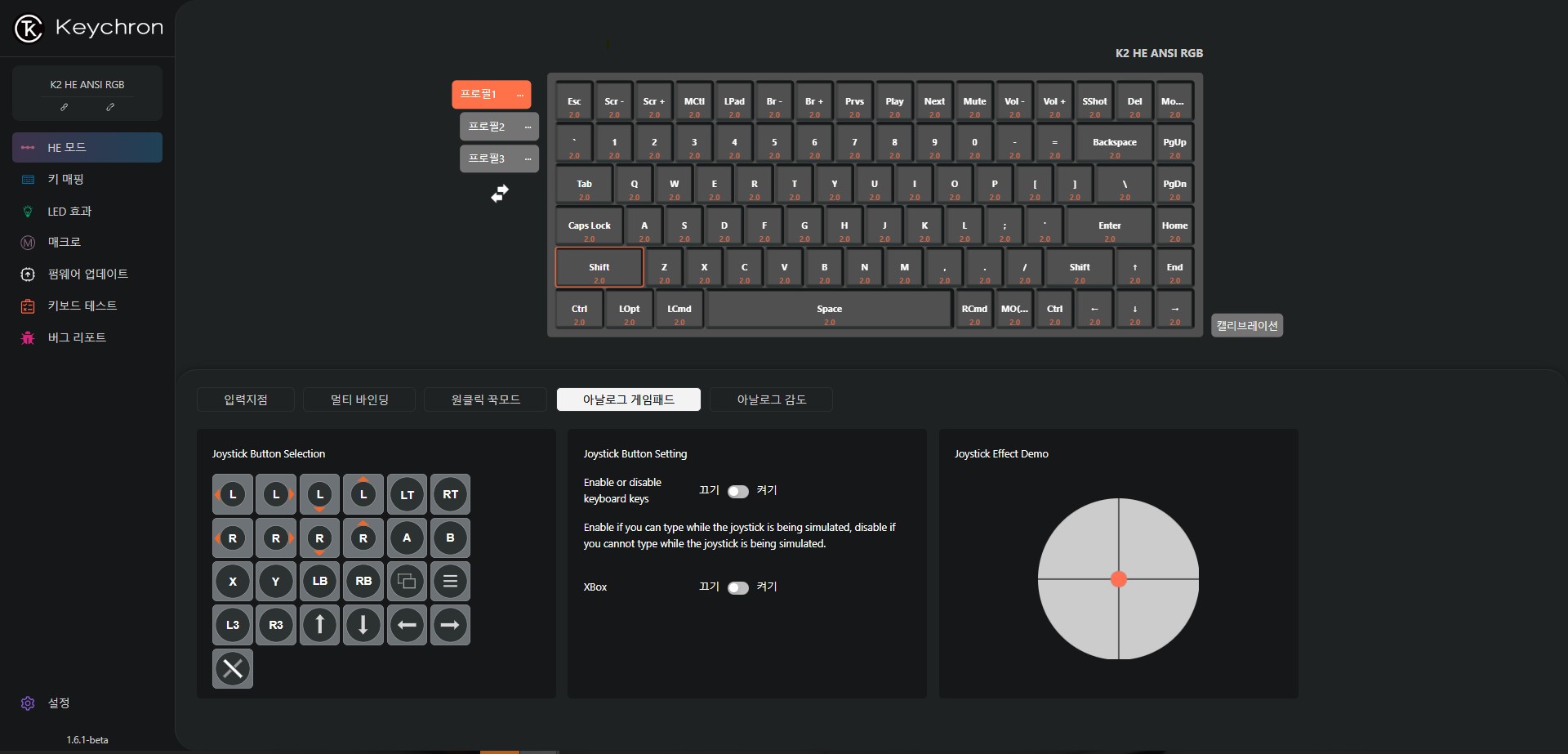 K2 HE 키보드의 아날로그 임패드 모드를 활성화를 시키면 콘솔패드처럼 키보드를 사용할 수 있습니다.