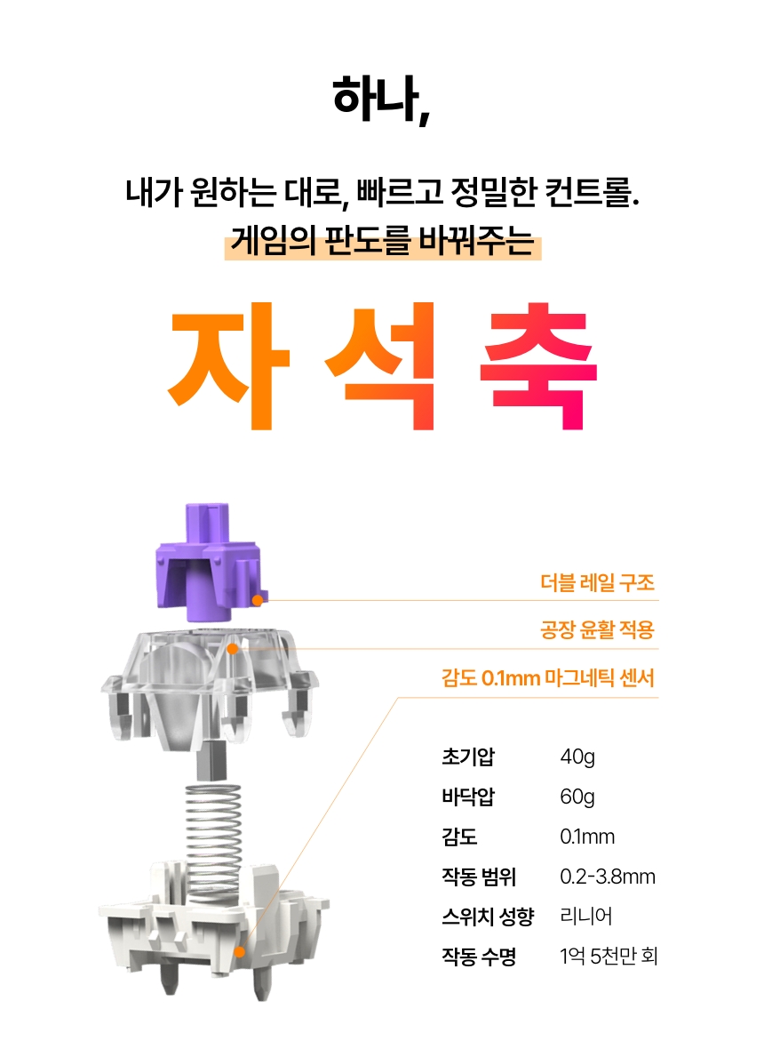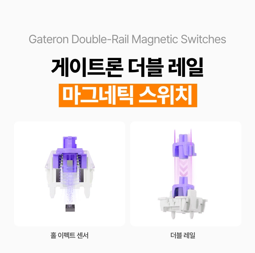 K2 HE의 게이트론 더블 레일 마그네틱 스위치는 홀 이펙트 센서를 통해 게임패드와 같이 섬세한 아날로그 인식을 받을 수 있습니다. 처음 손길이 닿은 순간부터 바닥에 닿을 때까지 일정하게 부드러운 느낌으로 더 정밀하고 빠르게 인식되며 마모와 입자에 강한 내구성으로 오랜 시간 사용할 수 있습니다.