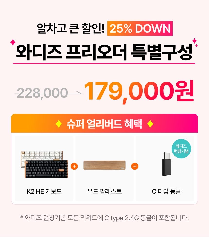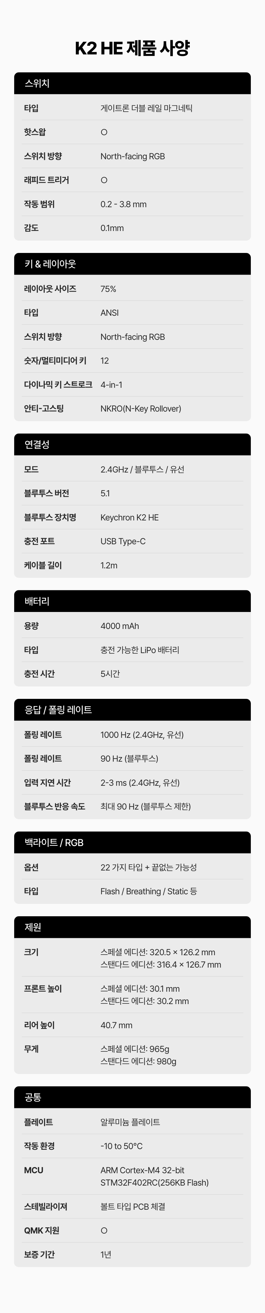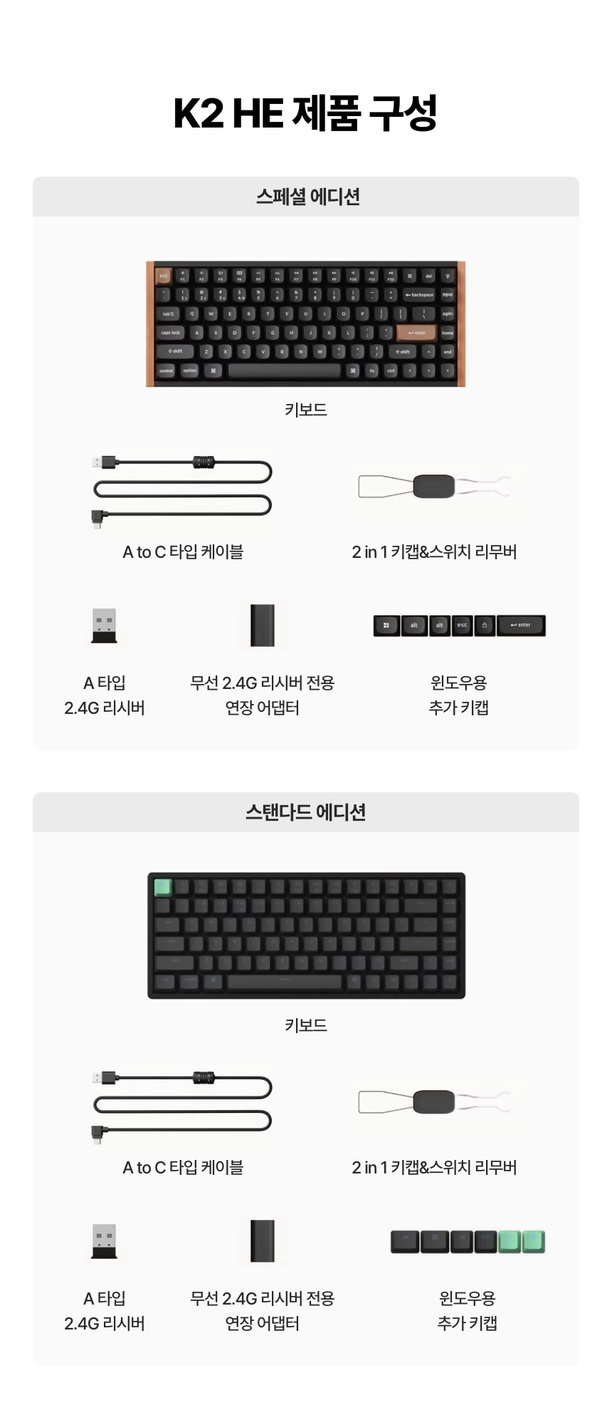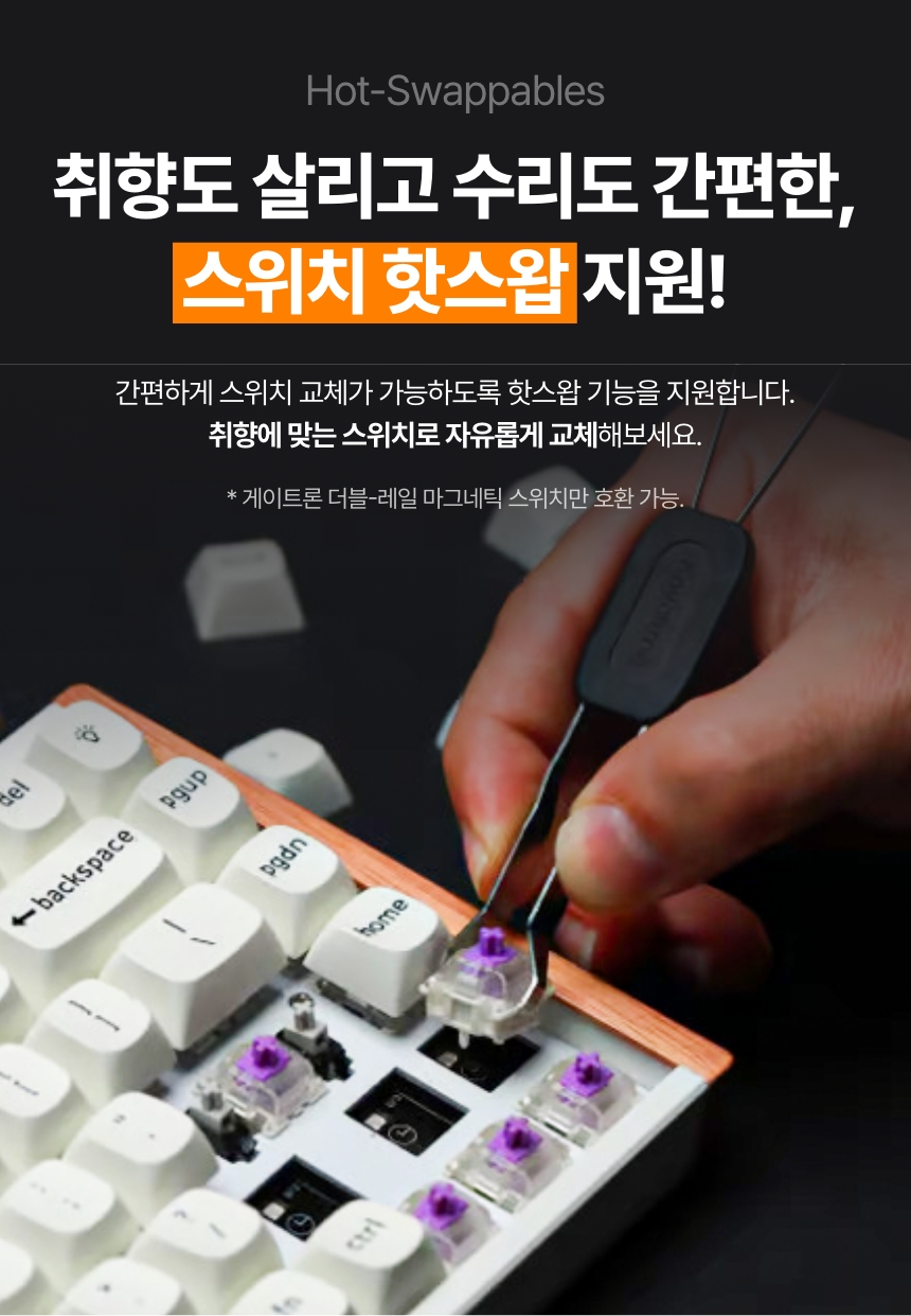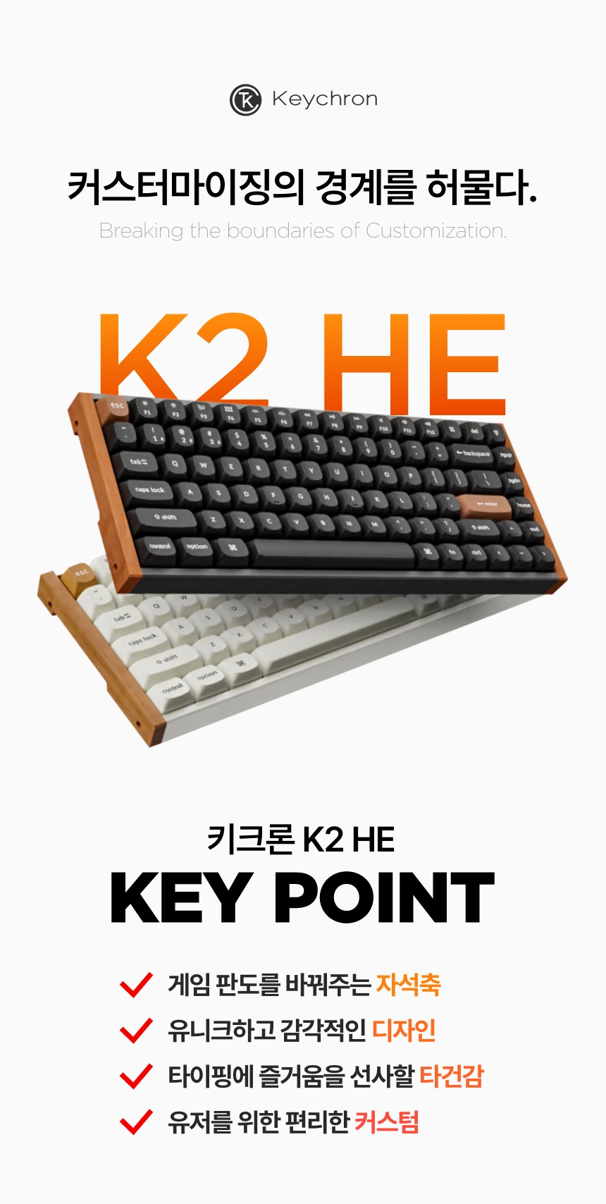 키크론 K2 HE 모델은, 키크론의 많은 사랑을 받았던 K2 모델의 마그네틱 스위치 버전으로, 이전에 없었던 우드 프레임 디자인과 흡음구조의 추가로 타이핑 경험을 개선하고, 키크론 웹 런처가 지원되면서 키보드의 다양한 편의 기능을 손쉽게 다룰 수 있게 되면서 커스터마이징 키보드의 접근성을 확 높였습니다.