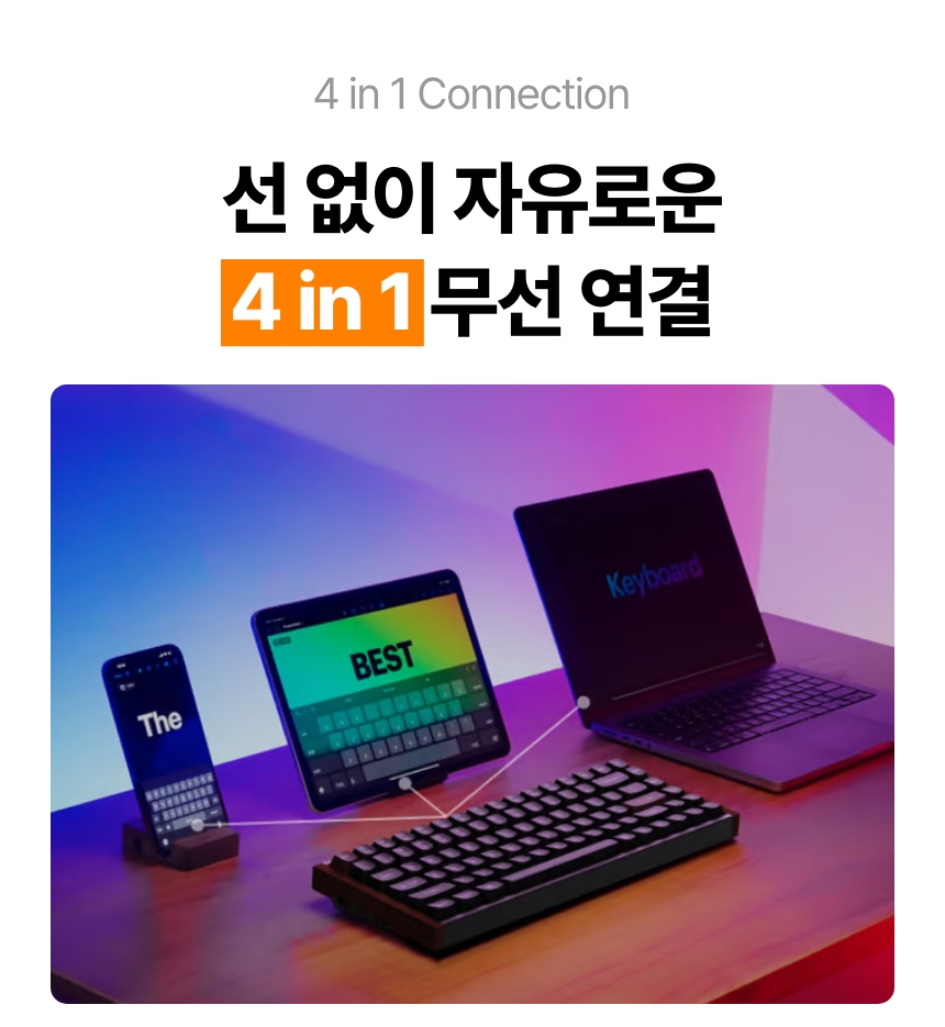 동시 입력이 당연했던 유선을 넘어 무선 블루투스 환경에서도 동시에 누른 키가 모두 입력되는 자유로운 무한 동시 입력을 느껴보세요.