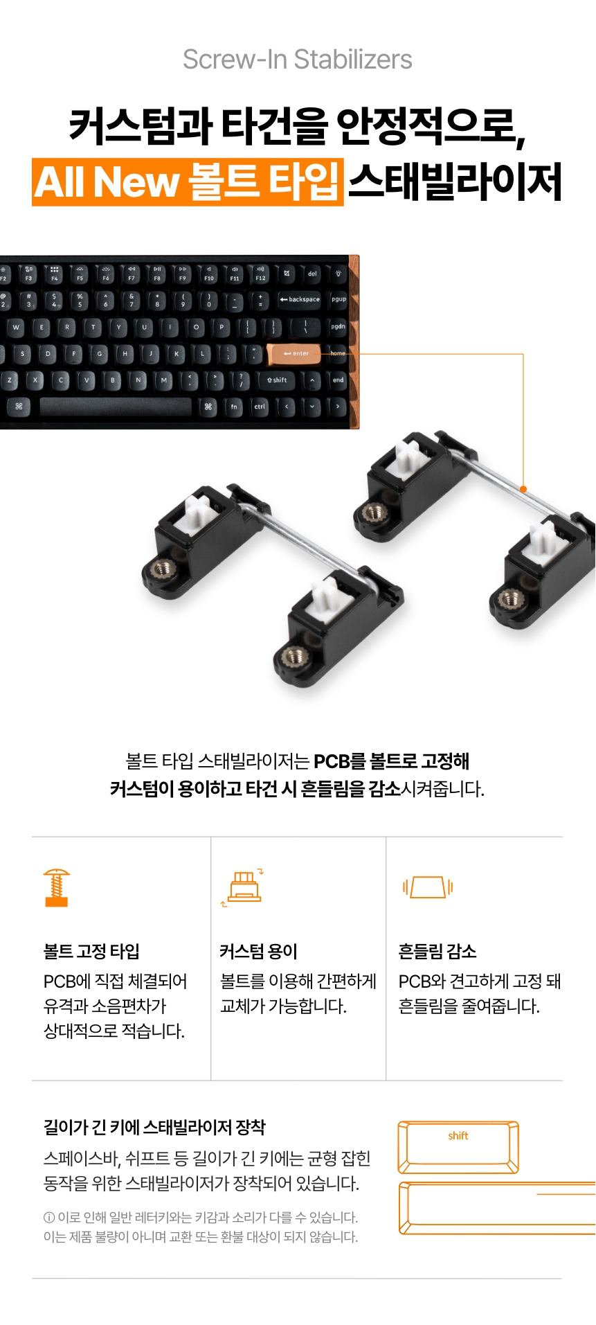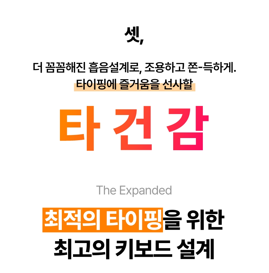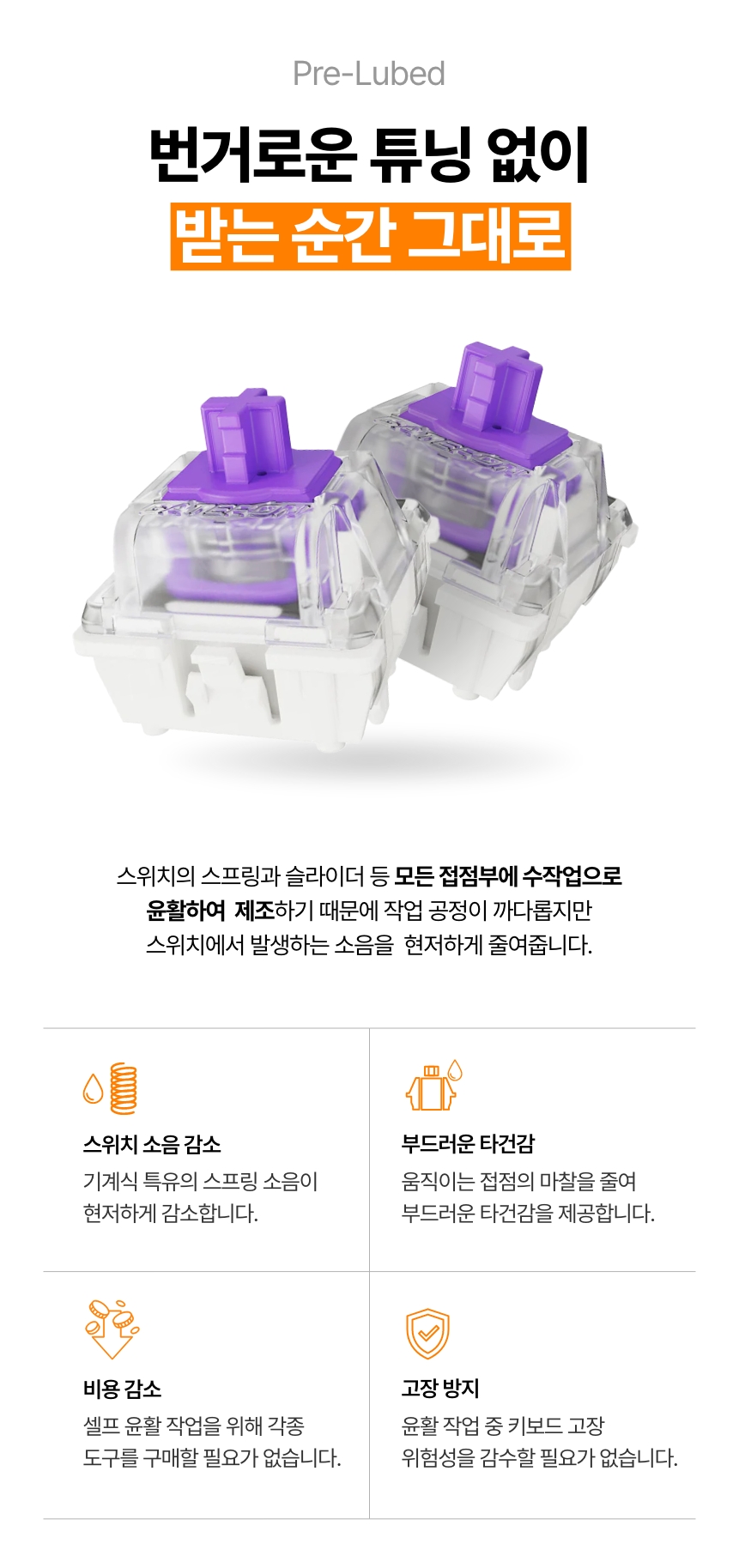 정밀하게 설계 된 키크론 K2 HE 만의 4중 흡음구조(실리콘 패드, EPDM 폼, PET 필름, EVA 폼)사전 윤활 된 스위치, PCB에 고정한 스테빌라이저를 통해서  조용하면서도 쫀득한 느낌의 피드백으로 타이핑에 즐거운 경험을 만들어 줍니다.