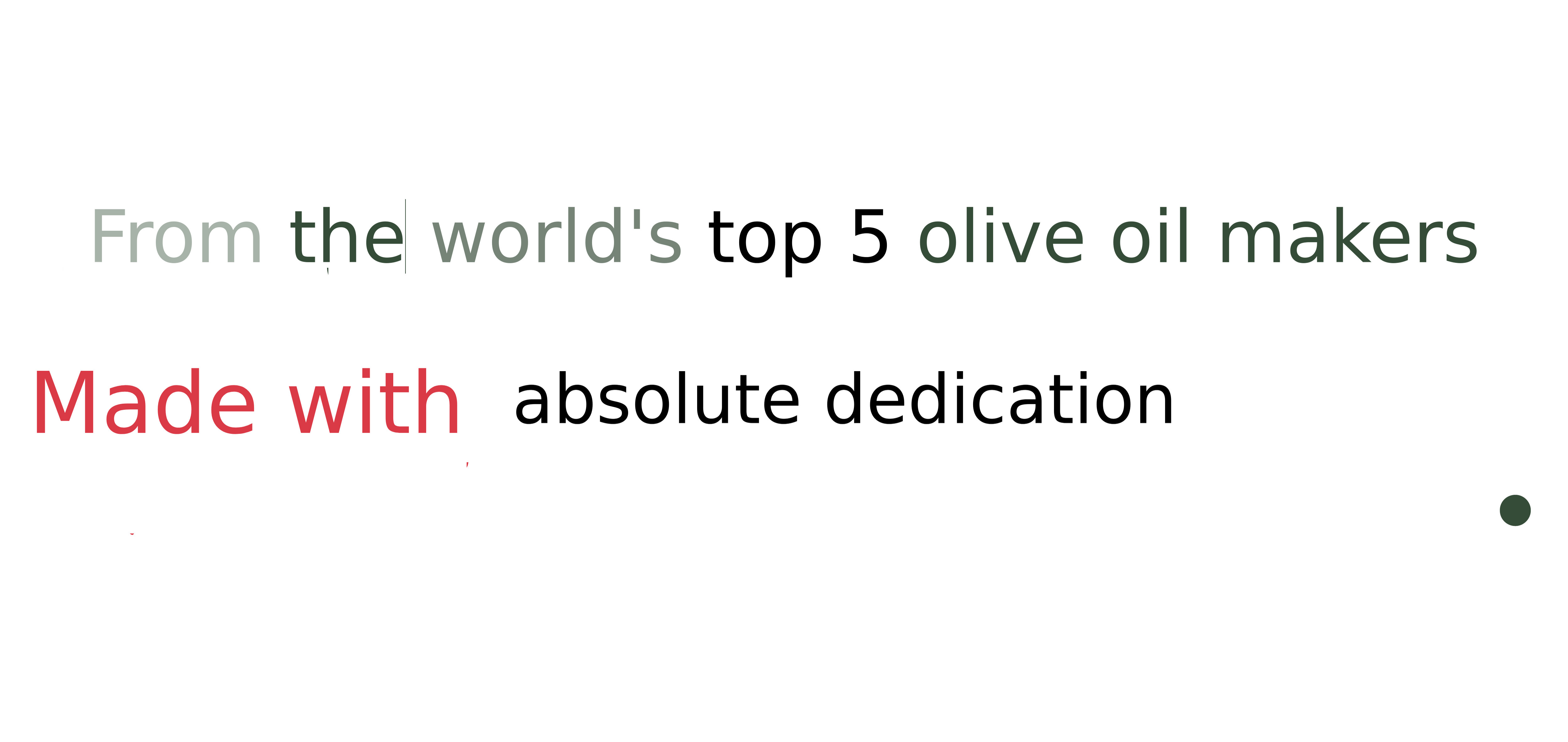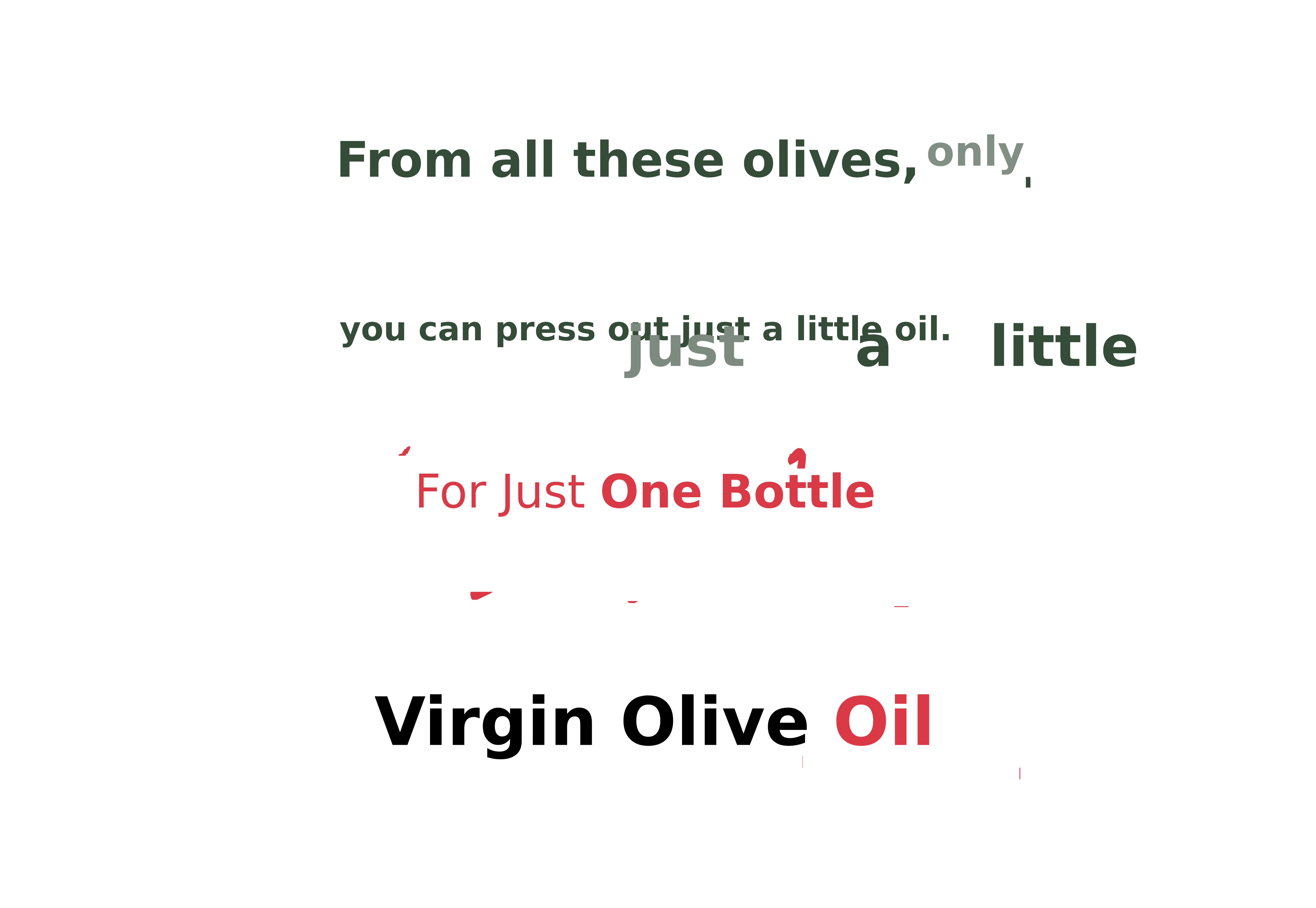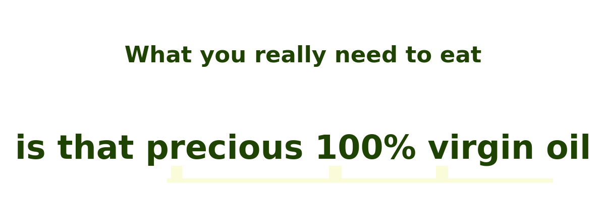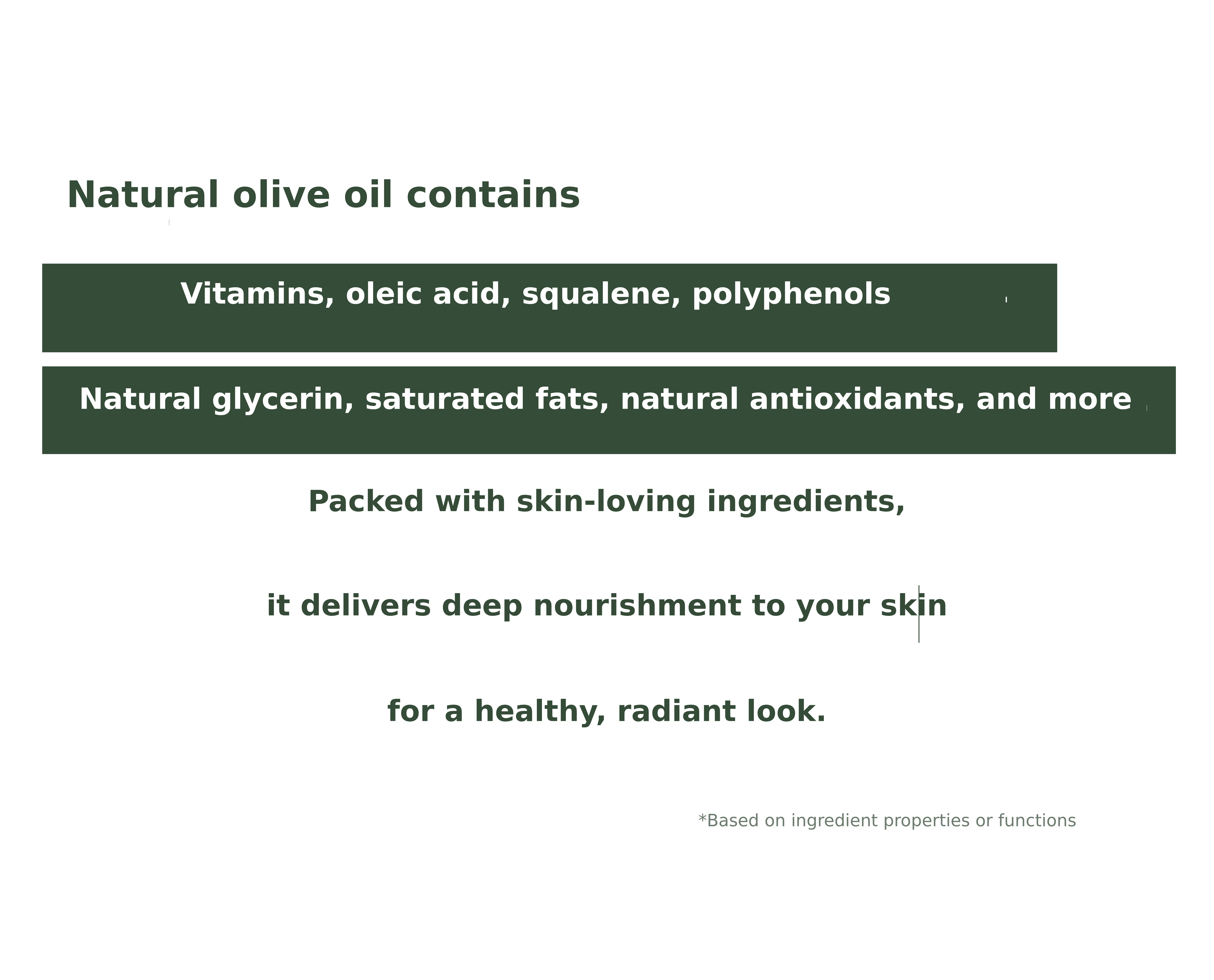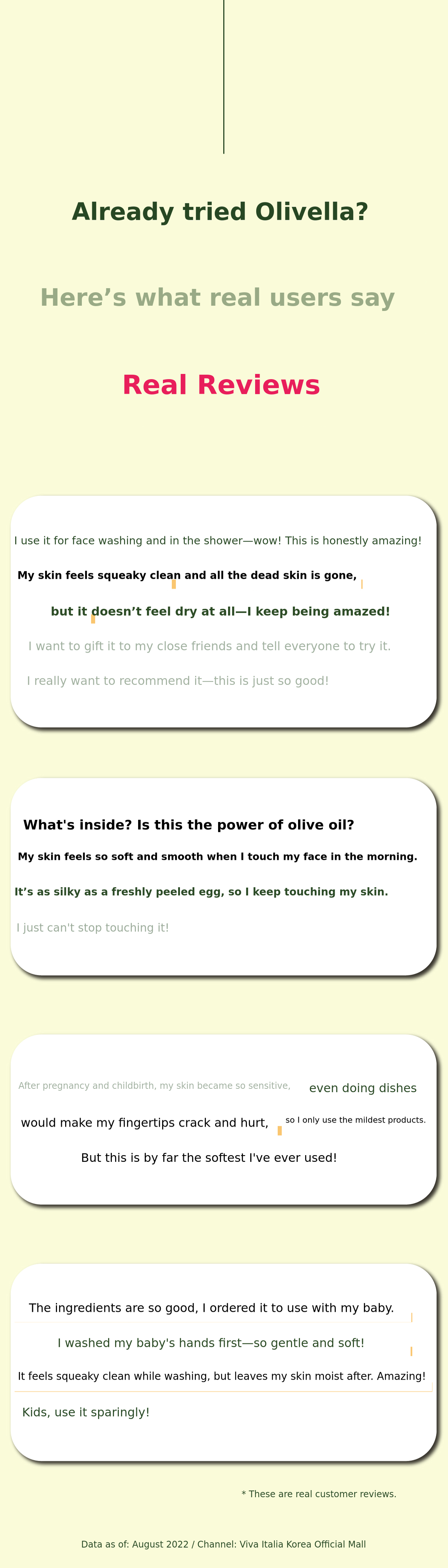 <THE ONE & ONLY 100% Virgin Olive Oil> This catchphrase holds a lot of meaning. The strength of Olivella products lies in the ingredients themselves.