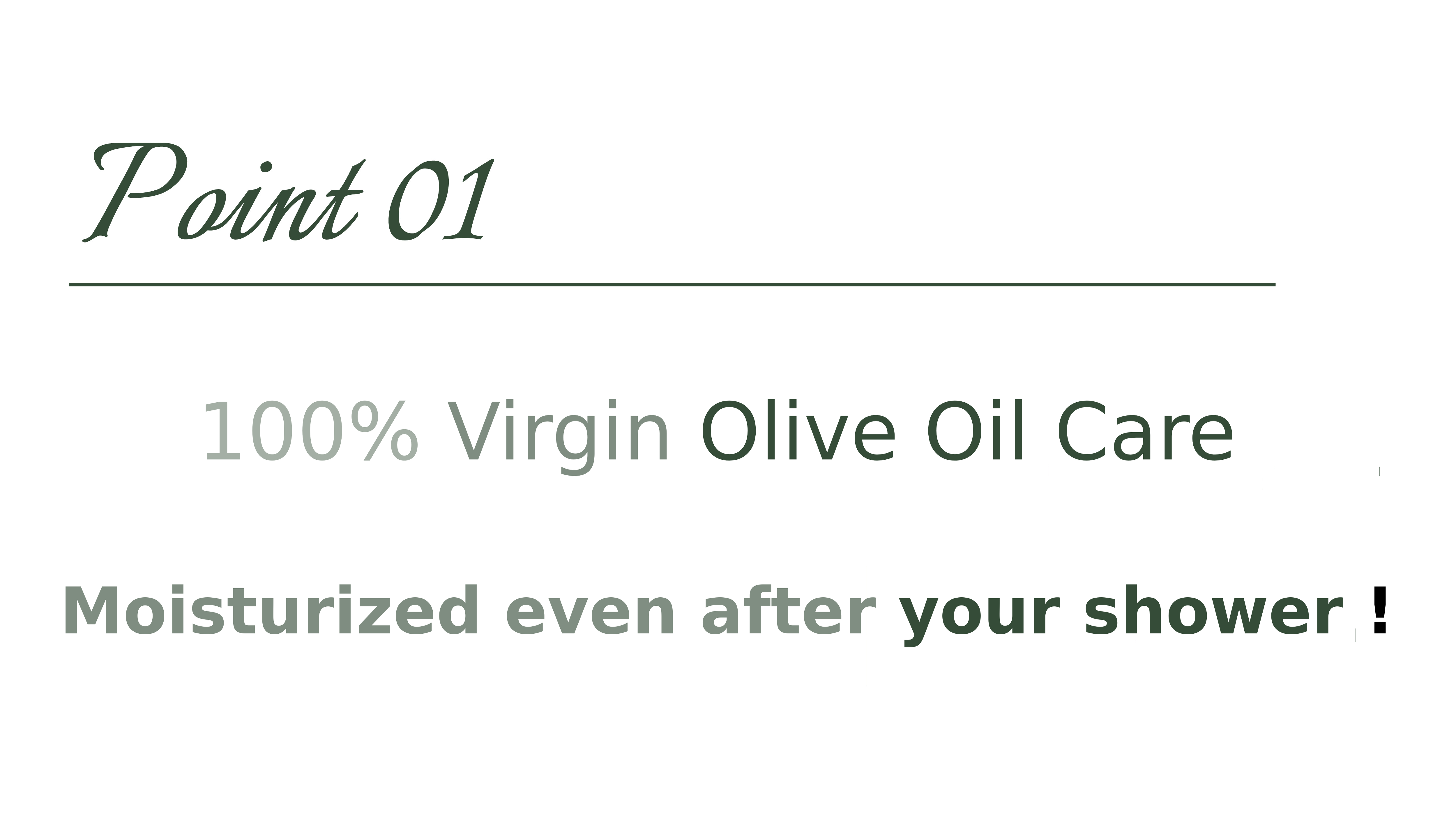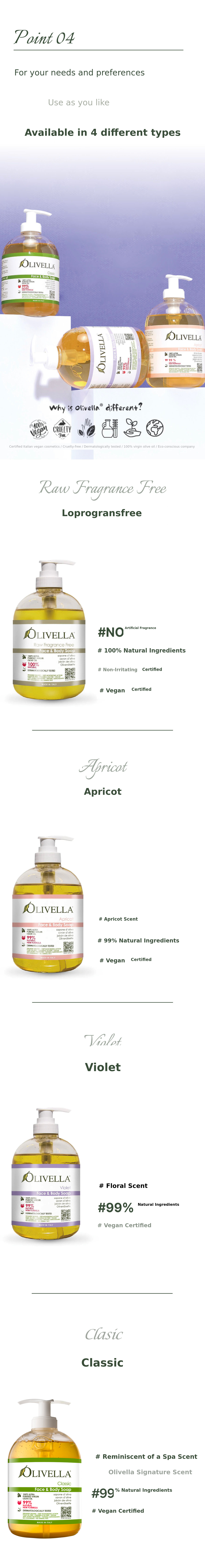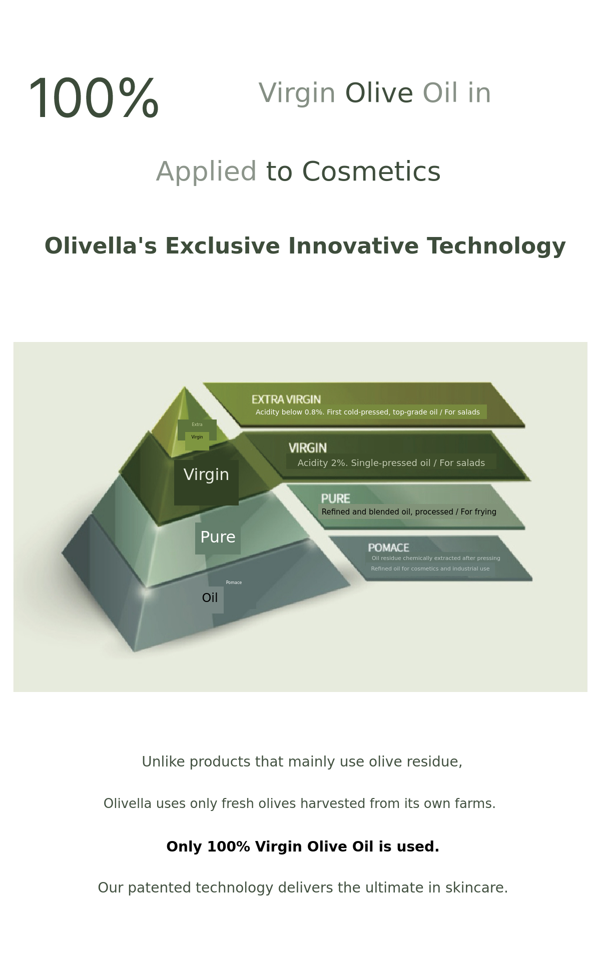 A. Olivella Face by Liquid Soap uses only 100% virgin olive oil, carefully selected through strict screening, under the motto 'The one & only 100% virgin olive oil.' We do not use lower-grade olive oil to reduce costs.