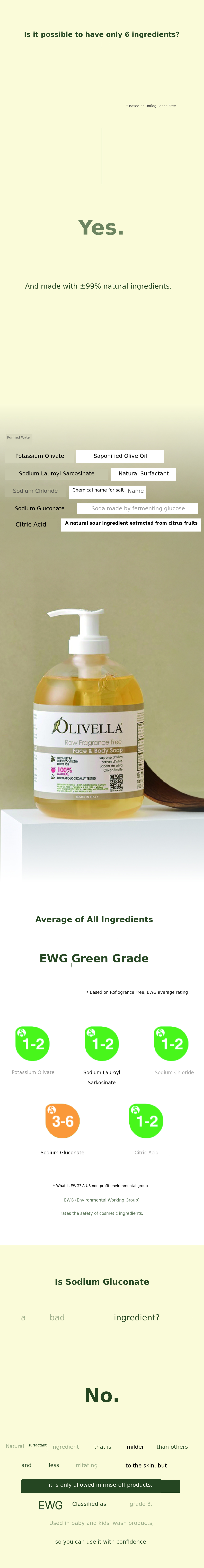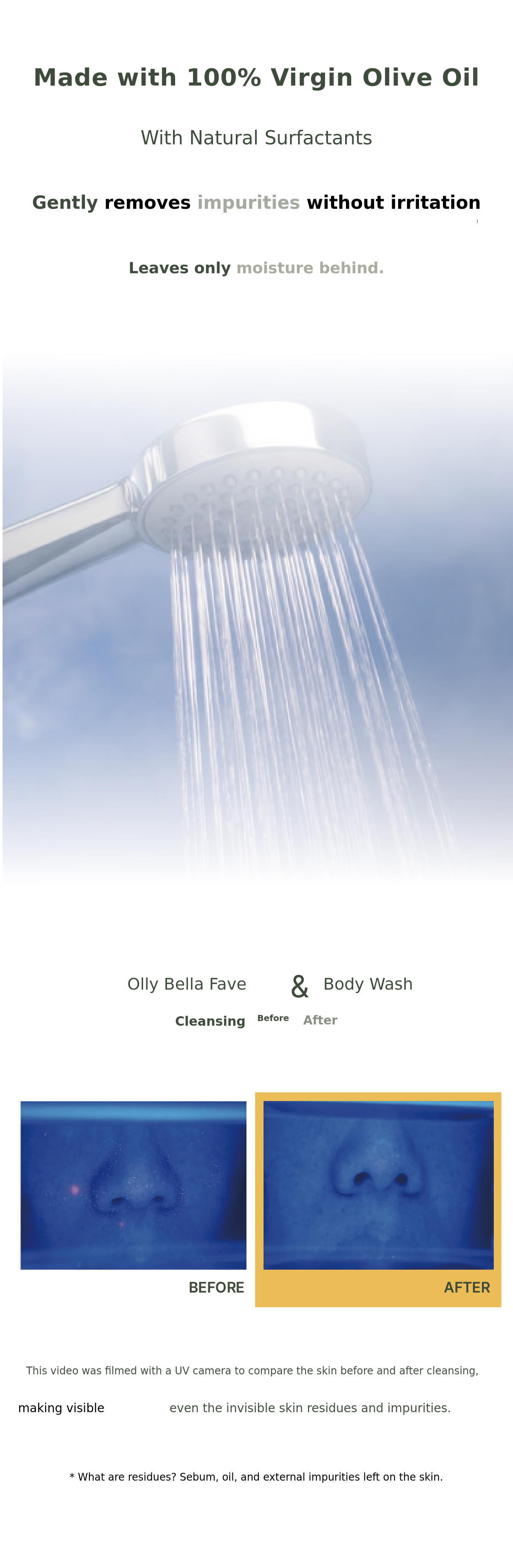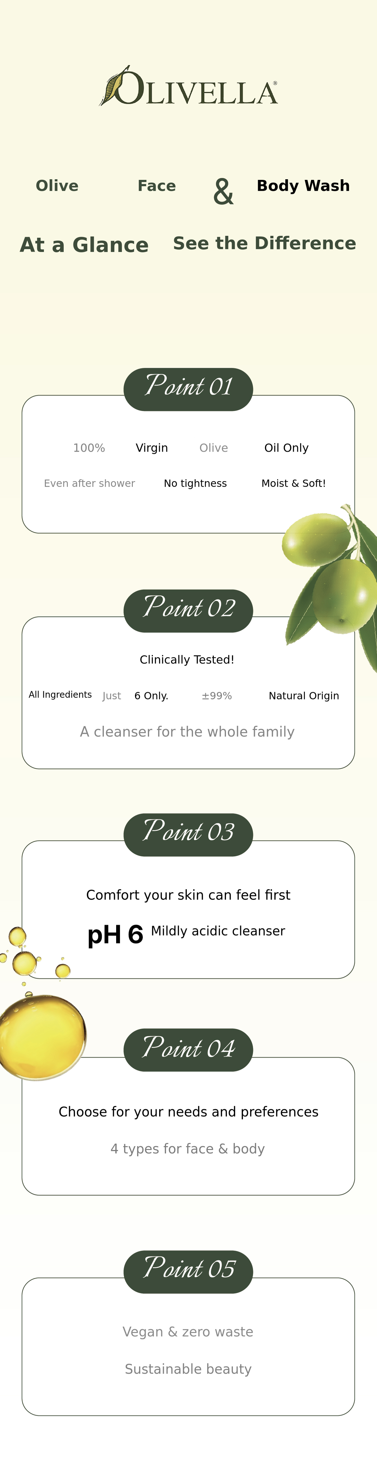 A. The main cleansing ingredient of Olivella is potassium olivate made from olive oil. With a mildly acidic pH, it reduces skin irritation.