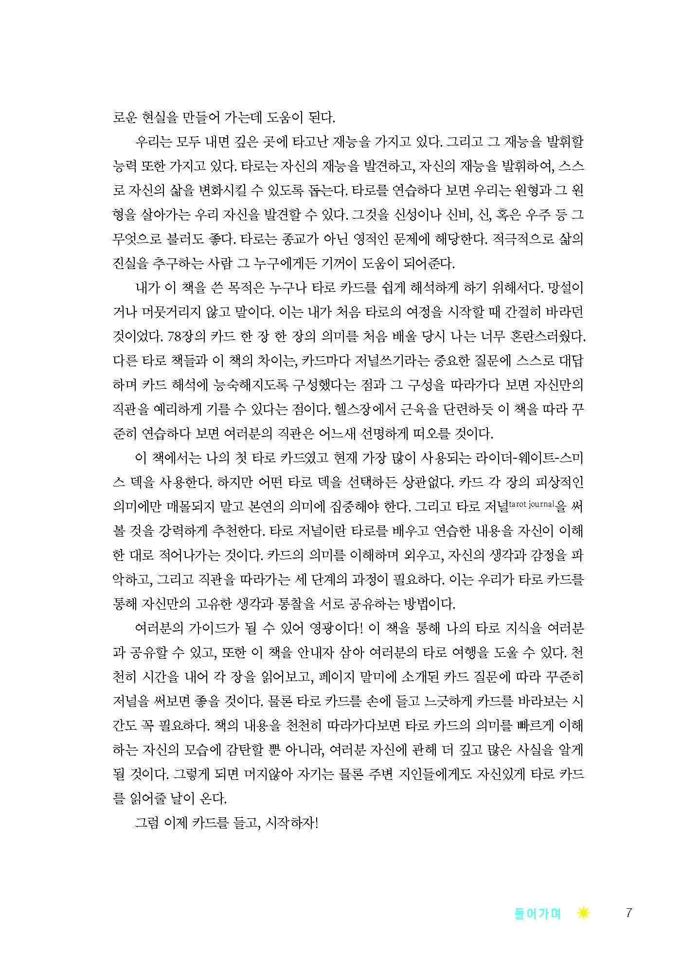 타로저널 PDF는 78장의 카드 의미를 직관적으로 파악하고 각 카드별로 주어진 질문에 답함으로써 자신의 내면을 반추할 수 있는 소책자 PDF입니다.