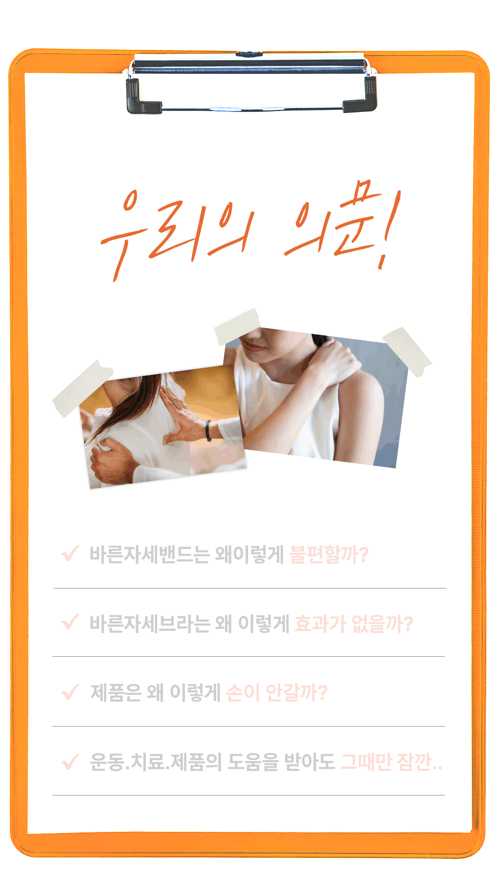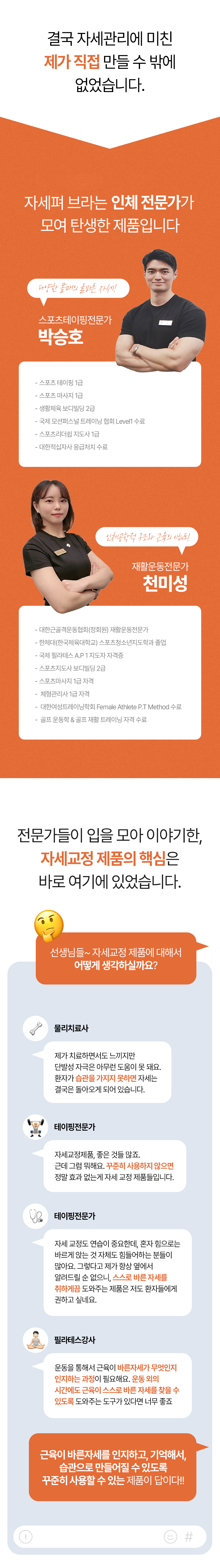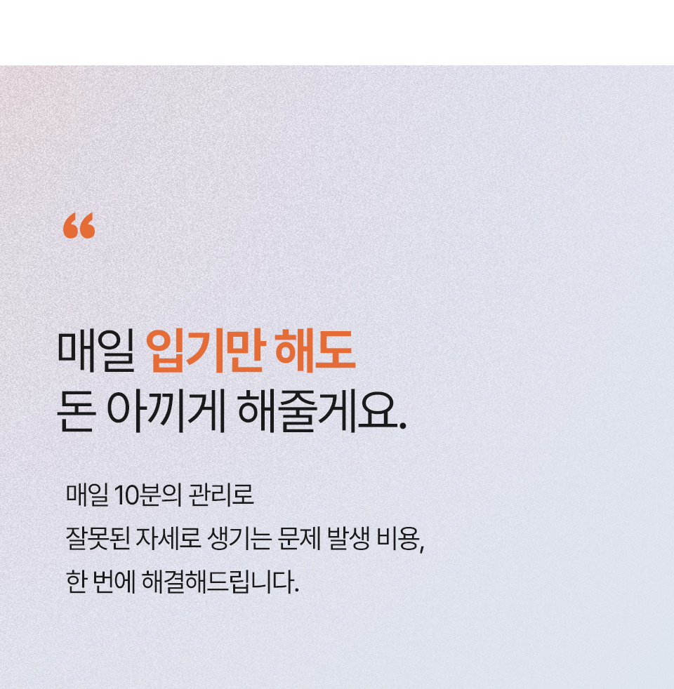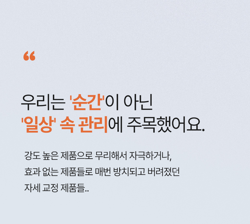 자세건강을 위해서는 바른자세를 습관화하고 생활화하는 것이 가장 중요한데요! 이를 위해서 많은 사람들이 다양한 솔루션들을 찾지만 자세교정밴드의 불편함이나 운동, 치료와 같은 솔루션들의 높은 가격에 불만을 느꼈던 사람들을 위해 이 제품을 개발했습니다!