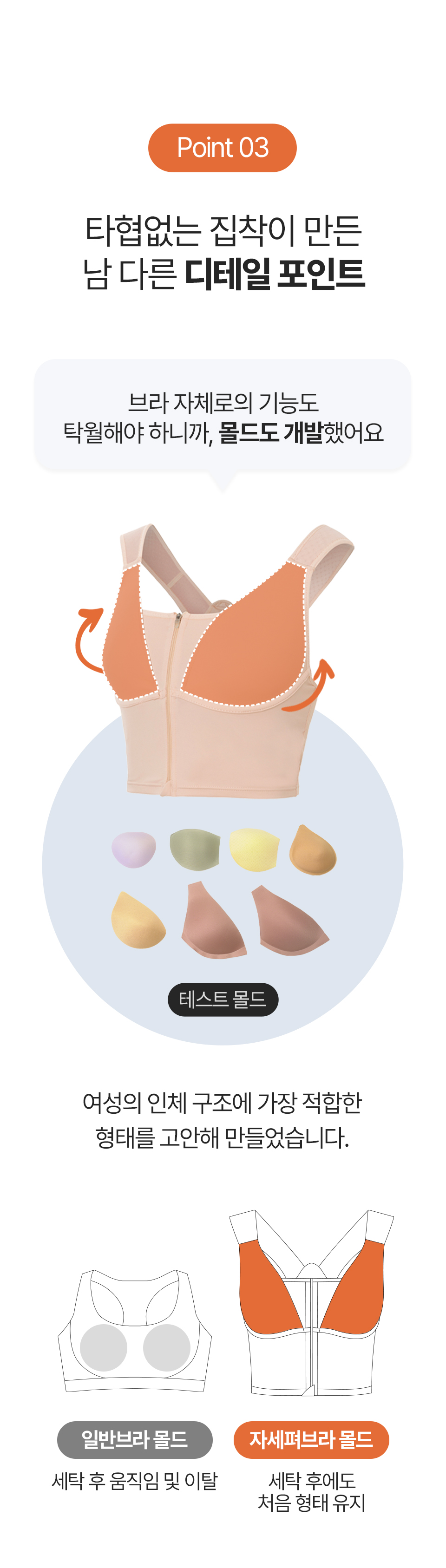하지만 몰드는 자세펴브라의 핵심이었기에 포기할 수 없었어요. 인체를 분석하고, 당겨지는 힘에 의한 문제점을 최소화하기 위해 디테일 하나하나에 심혈을 기울였습니다.