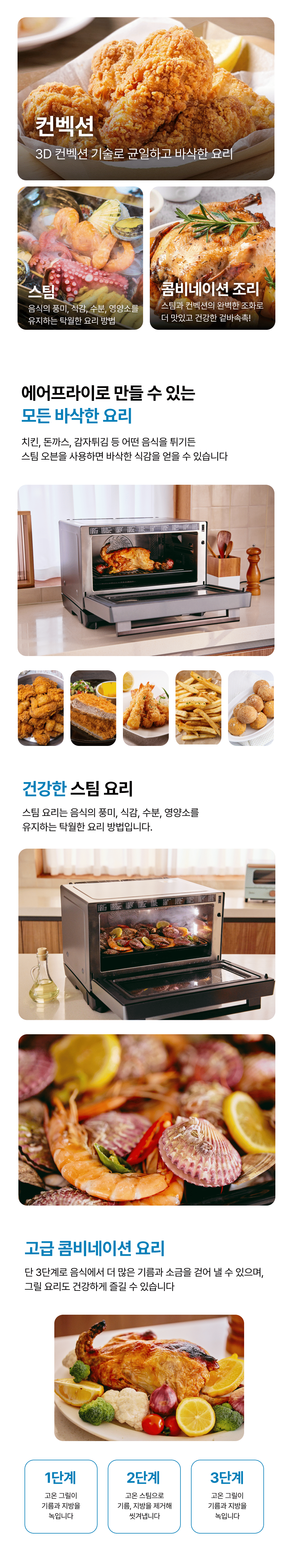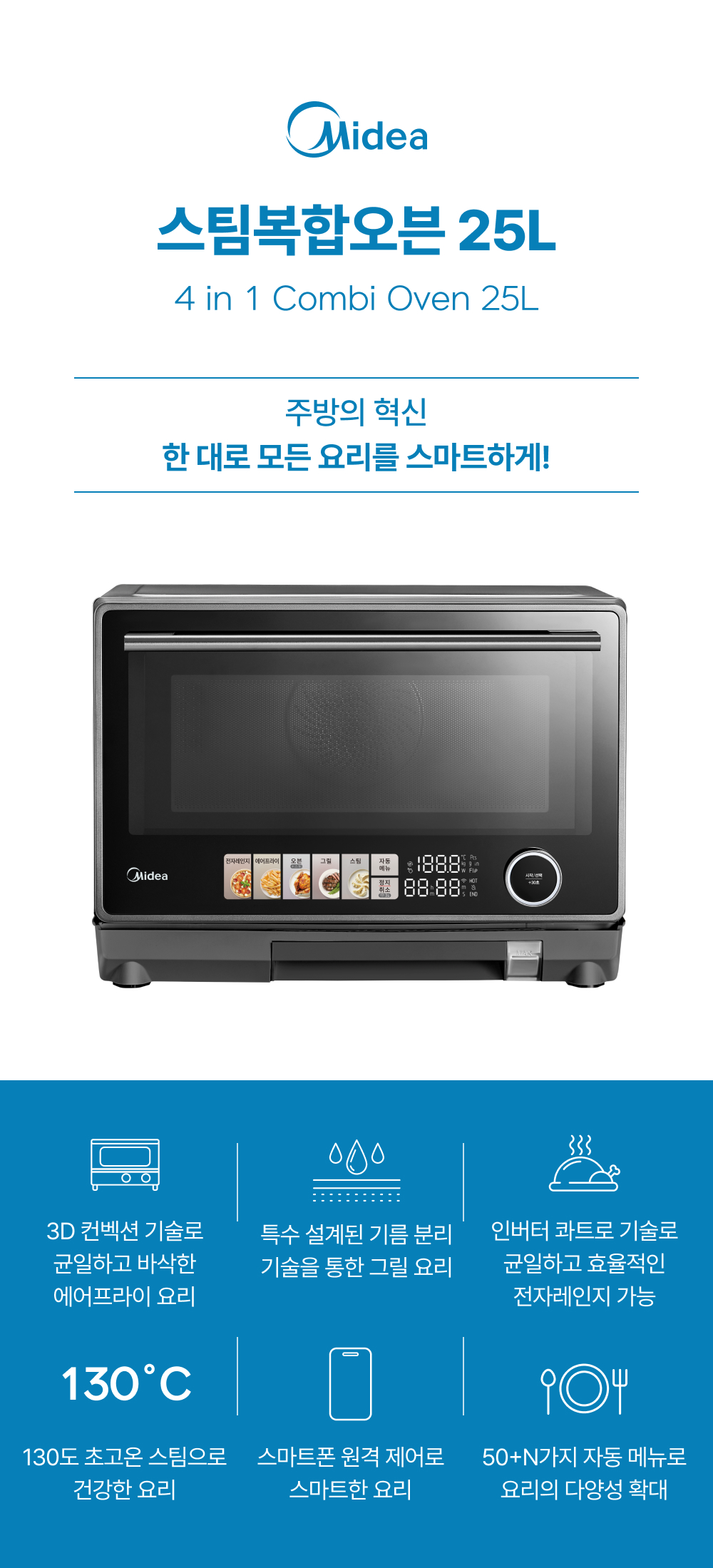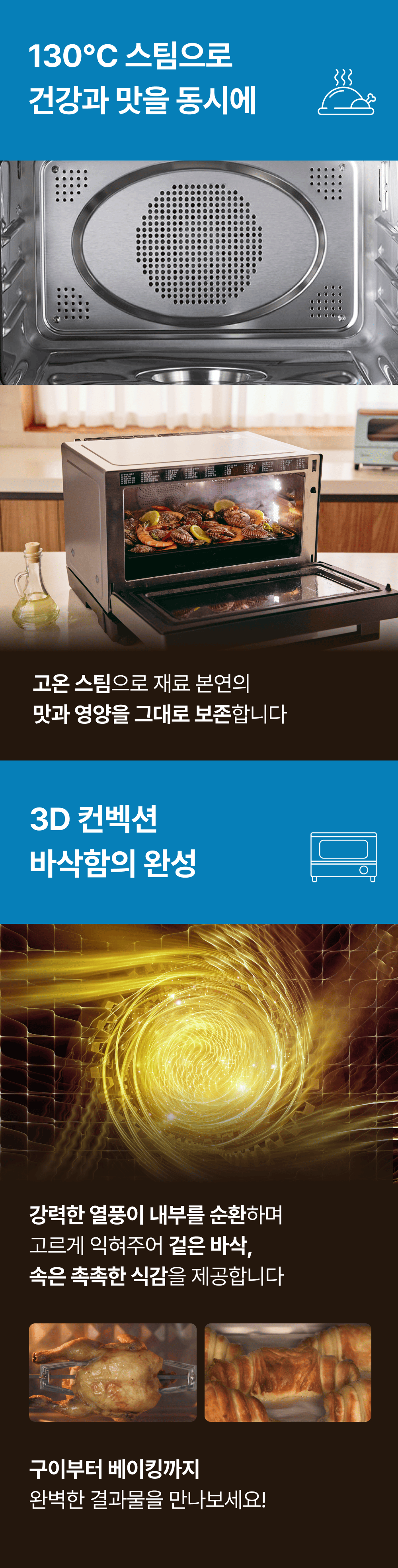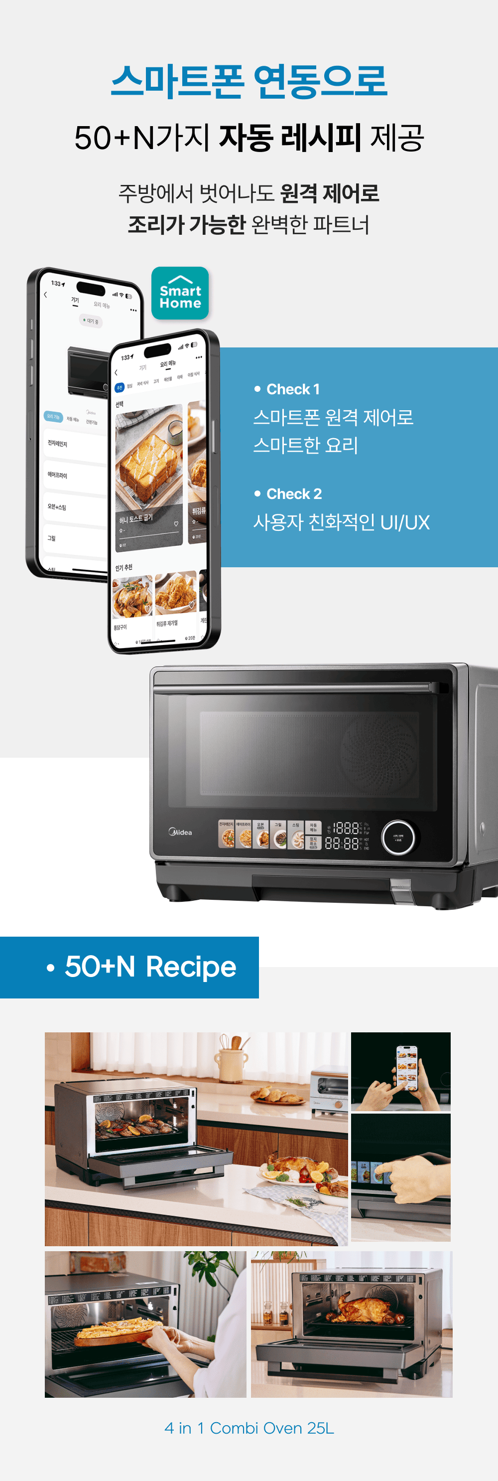이번 펀딩을 통해 소개해드리는 X23 4in1 스팀복합오븐은 25리터의 넉넉한 용량에 다양한 조리 기능을 하나로 결합한 혁신적인 복합 오븐입니다. 3D 컨벡션 에어프라이 기능으로 강력한 열풍이 내부를 순환하며 음식의 겉은 바삭하고 속은 촉촉하게 조리됩니다. 또한, 130도의 초고온 스팀 기능과 자체 설계된 기름 분리 기술을 통해 음식 본연의 풍미와 영양소를 그대로 보존하여 건강하고 맛있는 요리를 선사합니다. 스마트홈 앱 연동으로 제공되는 테이스트프로 스팀 오븐 메뉴를 통해 50개 이상의 자동 메뉴를 손쉽게 즐길 수 있어, 초보자도 마치 요리 전문가처럼 완성도 높은 요리를 만들 수 있습니다.