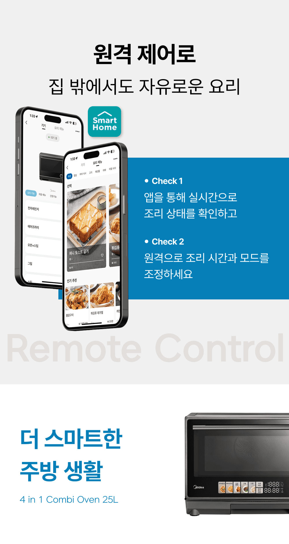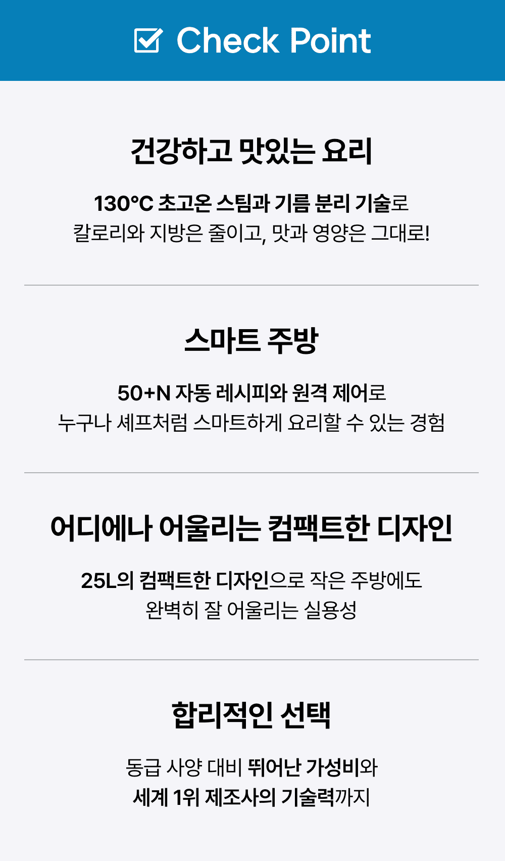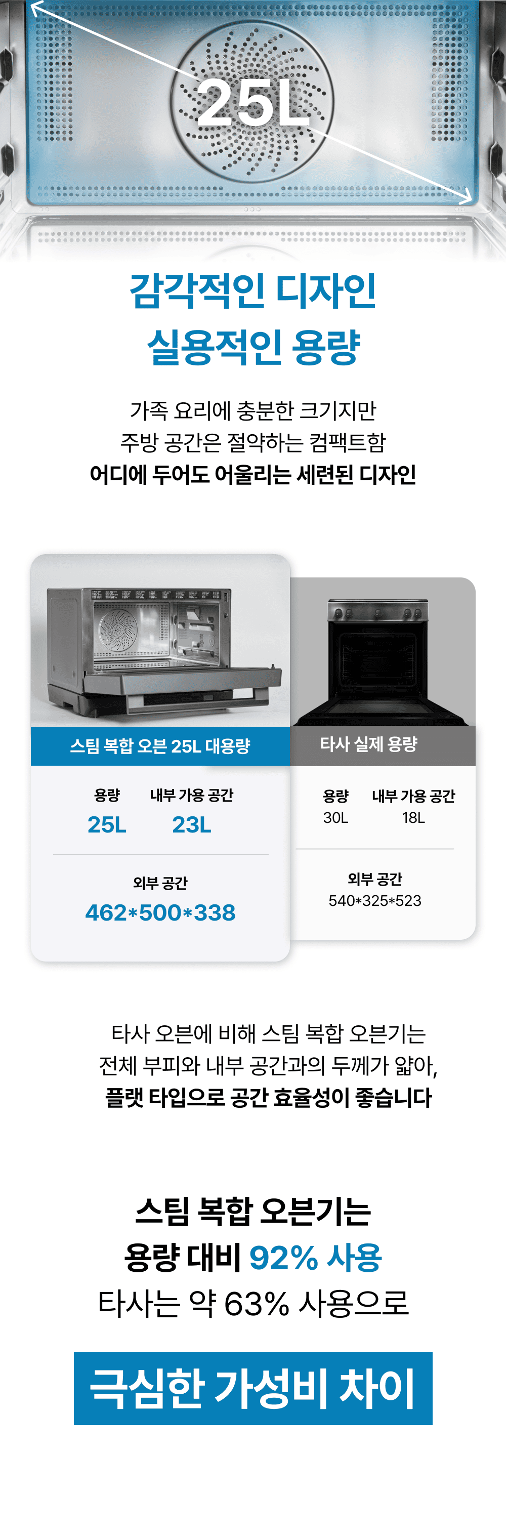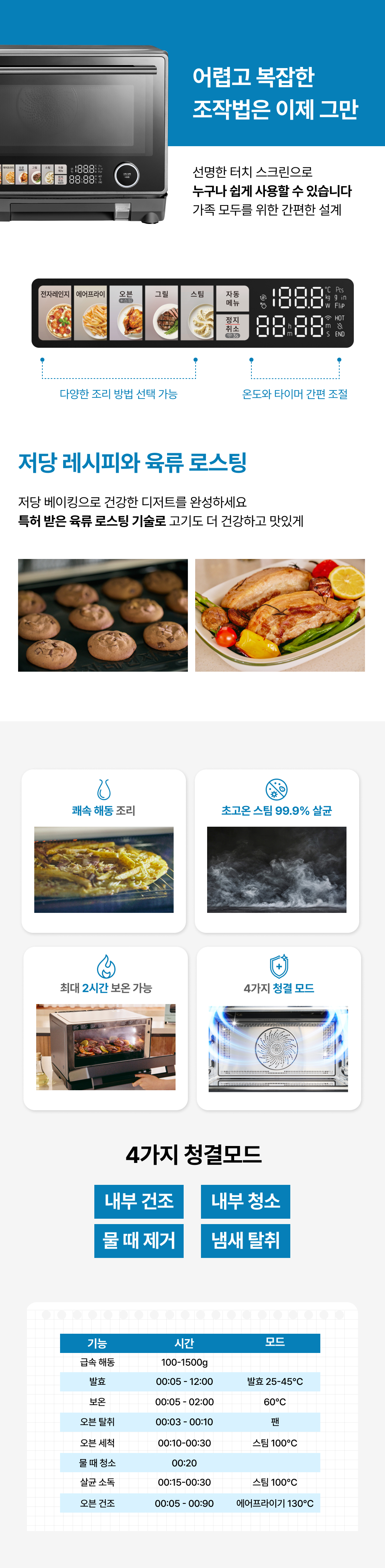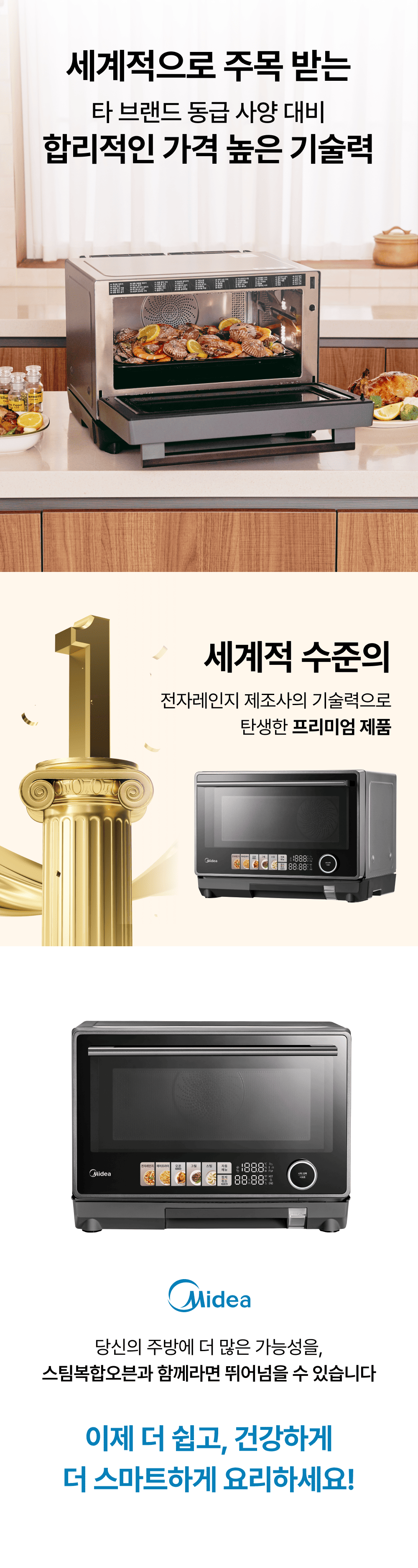 이번 펀딩을 통해 소개해드리는 X23 4in1 스팀복합오븐은 25리터의 넉넉한 용량에 다양한 조리 기능을 하나로 결합한 혁신적인 복합 오븐입니다. 3D 컨벡션 에어프라이 기능으로 강력한 열풍이 내부를 순환하며 음식의 겉은 바삭하고 속은 촉촉하게 조리됩니다. 또한, 130도의 초고온 스팀 기능과 자체 설계된 기름 분리 기술을 통해 음식 본연의 풍미와 영양소를 그대로 보존하여 건강하고 맛있는 요리를 선사합니다. 스마트홈 앱 연동으로 제공되는 테이스트프로 스팀 오븐 메뉴를 통해 50개 이상의 자동 메뉴를 손쉽게 즐길 수 있어, 초보자도 마치 요리 전문가처럼 완성도 높은 요리를 만들 수 있습니다.