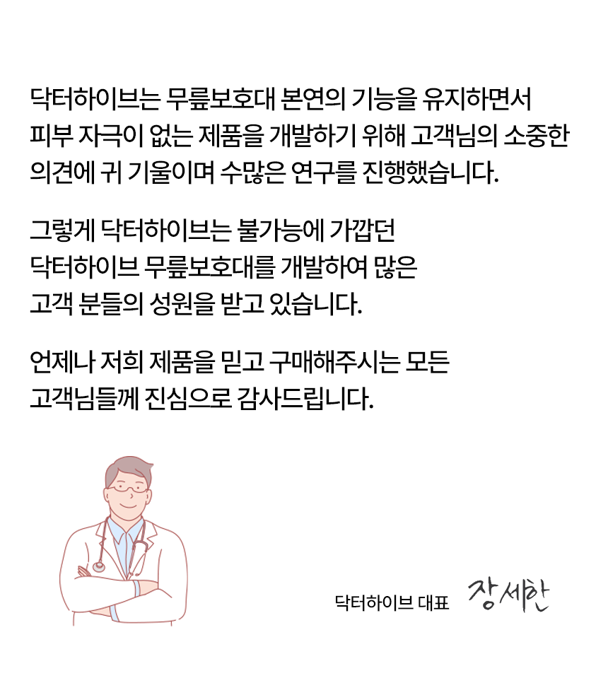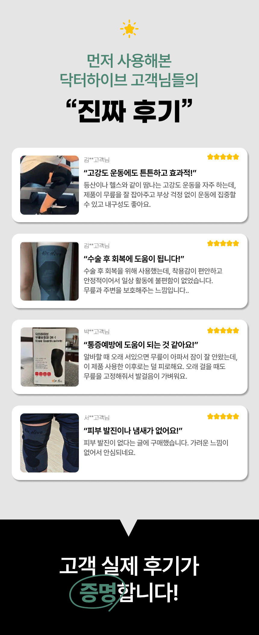 닥터하이브 무릎보호대는 단순히 ‘상처 많던 내 무릎’을 위한 것이 아닙니다. 비슷한 아픔, 비슷한 불편함을 겪어본 모든 분들과 나누고 싶은 해결책입니다. 노력과 정성을 담아 만든 이 보호대를 통해, 이제 더 많은 분들이 아픔 없이, 조금 더 편안한 걸음으로 일상을 누릴 수 있길 바랍니다.