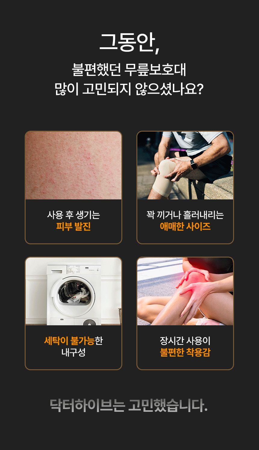 이런 불편을 해결하려고 시중의 무릎보호대를 하나 둘 사다 써보았습니다. 하지만 피부가 가렵고 붉어지는 발진이 생기거나, 조금만 써도 헐거워져 흘러내리는 문제로 매번 실망하기 일쑤였습니다. 왜 이렇게 나에게 맞는 보호대는 없을까 탄탄하게 무릎을 잡아주면서도 오래 써도 편안한 제품은 없는 걸까 고민하며 밤낮없이 생각했습니다.
