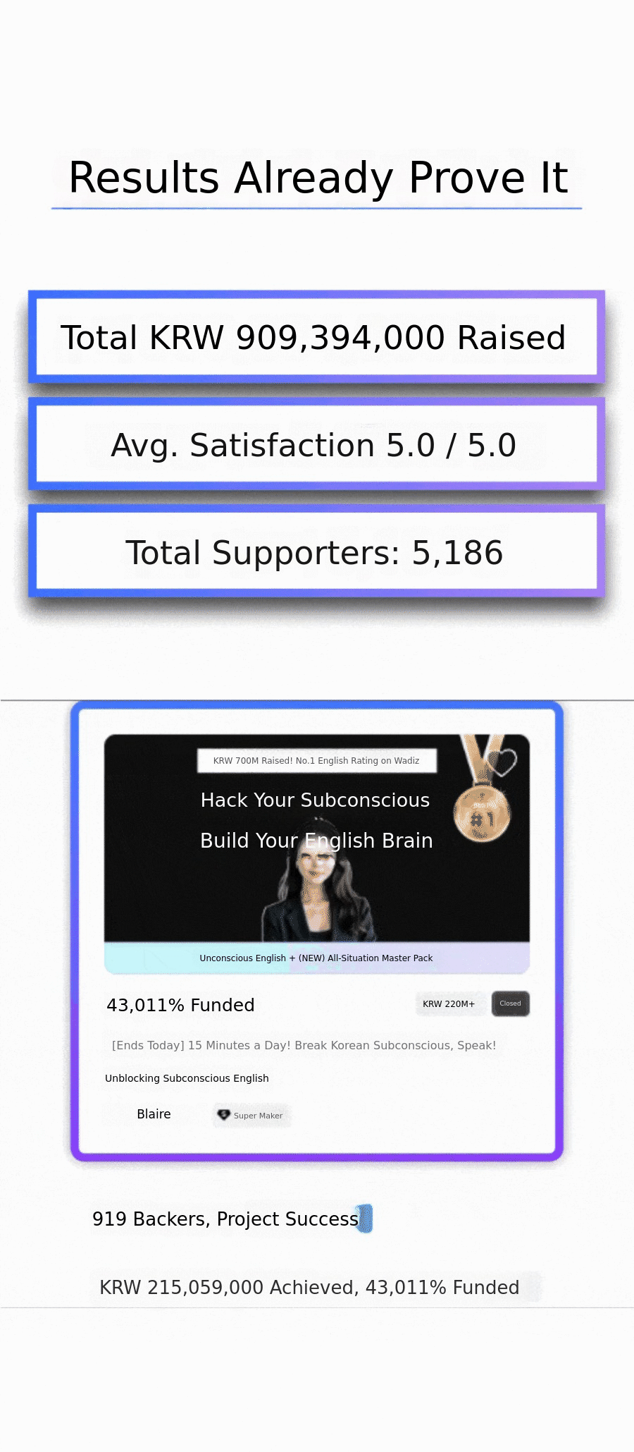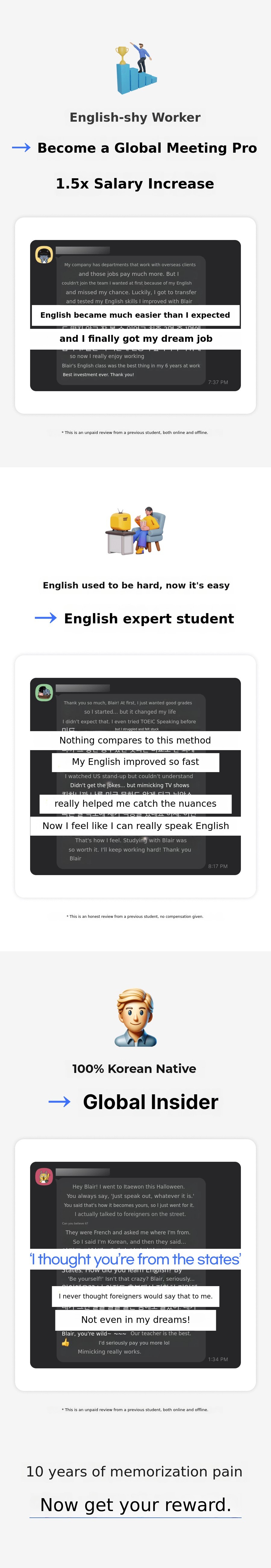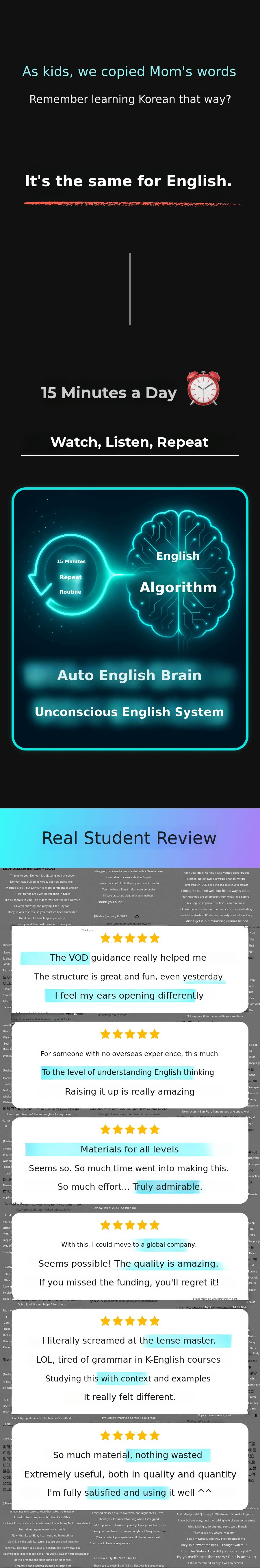 Now, I want to introduce this innovative 'Unconscious English learning method' to a wider world. This crowdfunding project is not simply about selling educational content. Through my passion and the success stories of my students, I want topresent new hope and possibilities for English learning to many people.