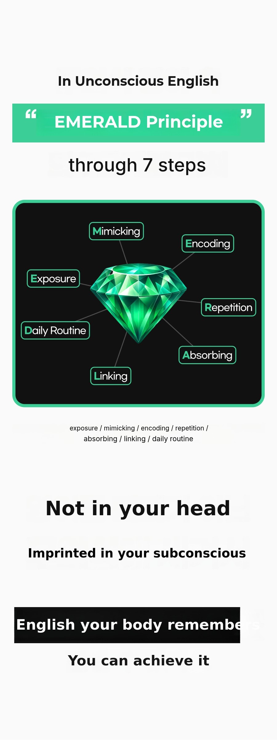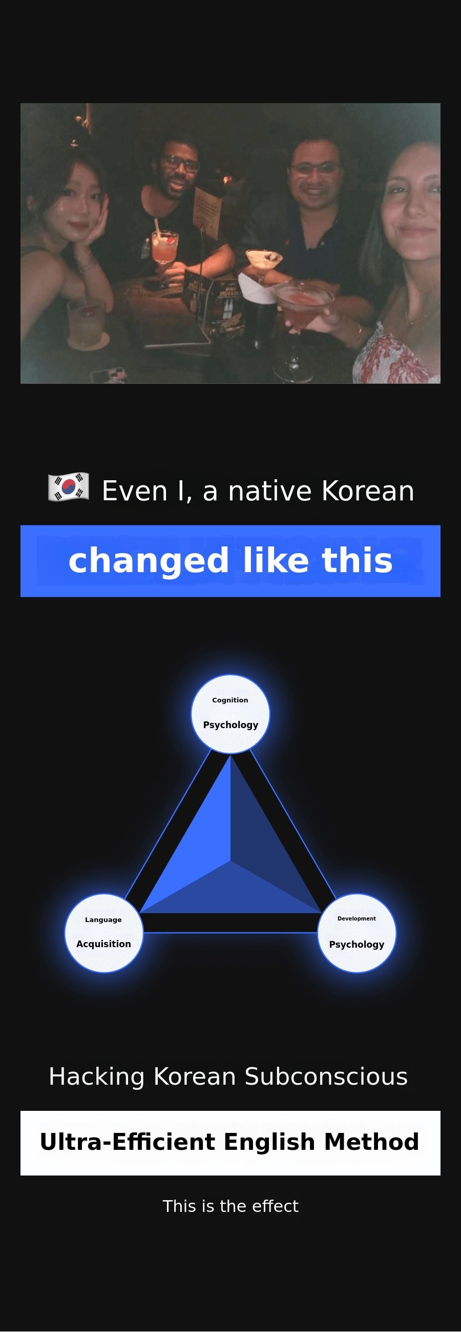 As a result, I developed my own unique'Unconscious English learning method'. This methoddramatically improves English speaking skills in a short period of time, which I proved through my own experience, and laterapplied it to my students with amazing results.