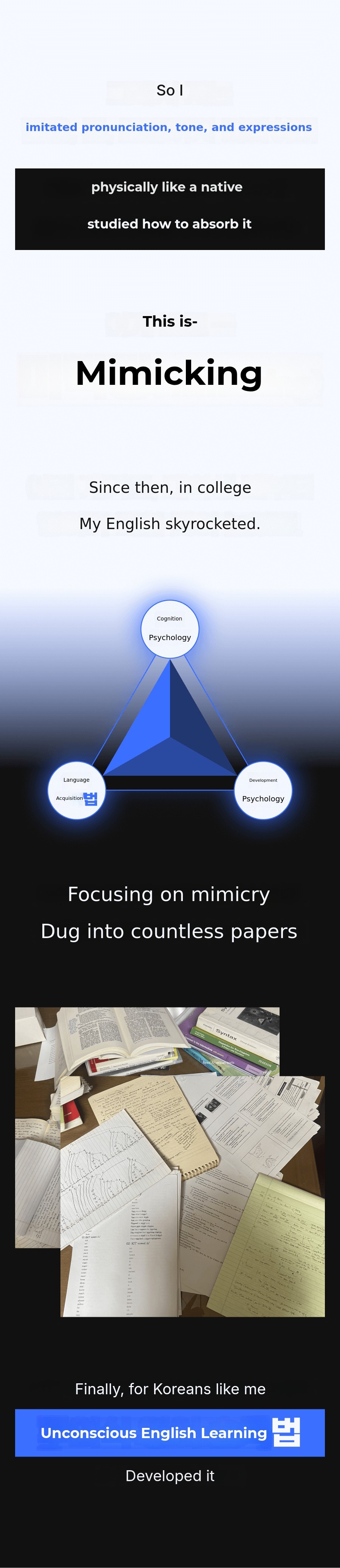 From then on, I started to focus on the difficulties faced by Korean ESL students. Since I majored in English, I had a thorough understanding of the mechanisms by which ESL (English as a Second Language) learners acquire English.Developmental psychology, cognitive psychology, teaching methods—I began to explore theories from various fields and started reading papers, articles, and journals like crazy.'Couldn’t Koreans apply the same principles that native speakers use to learn English?' What started as a vague idea began to seem feasible through research and verification!