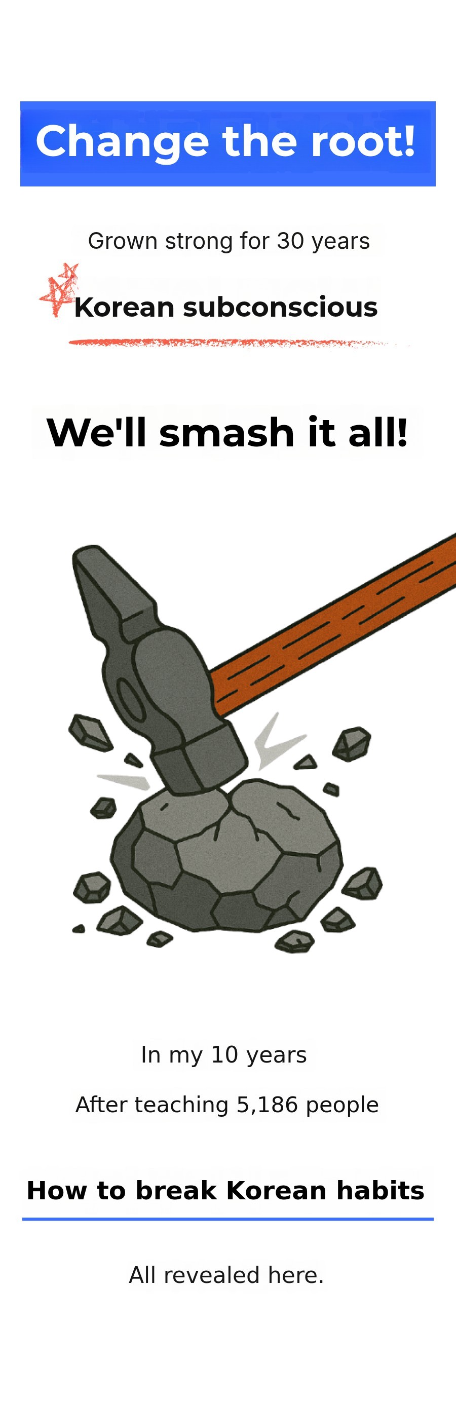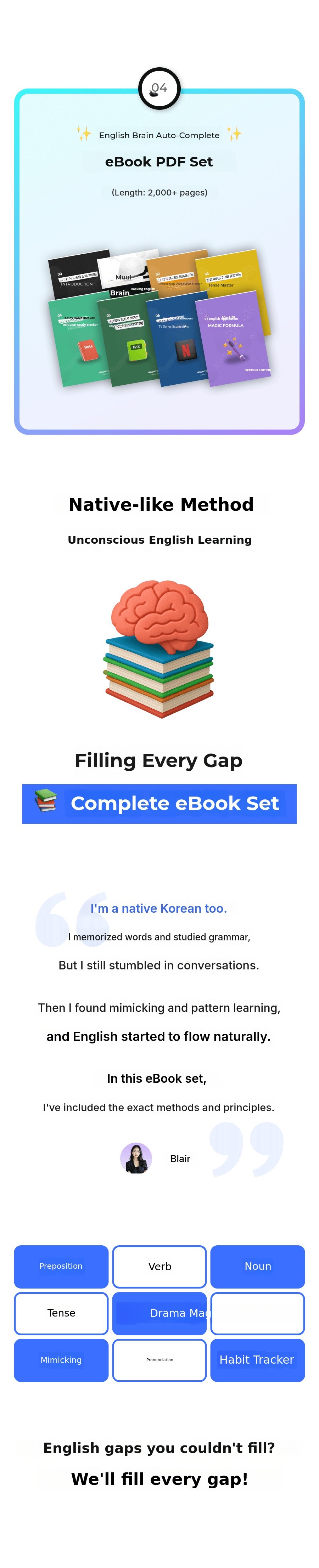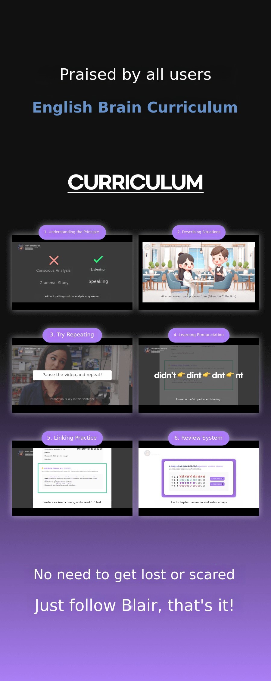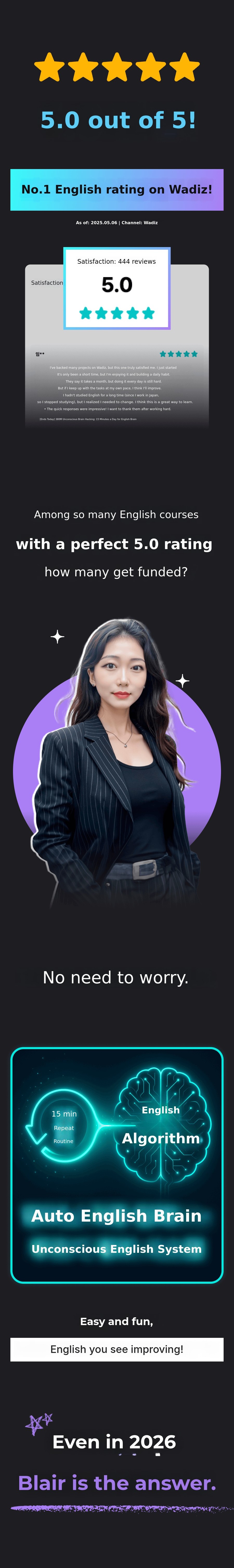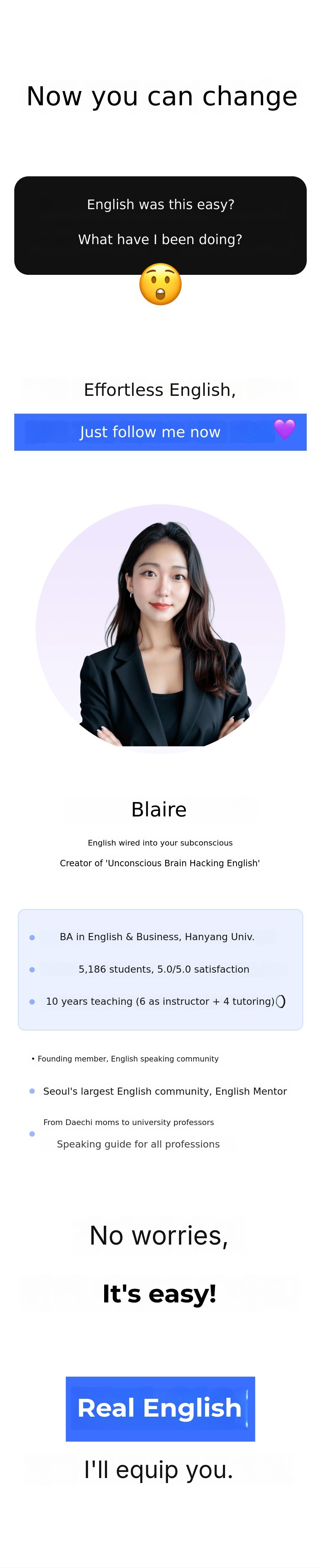 'Unconscious English learning method' Through this innovative method, more peoplecan overcome the barriers of English conversation, gain confidence, and experience a new world. I want to help make this possible. This is why I am passionate about this project and the core message of the Blair Project.Core message.