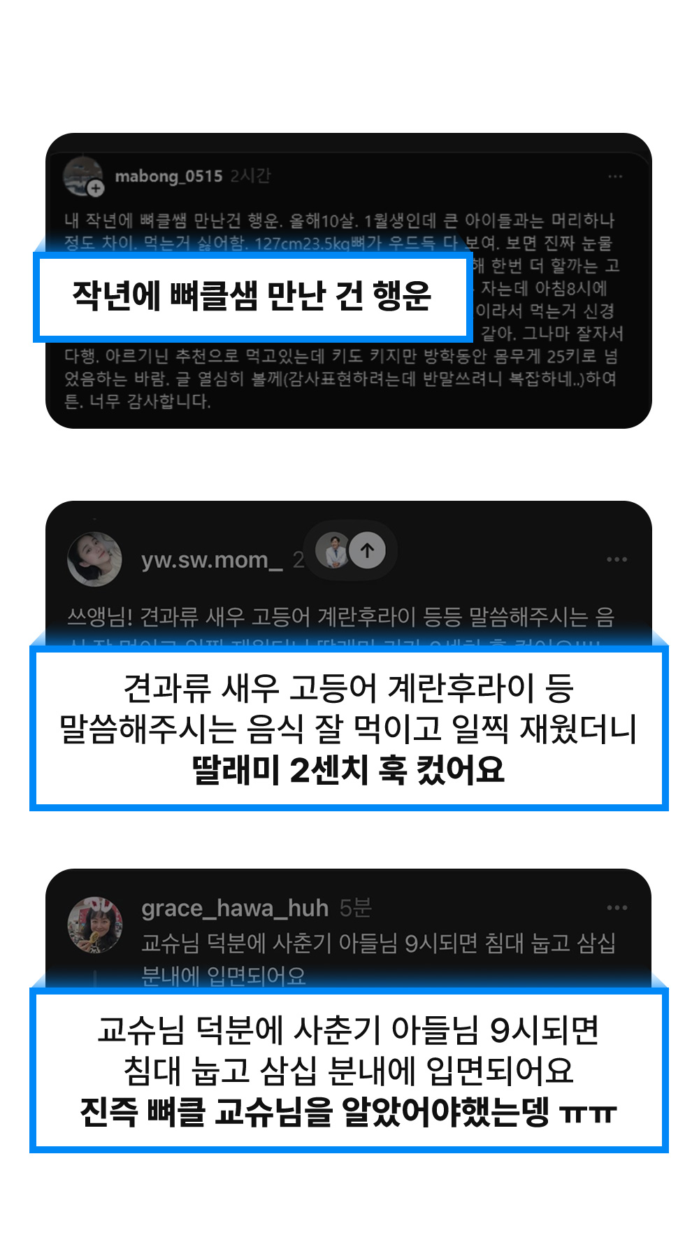 아이들의 키에 대해 신경쓰고 계신 부모님들에게 희망을 주고 싶습니다. 특히 성장기 마지막 기회를 놓치지 않도록, 지금 실천할 수 있는 현실적인 방법을 더 많은 부모님들과 나누고 싶었습니다.