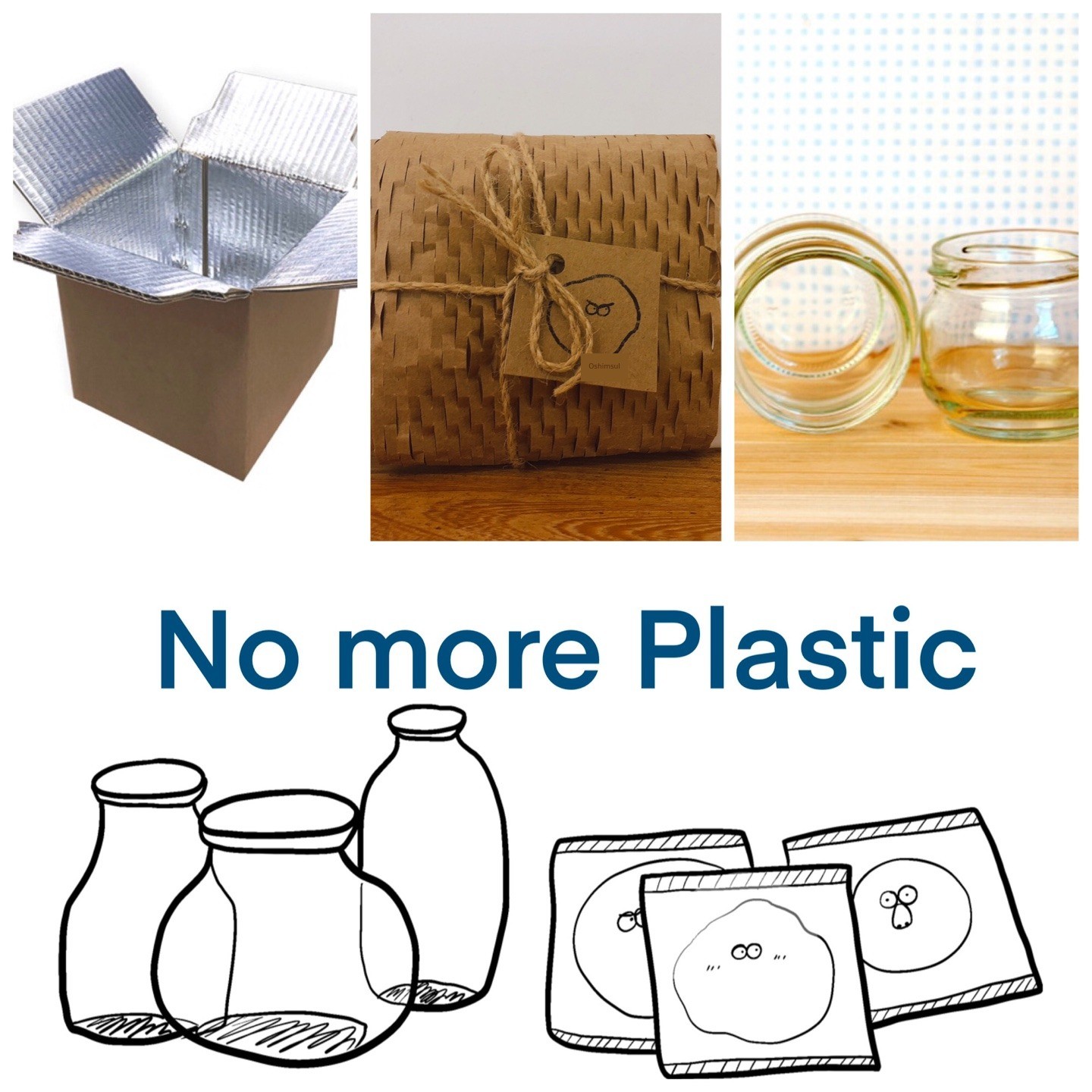 We use glass bottles instead of plastic, paper instead of vinyl, and cooling boxes made of paper that can be recycled instead of styrofoam.