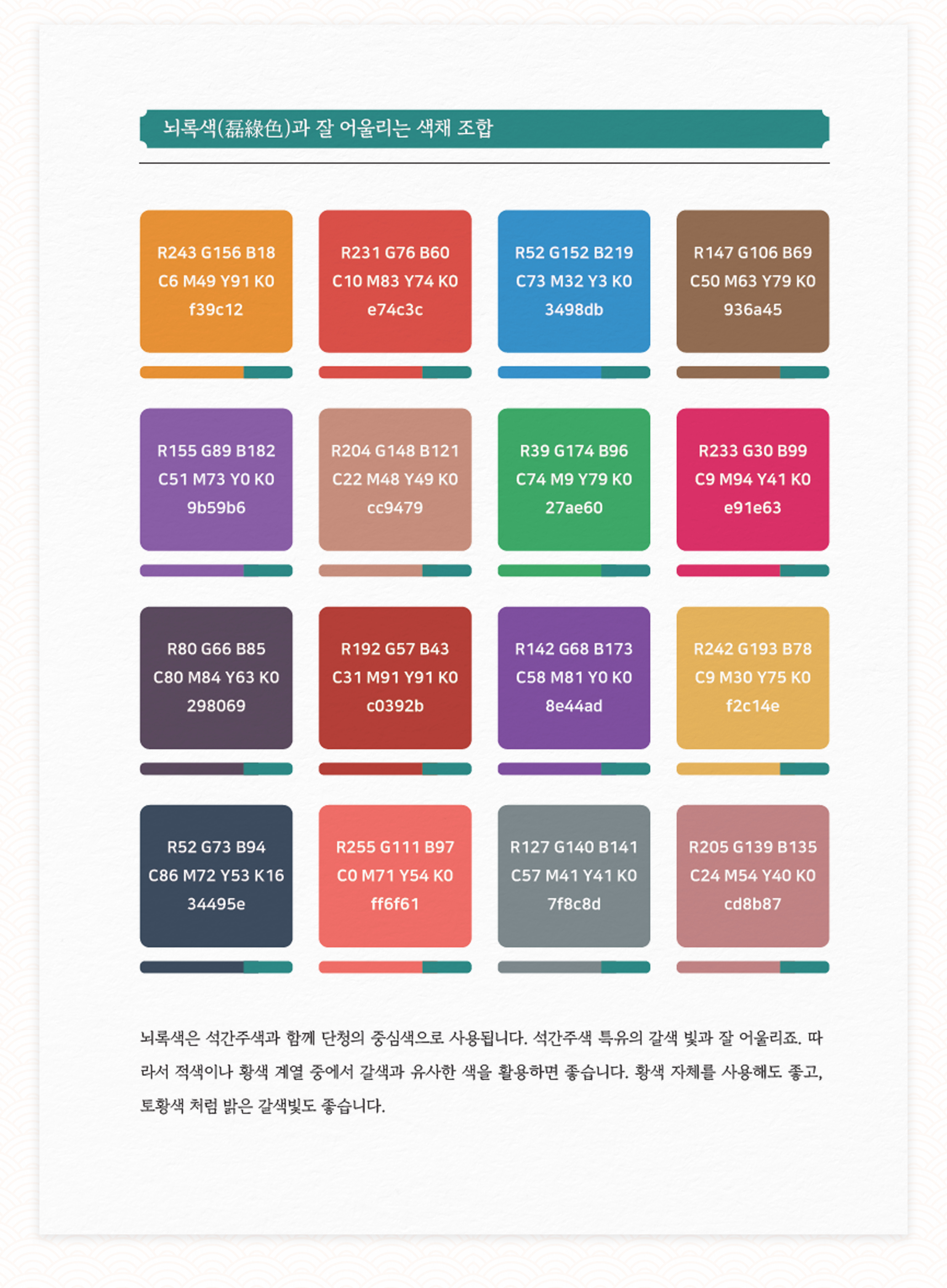 - 전통색과 같이 활용할 수 있는 배색 팔레트
