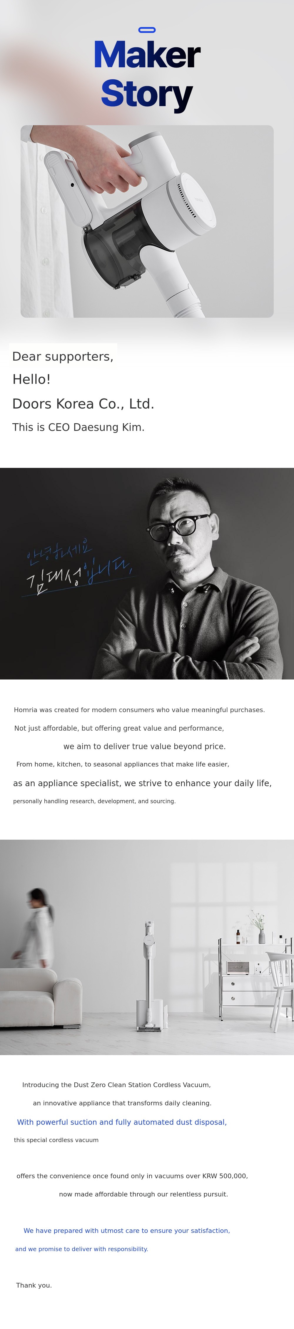 In particular, households with allergies or children can now maintain a healthier indoor environment without secondary dust exposure. The change that Homria hopes for is a culture where consumers make wiser and value-driven purchasing decisions. We want to create a consumer environment where choices are made based on the actual value of the product and individual needs, not just on brand or price tags. We hope to reduce unnecessary premiums in the vacuum cleaner market and encourage more companies to offer core features at reasonable prices through healthy competition. Through this product, Homria is realizing the vision of "democratization of technology" and "value-driven consumption."