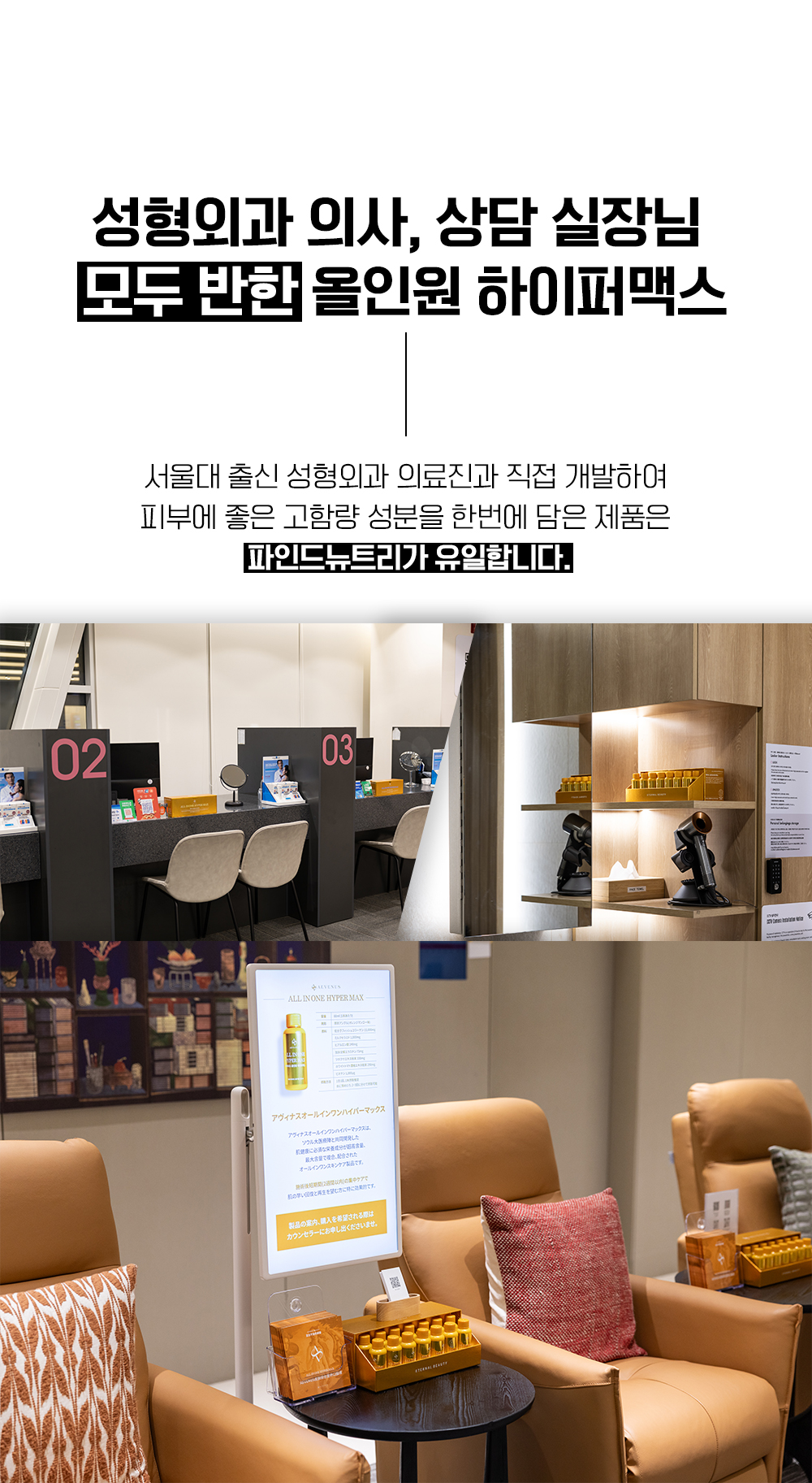 최근, 외면의 건강과 가속 노화 문제를 혼자 해결하기 어려워 병원 시술이나 헬스케어 프로그램을 찾는 분들이 늘고 있습니다. '파인드뉴트리'는 최적의 영양 솔루션을 통해 효과를 극대화하고 건강을 오래 유지할 수 있도록 돕고자 합니다.