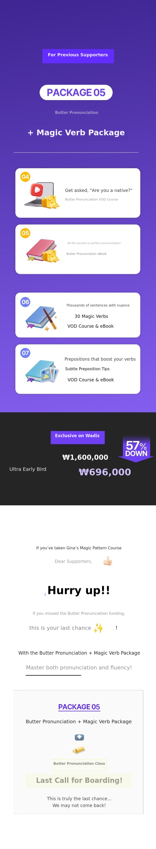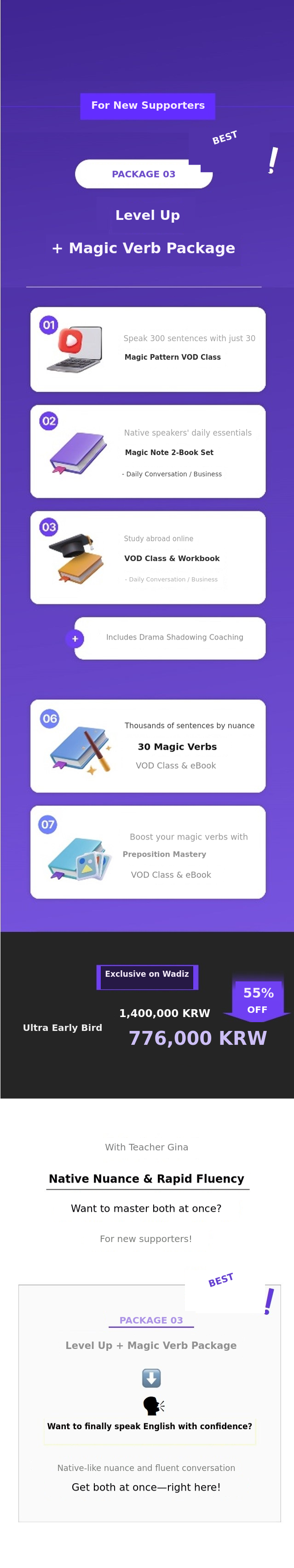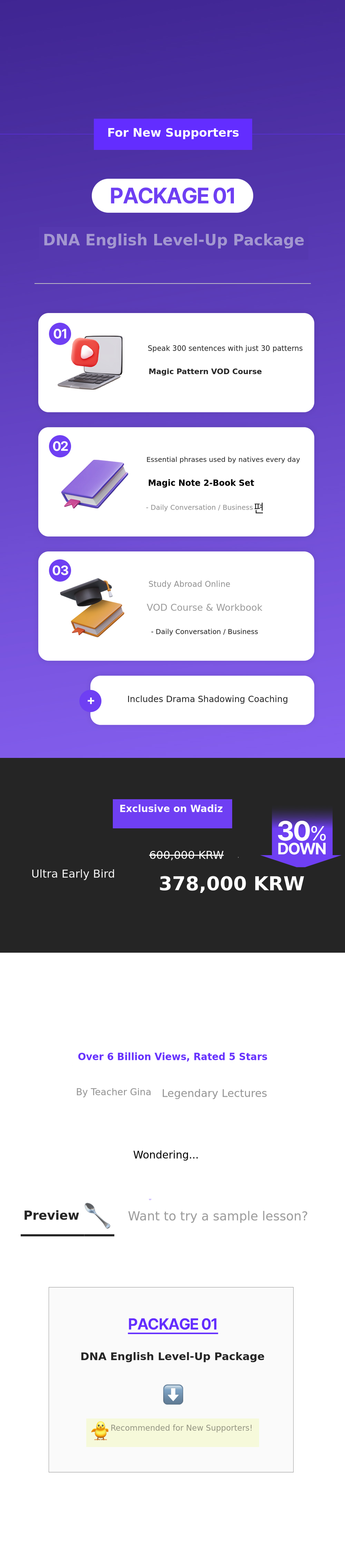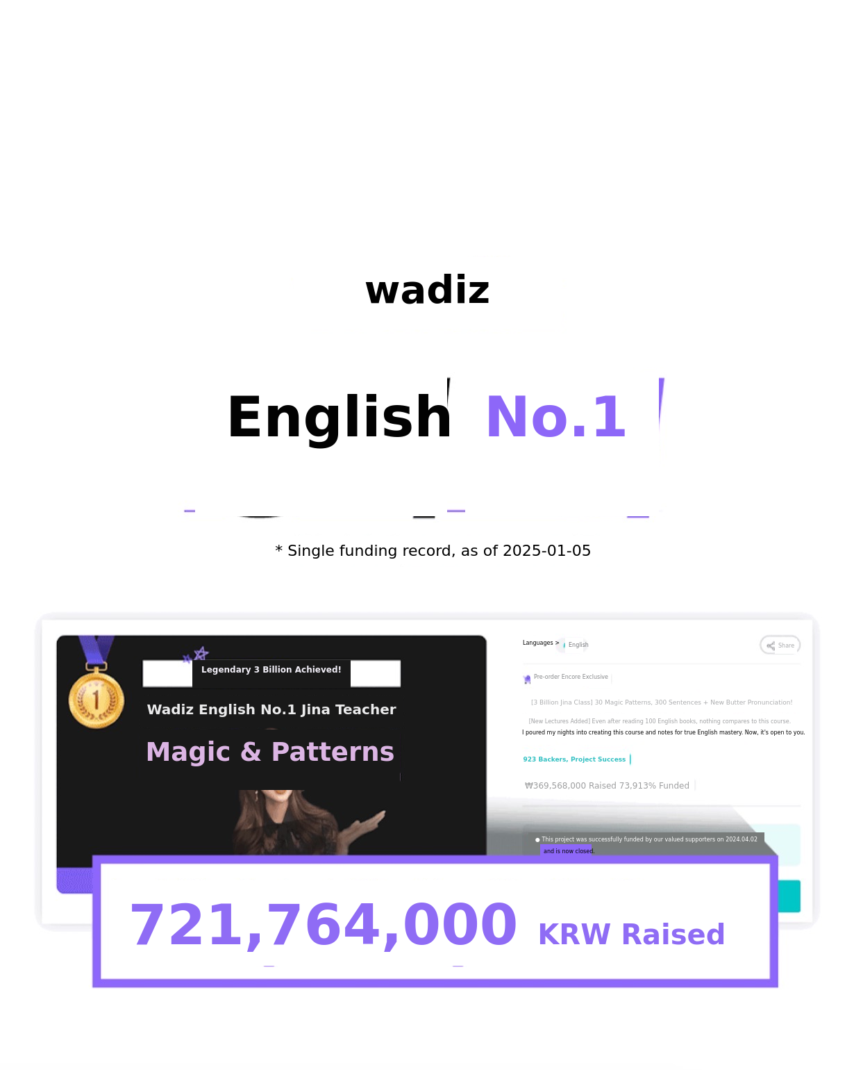 I chose Wadiz funding to continuously communicate with supporters and provide more complete and efficient services. The funds you support and provide will be used to create high-quality content that makes it easy and efficient to study and train English. My goal is to help you improve your English skills easily and enjoyably through the 30 Magic Patterns I created, drama pinpoint lectures, butter pronunciation lectures, magic phrasal verb lectures, and preposition lectures.