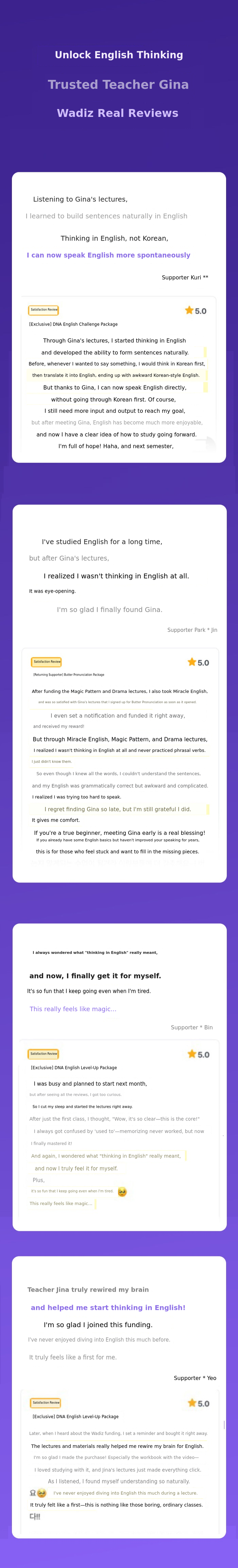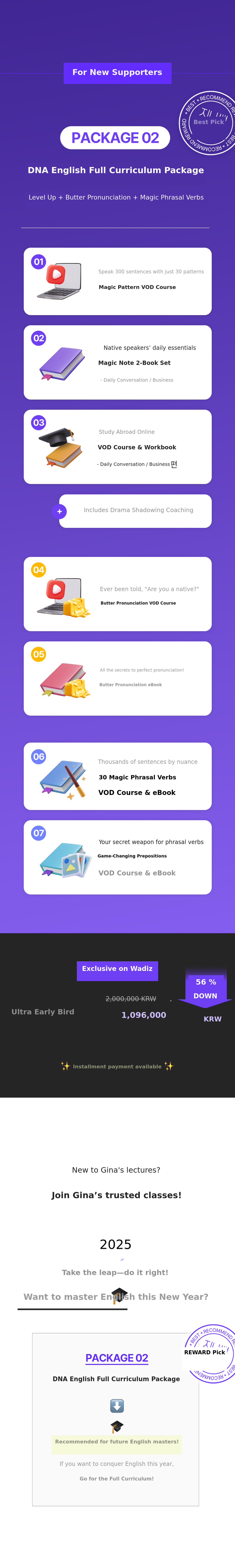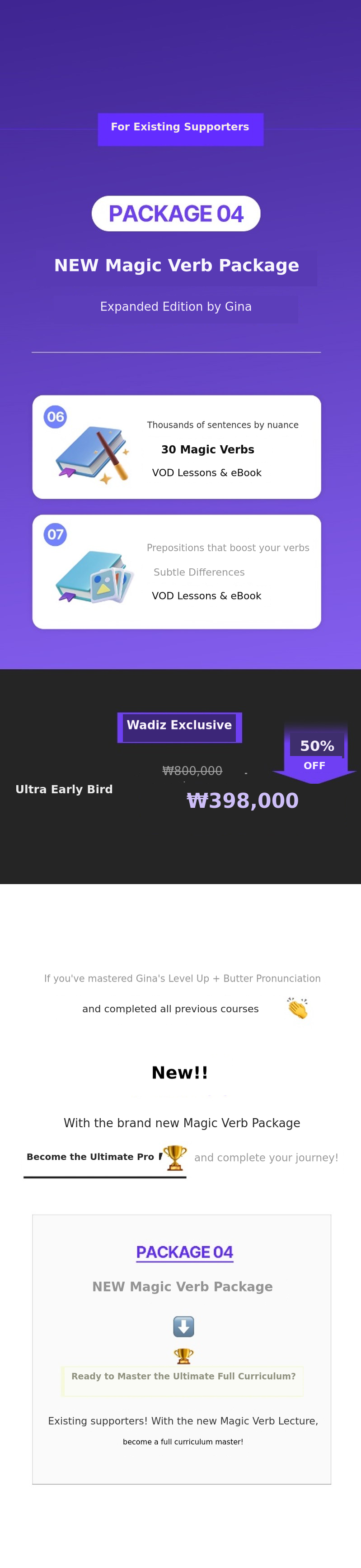 I chose Wadiz funding to continuously communicate with supporters and provide more complete and efficient services. The funds you support and provide will be used to create high-quality content that makes it easy and efficient to study and train English. My goal is to help you improve your English skills easily and enjoyably through the 30 Magic Patterns I created, drama pinpoint lectures, butter pronunciation lectures, magic phrasal verb lectures, and preposition lectures.