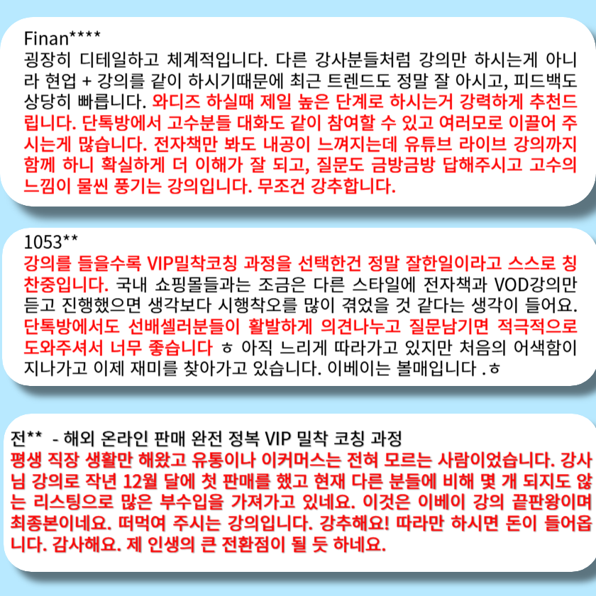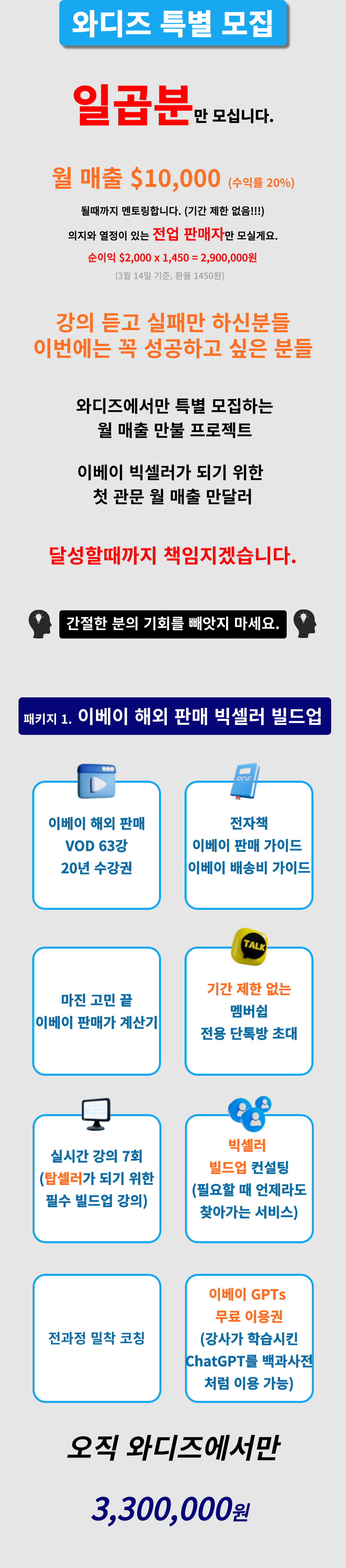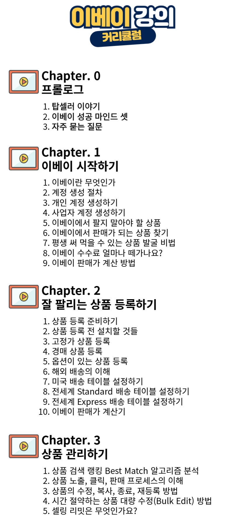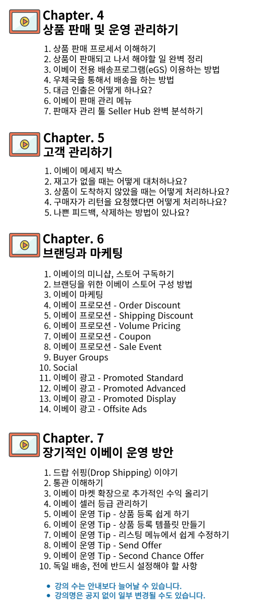 이베이 사용자 환경은 계속 변경되고 있고, 이베이 기능과 여러가지 환경들도 시간이 지나면서 계속 변경이 되고 있습니다. 이런 부분들을 다른 이베이 강의에서는 선제적으로 반영하고 있지 않지만, 이베이 공인 전문 강사이자 현역 탑셀러인 저는 이런 변경들에 바로바로 대응할 수 있습니다.