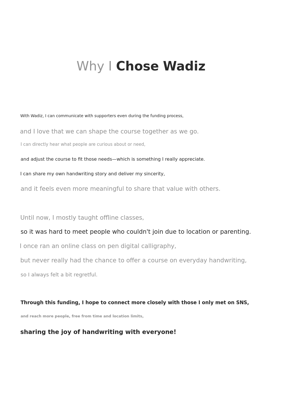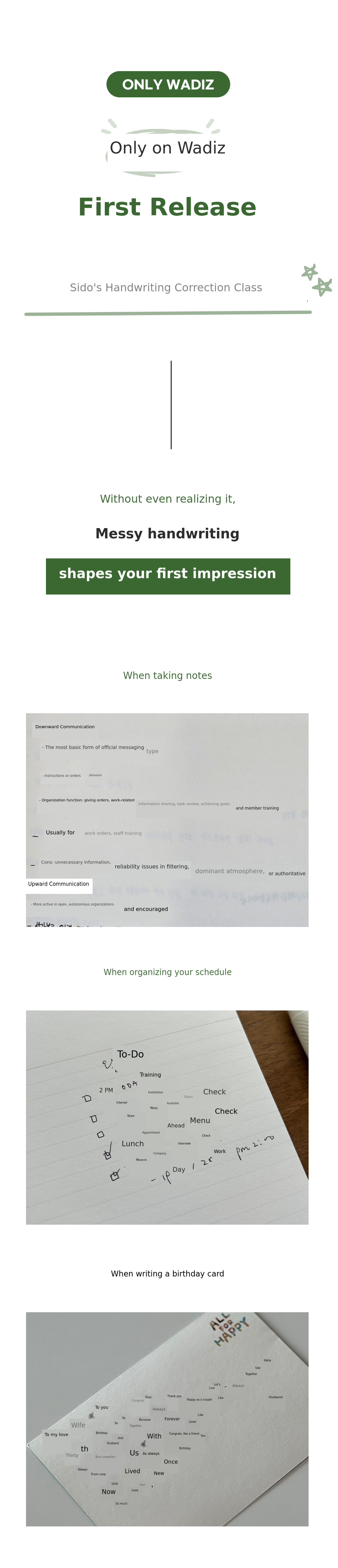 1. ✍️ Personal Handwriting Project - Improve neat handwriting with just 10 minutes daily practice 2. 🎨 Expressive and Personalized Style - Create unique handwriting that conveys warmth and connection 3. 🎁 Exclusive WADIZ Benefits - Includes expert lessons, writing kits, and unlimited feedback