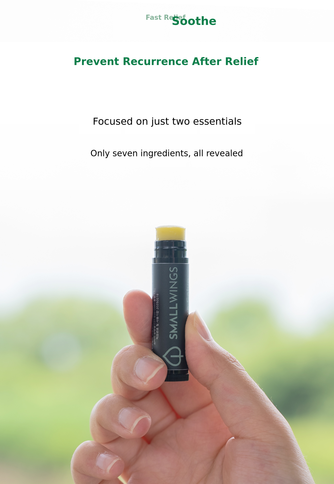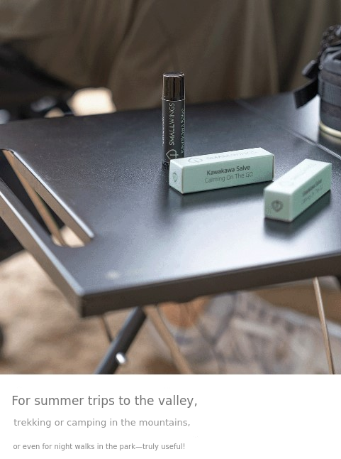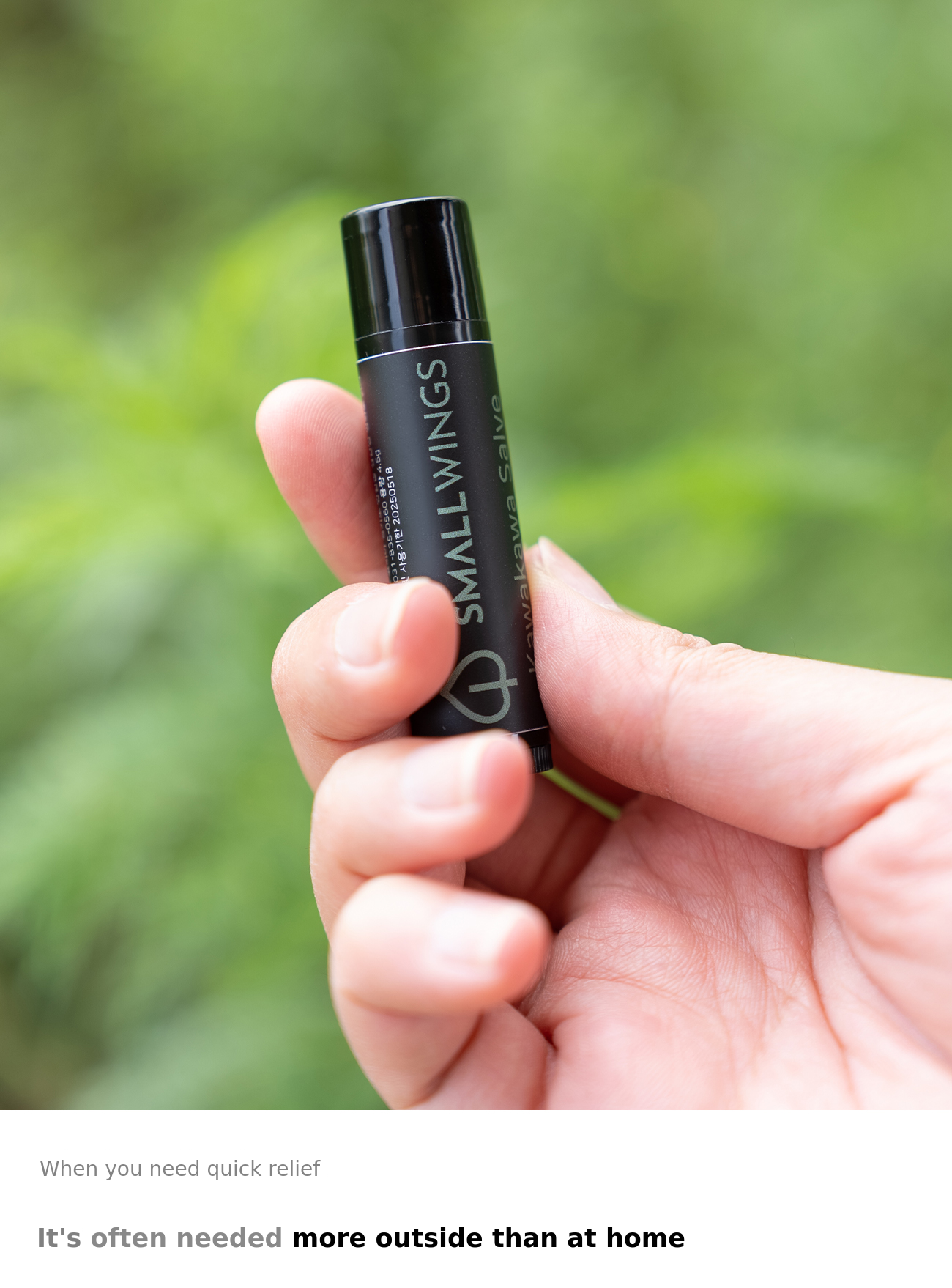 Kawakawa Salve Stick On The Go's key ingredient, and a rare New Zealand raw material that only Small Wings can handle.Whether it's bugs, sunlight, or just sensitive skin,Regardless of the cause, it soothes the skin, An excellent oil for calming the skin, So it has long been used as an all-purpose remedy in New Zealand folk medicine.