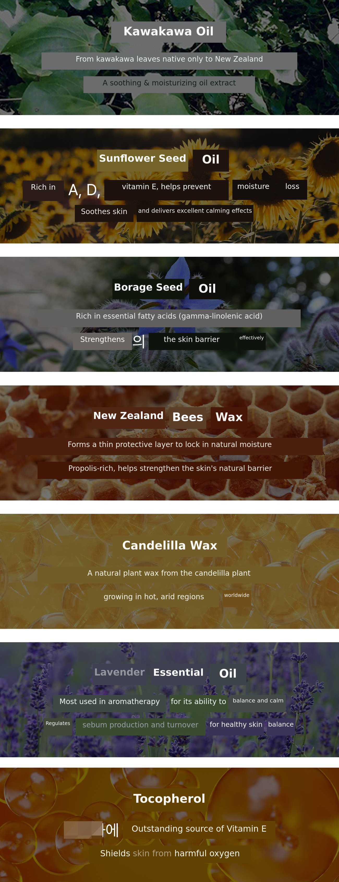 Rich in vitamins A, D, and E. It basically prevents moisture from evaporating,and helps the kawakawa oil be fully absorbed. Thanks to this,the skin calms down more quickly, and the process is accelerated.