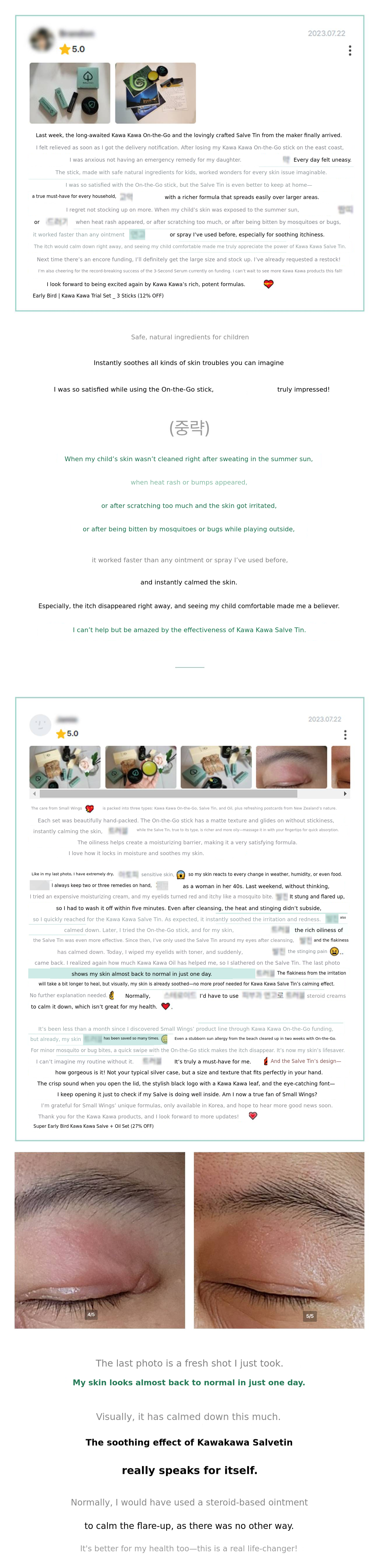 We at Small Wings successfully completed the first launch of 'Kawakawa Salve Calming On-the-Go' through Wadiz. Thanks to the support and interest of many people, we were able to finish our first funding successfully, confirming the value of our product and its market potential. With this encore funding, we hope to introduce our product to even more people through Wadiz and grow together.