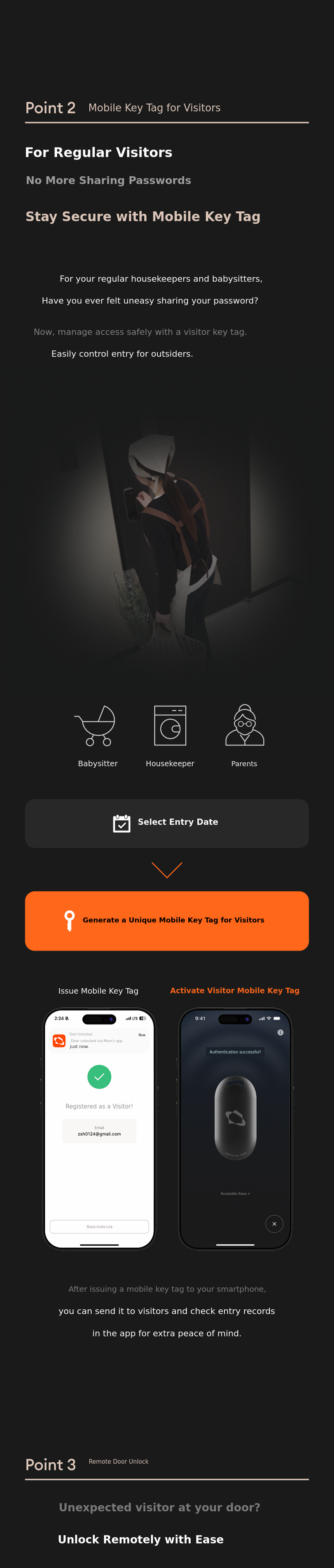 For family, friends, housekeepers, etc.Issue a temporary key to specific people It can also do it for you.