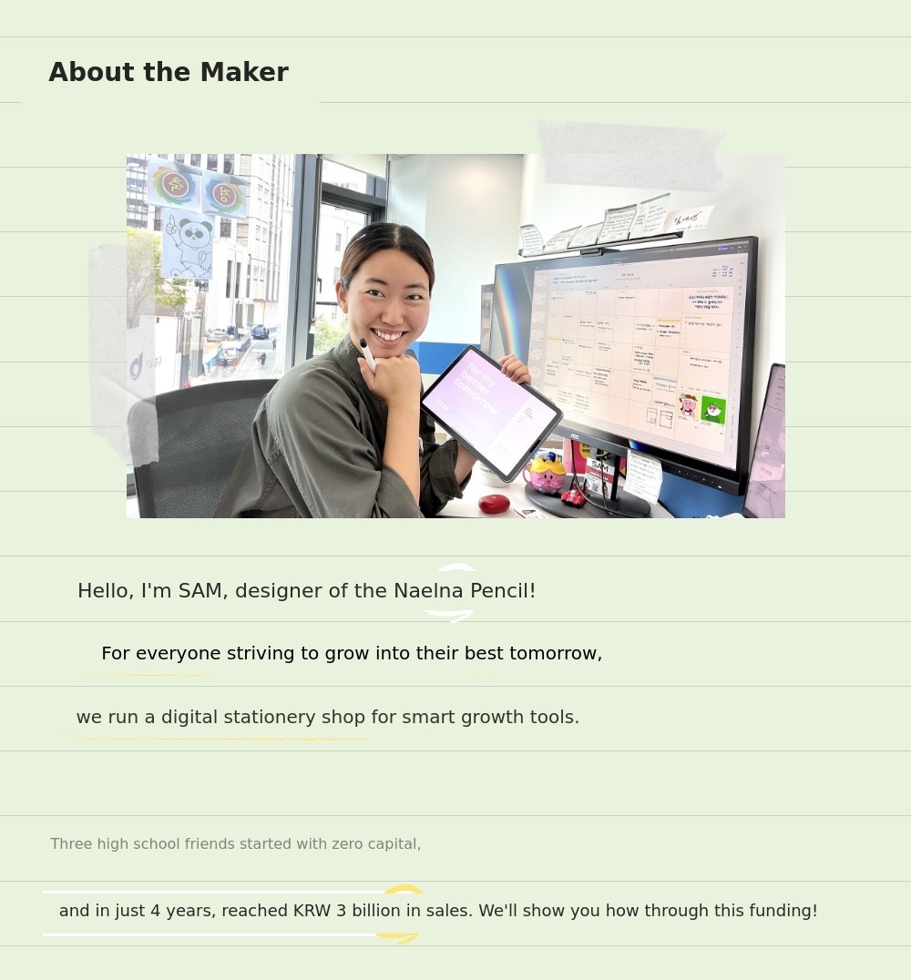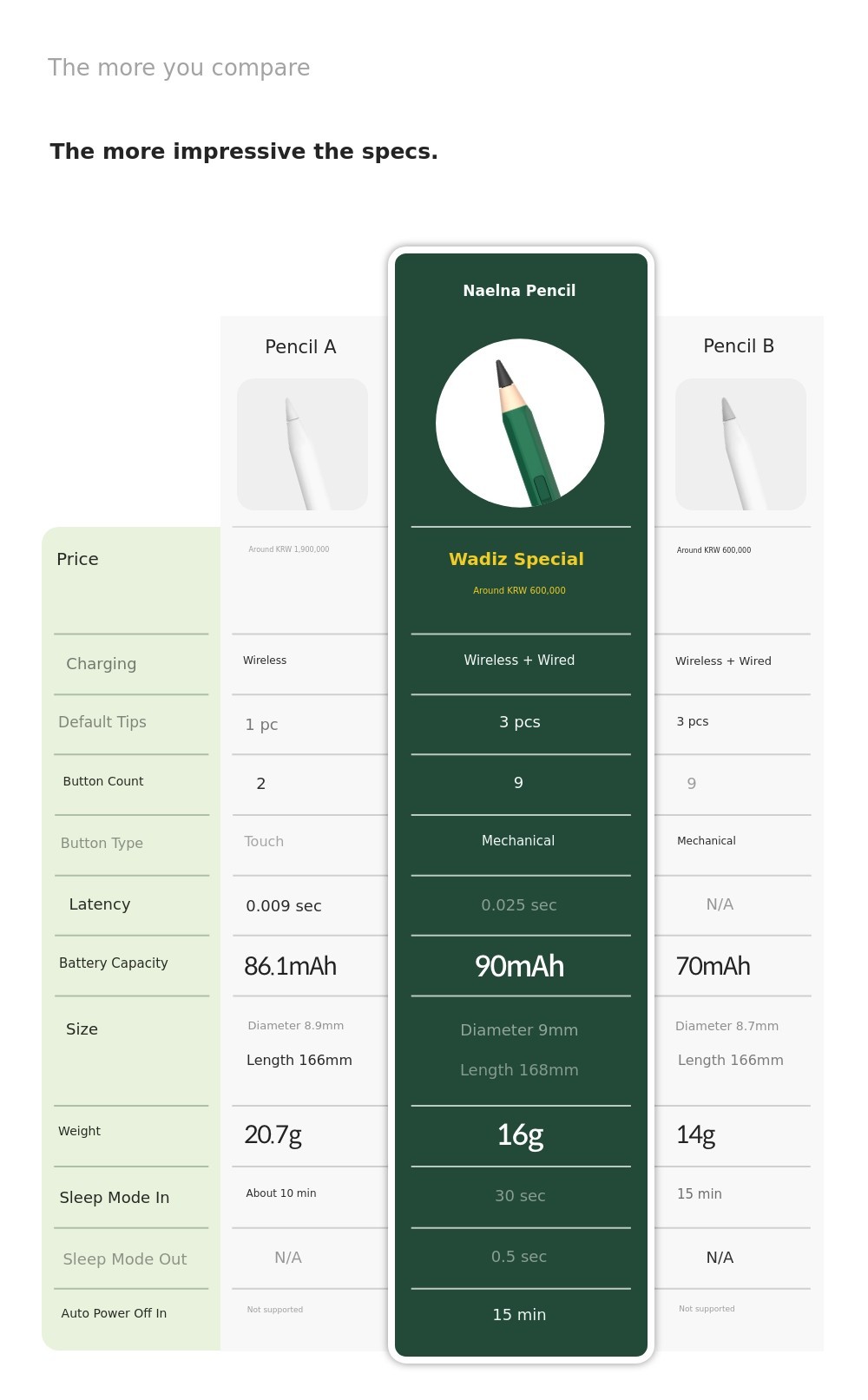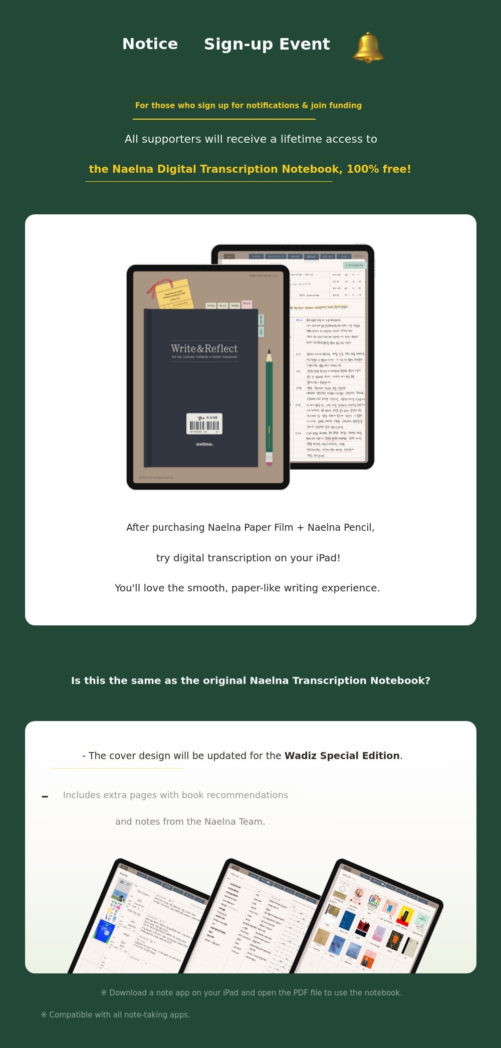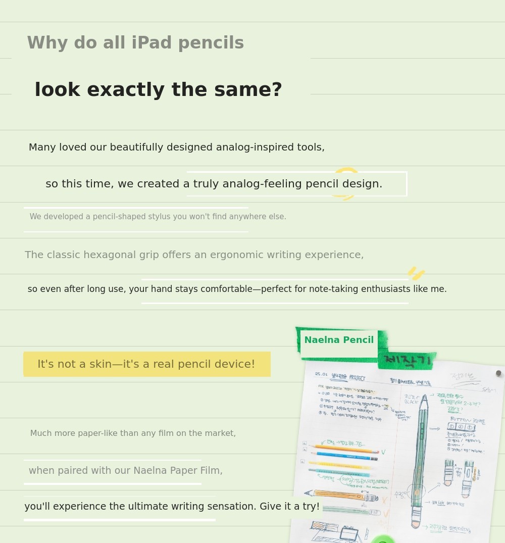 Naelna is loved by those who pursue smart growth. However,for those who do not yet know Naelna as well,we wanted them to experience Naelna's unique design and practical features. While planning the Naelna Pencil, this desire grew even stronger,and after much consideration among various channels,we chose Wadiz.Here, we hope tomeet many tech enthusiasts who use iPads anddeliver Naelna's unique sensibility to them.