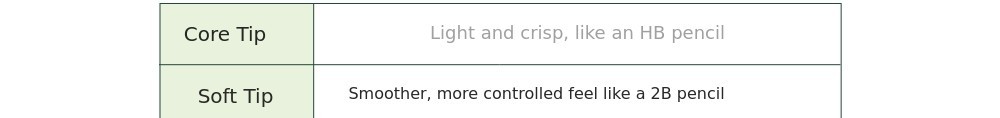 ※ The core tip and soft tip are not distinguishable by the naked eye, but if you gently scratch them with your fingernail,the soft tip feels a bit more like an eraser in terms of friction.