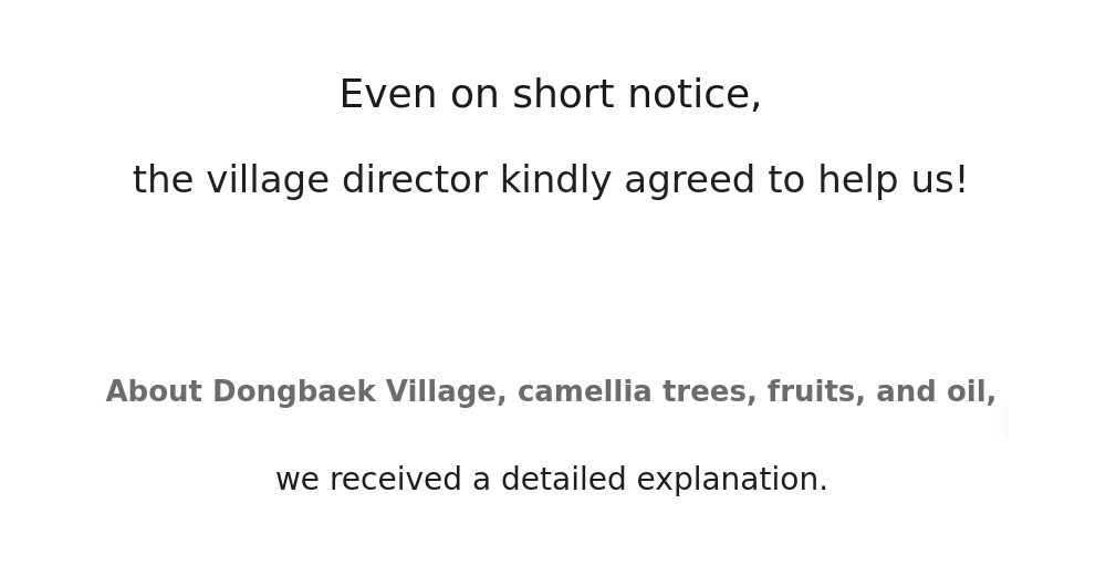One of the promises Ashrolen made to the village chief and the villagers when we first visited was that we would not focus solely on company profits, but also promote 'Jeju Camellia Village' and 'camellia,' and continuously generate village revenue to contribute to the village and local community. Our commitment to keeping that promise remains unchanged. We hope to make even greater contributions as Ashrolen continues to grow.