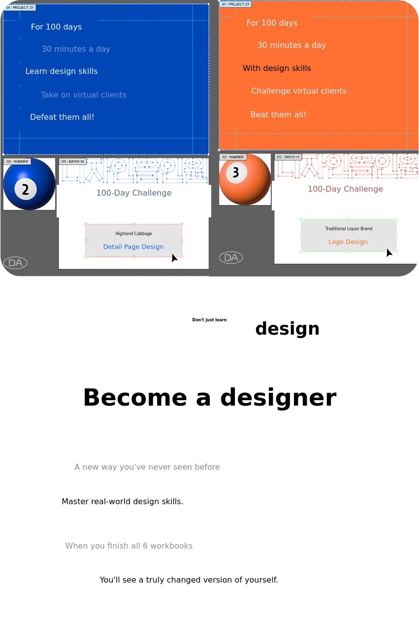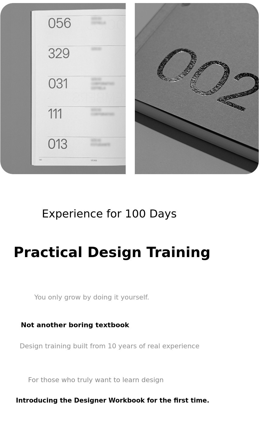1. ๐จ Designer Workbook 100-Day Program - 30 minutes daily for 100 days to train practical design skills 2. ๐ Practical Design Learning - Real client briefs for hands-on experience and portfolio building 3. ๐ Limited Early Bird Benefits - Exclusive discounts and special packages for backers