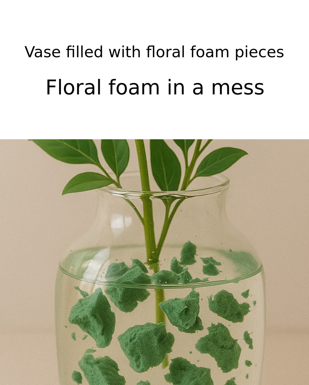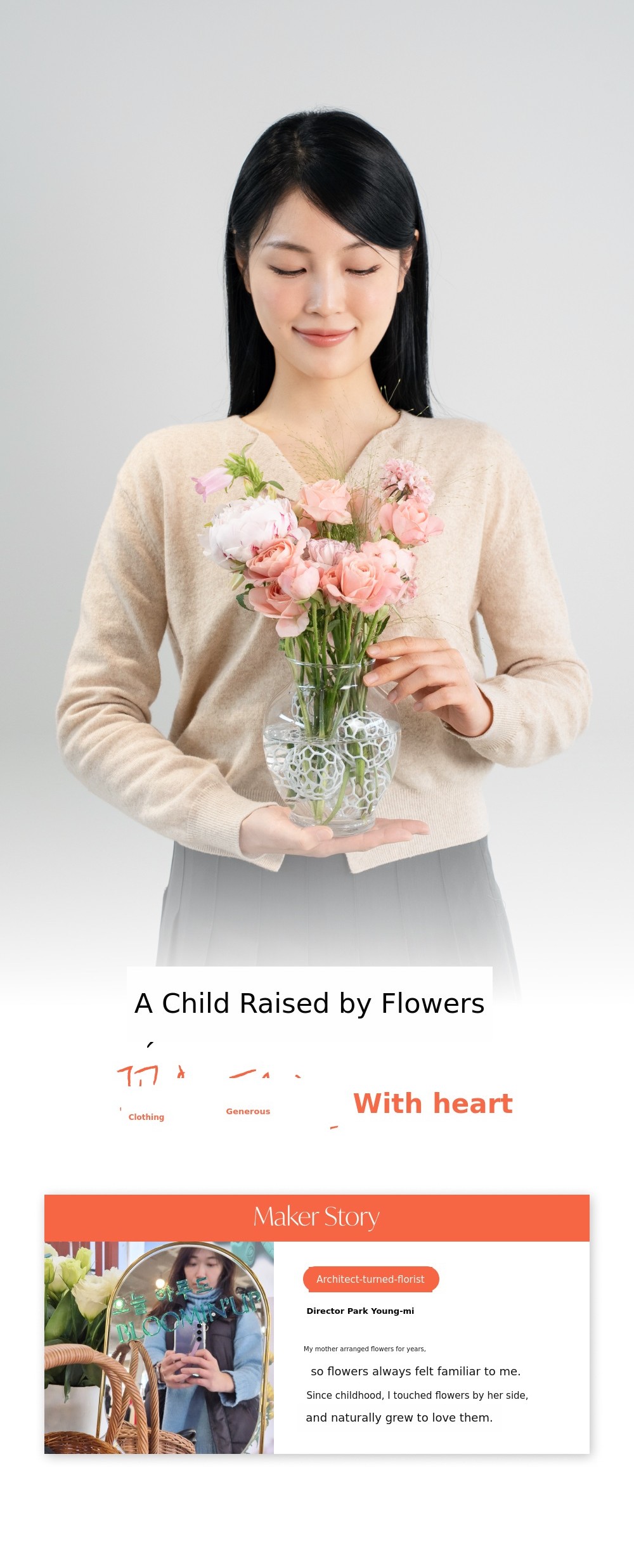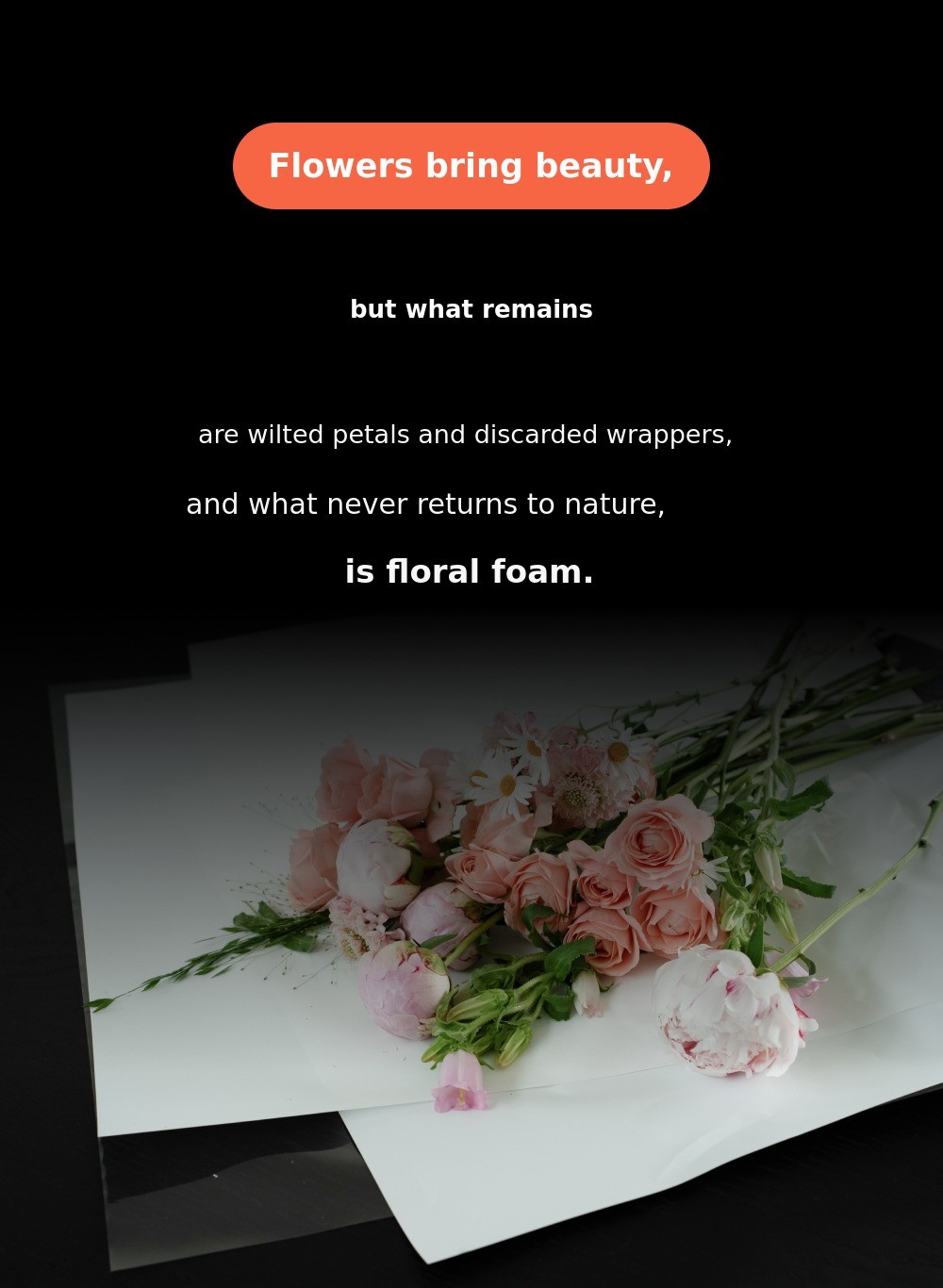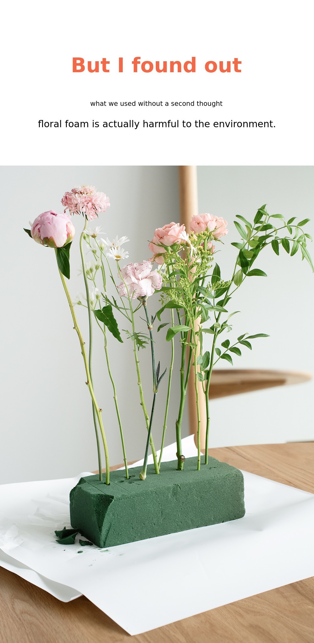I am Youngmi Park, a florist and designer who loves to keep flowers close and enjoy them in daily life. One day, while arranging flowers hoping that their beauty would bring joy to someone, I encountered a strange itch on my hands and countless green sponge particles being discarded. Upon learning that this was the true nature of floral foam—an indestructible plastic and a major source of microplastics—I began to question my work.