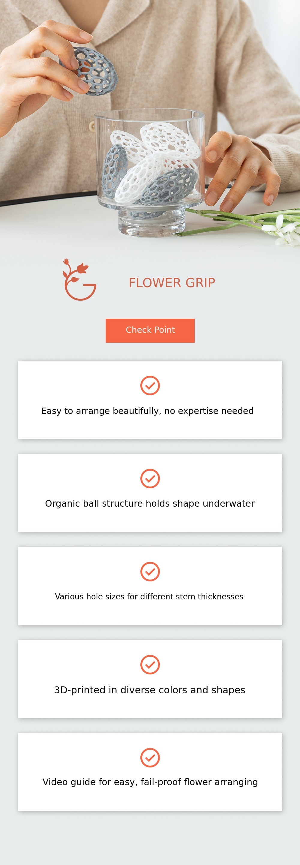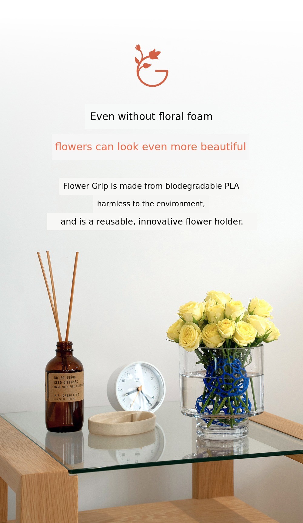 Flower Grip is not just a simple flower arranging tool. Through this product, we aim to solve the problems of floral waste and microplastics caused by the use of floral foam. However, since floral foam has long been considered a given in the flower market, we need support to introduce a new option and turn it into action.