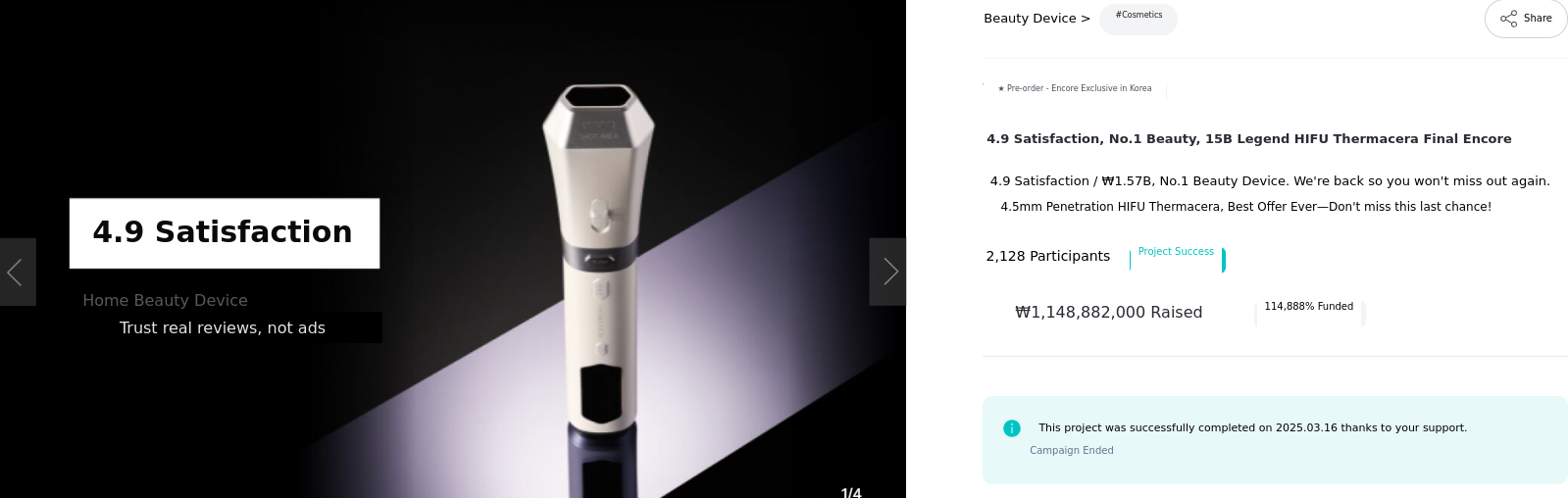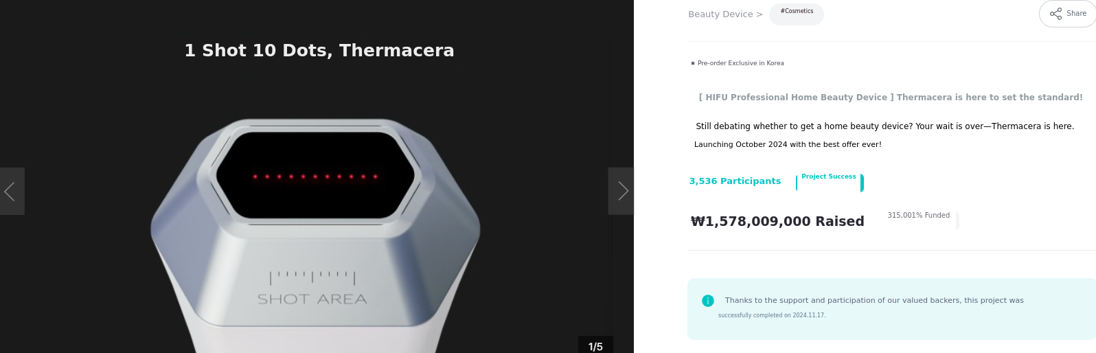Even with Thermacera HIFU Shot, we achieved a total of 2.7 billion KRW in just two rounds of funding, with overwhelming support from our backers—1.57 billion KRW in the first round and 1.15 billion KRW in the second—making us number one in the Wadiz beauty category.