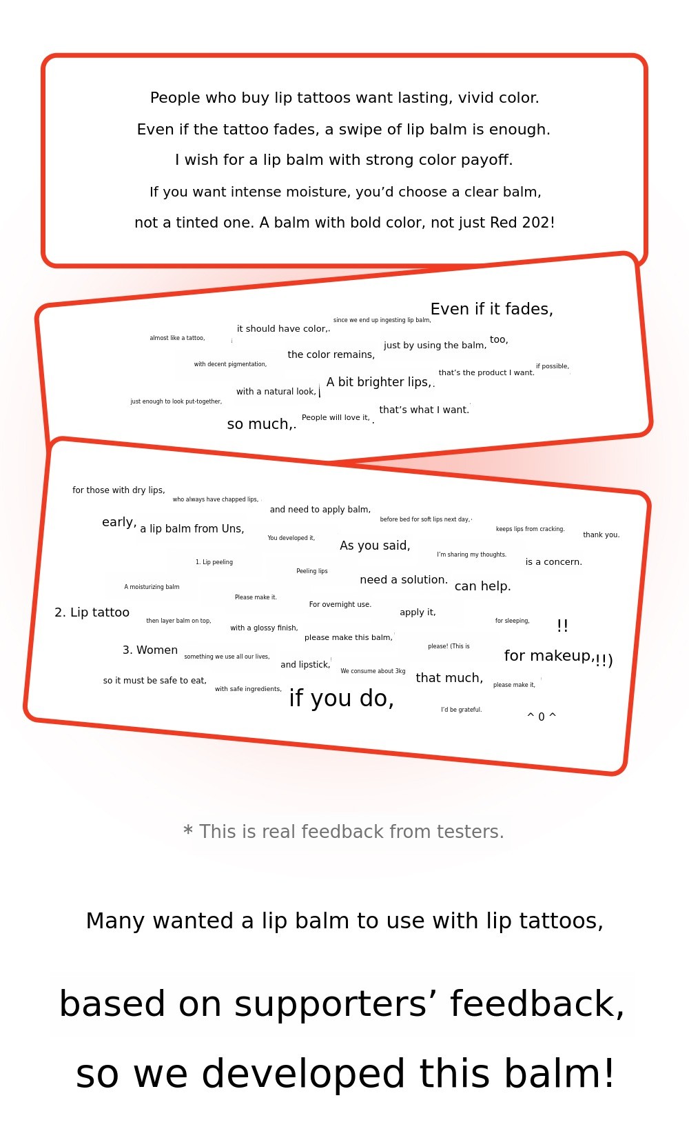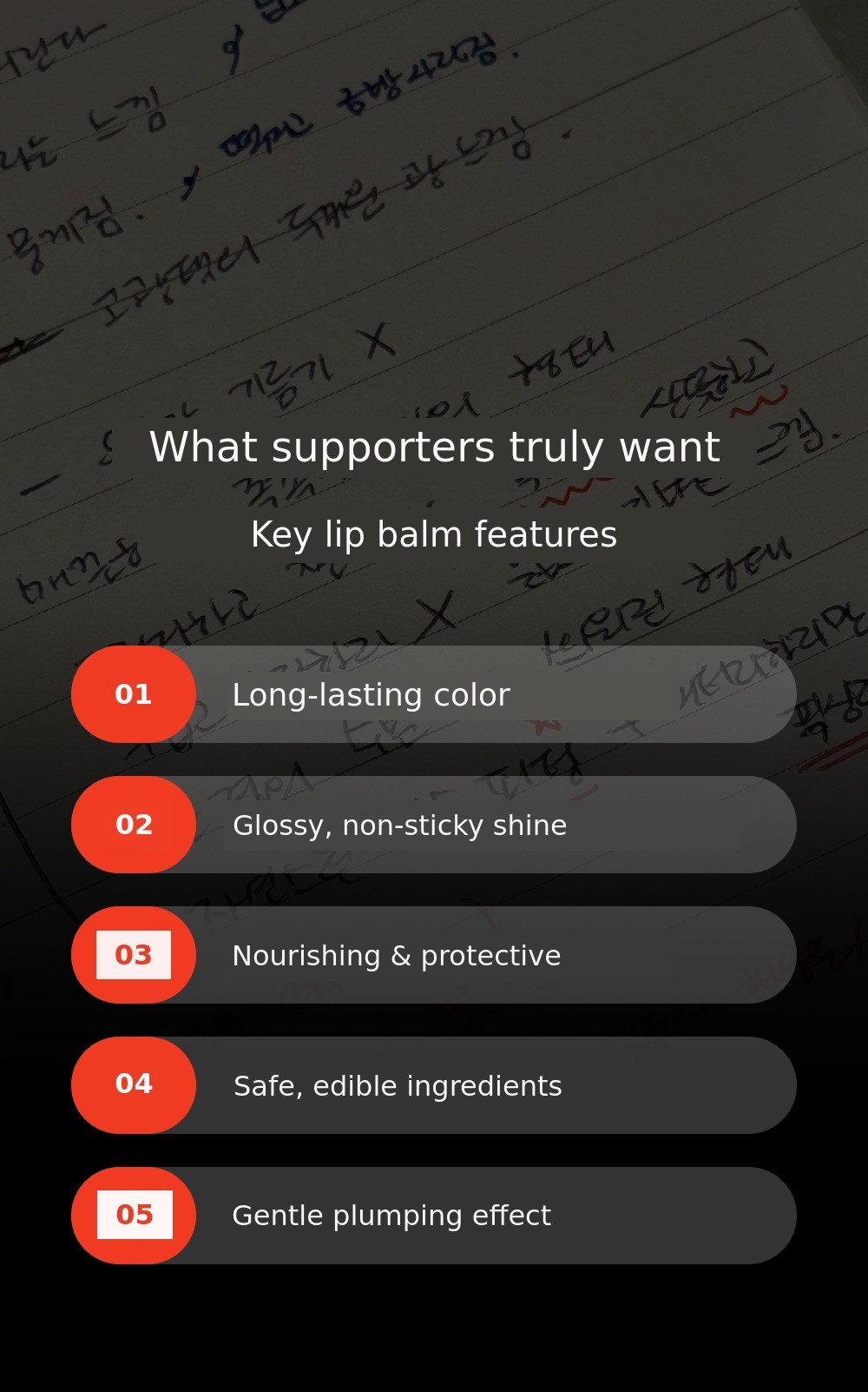 I believe Wadiz is the only channel where we can communicate most naturally with our customers and exchange opinions closely. Even without brand recognition, we chose Wadiz because we wanted to grow together with supporters who provide generous feedback and encouragement. Following the watercolor lip tattoo, we hope you will also show lots of love for the Glow Lip Fit Balm :)