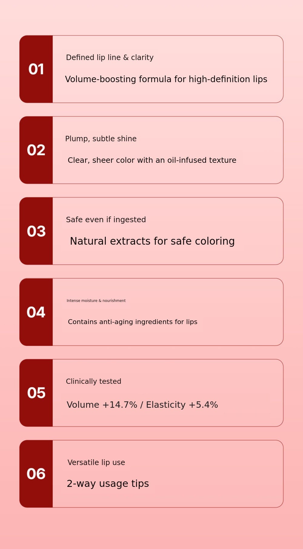 It delivers both glossiness and brightness without ruining the original color of the lipstick.The lip line looks more defined, making your lips appear more dimensional.