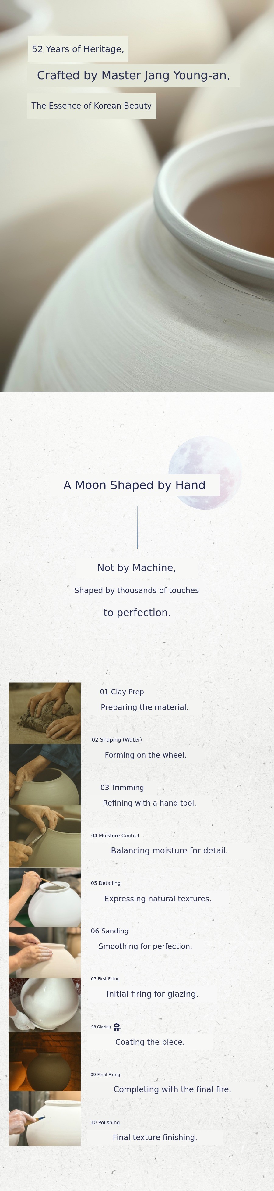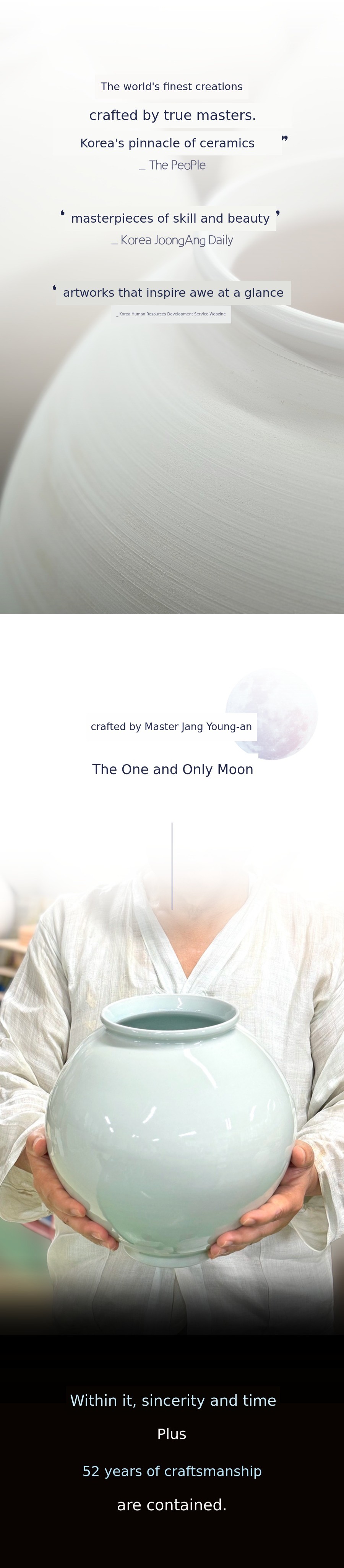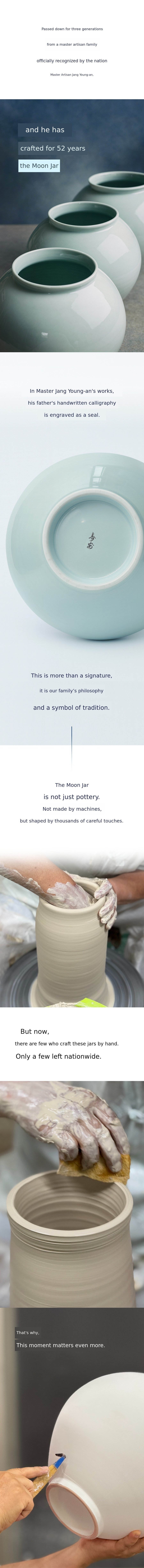 Master Jang Young-an is a Korean pottery master who has reproduced the mysterious celadon green of Goryeo celadon and the beauty of Joseon white porcelain for over 50 years. The jade moon jar born from his hands is not just a beautiful piece of pottery, but a vessel containing hundreds of years of history,the culmination of traditional techniques and craftsmanship.
