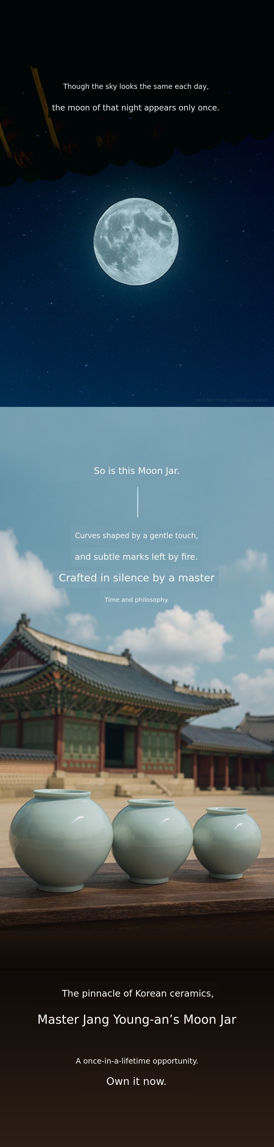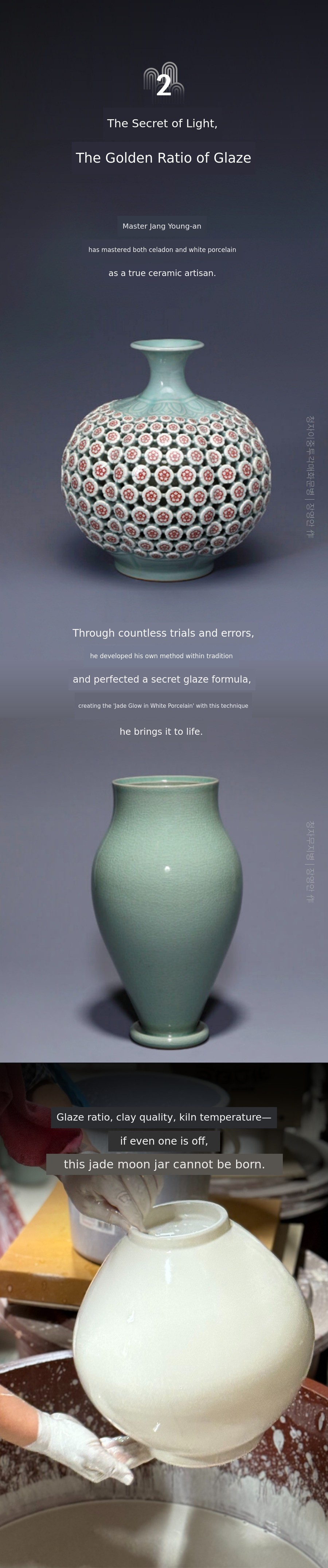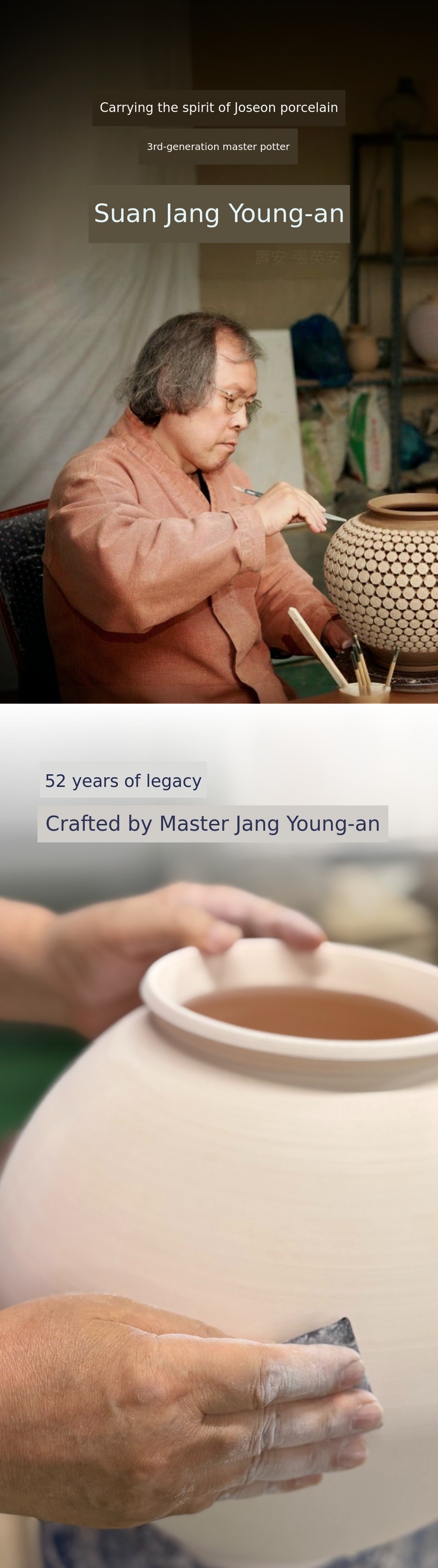Master Jang Young-an is a Korean pottery master who has reproduced the mysterious celadon green of Goryeo celadon and the beauty of Joseon white porcelain for over 50 years. The jade moon jar born from his hands is not just a beautiful piece of pottery, but a vessel containing hundreds of years of history,the culmination of traditional techniques and craftsmanship.