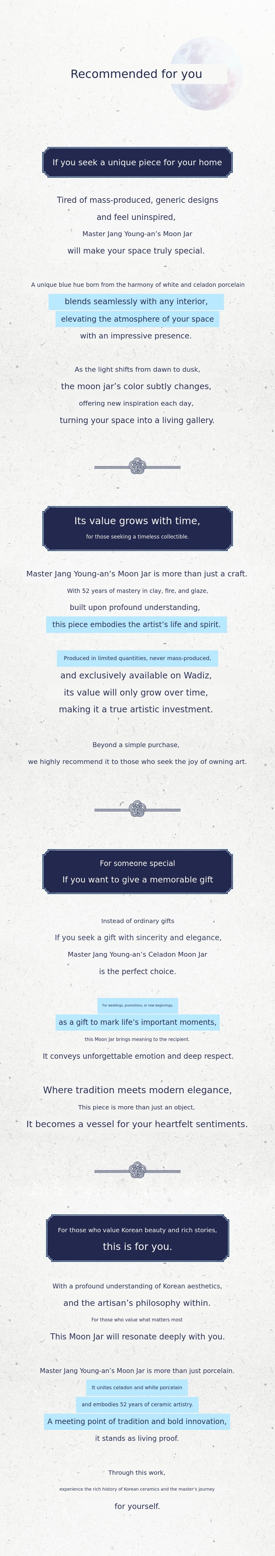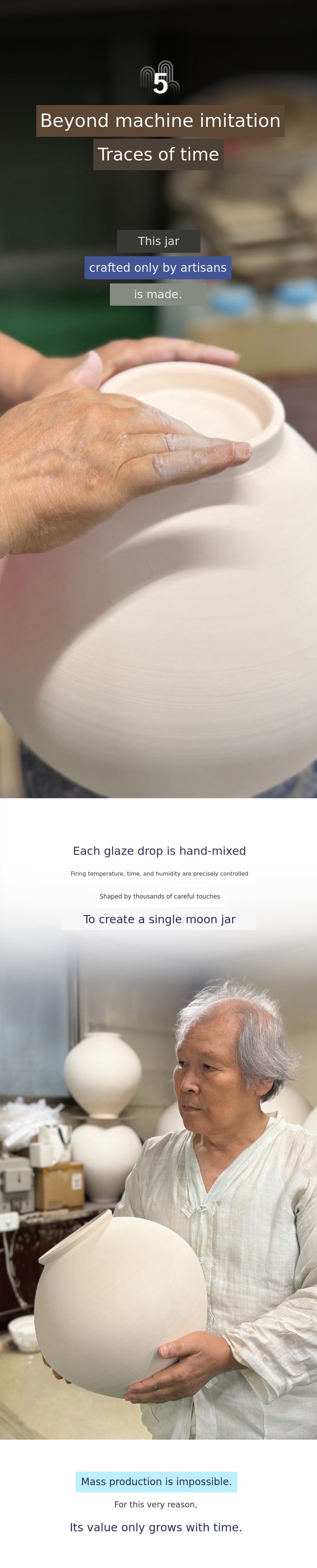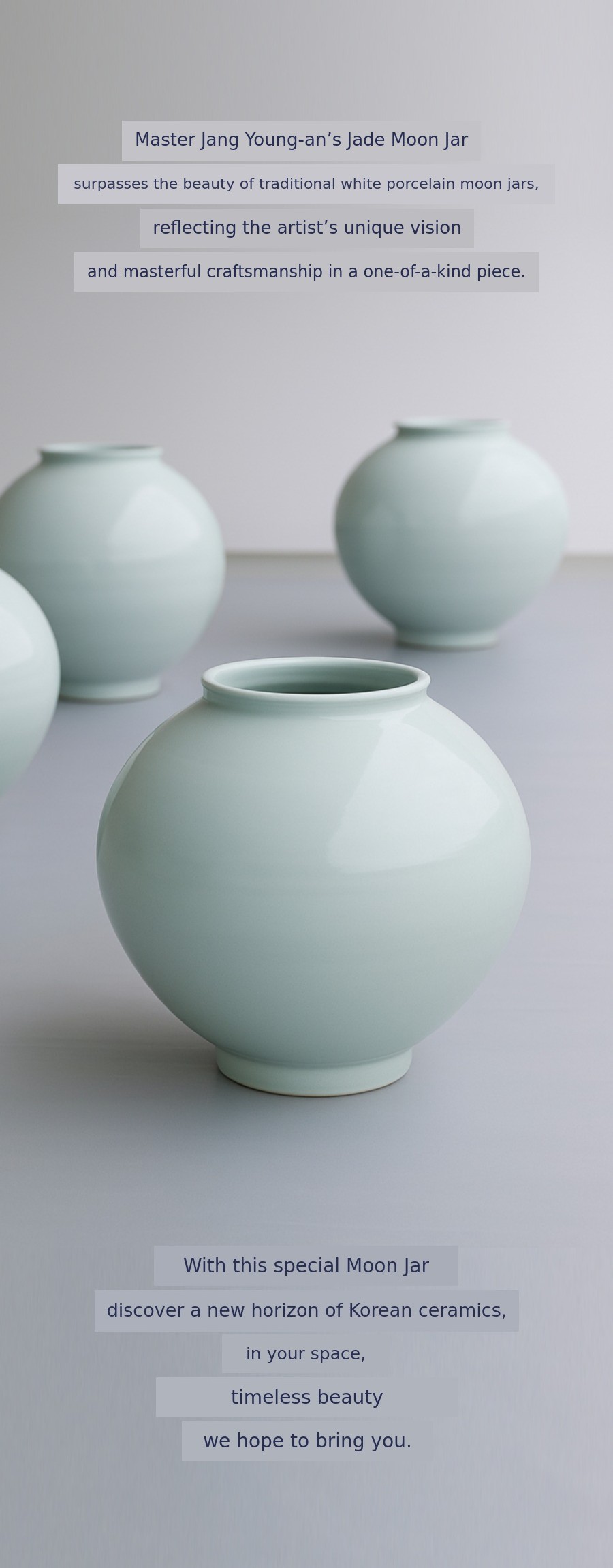 We wanted this precious value to be experienced not only by a few collectors or museums, but by more people in their daily lives. With this in mind,we are bringing tradition into modern life. We have chosen the best method. The jade moon jar crafted by the master possesses a profound beauty that brings peace to the heart just by looking at it. This serene beauty, untouched by trends, will permeate your space and elevate the quality of your daily life. Thank you.